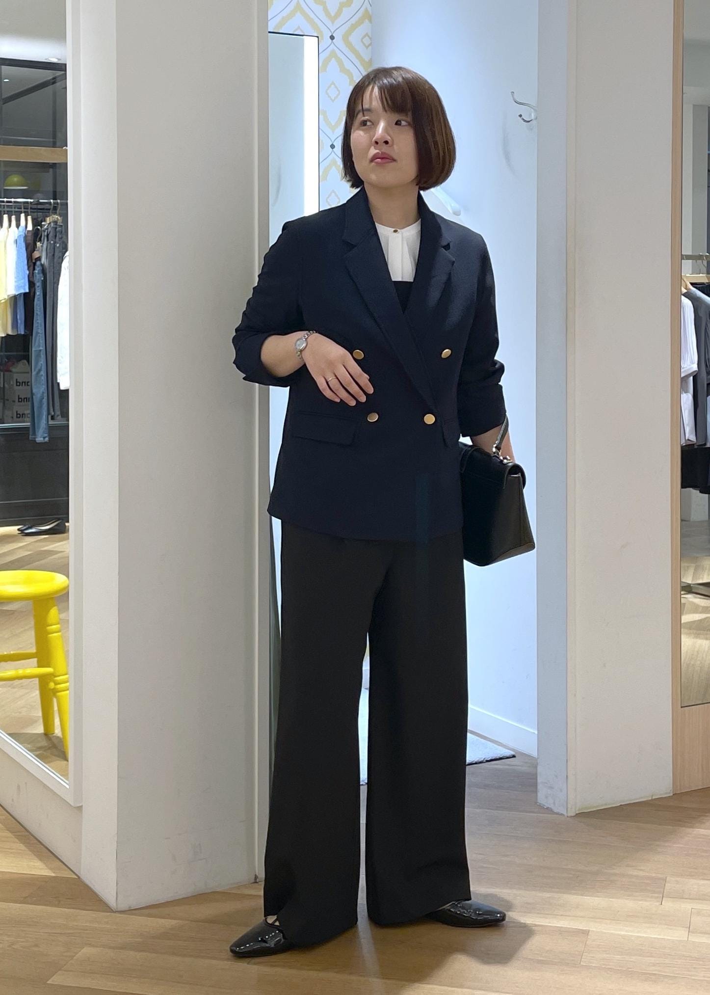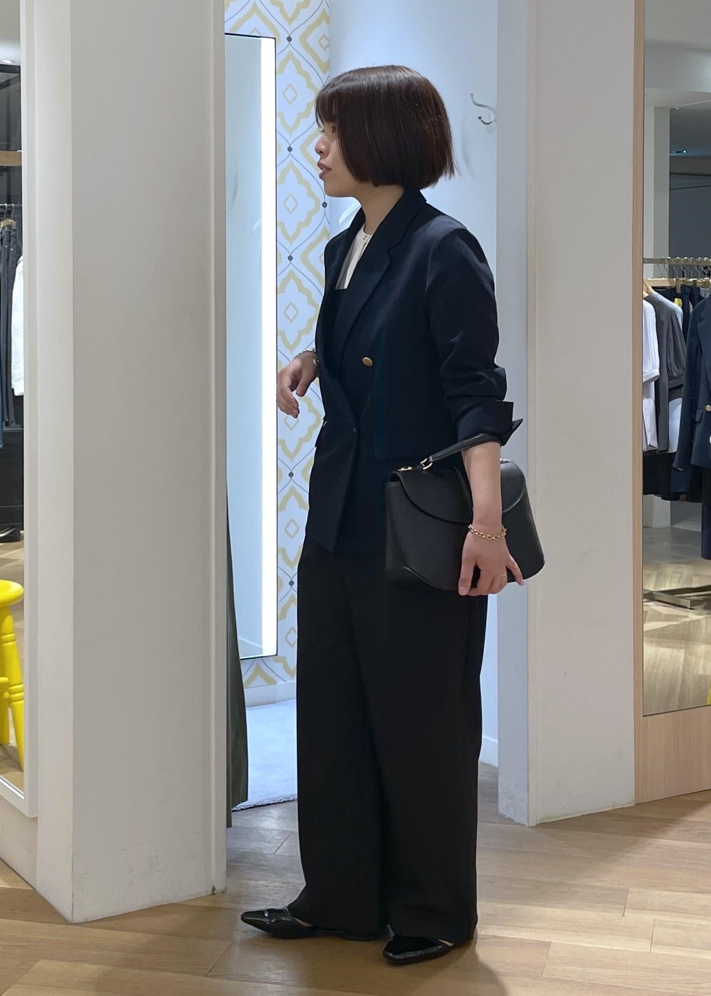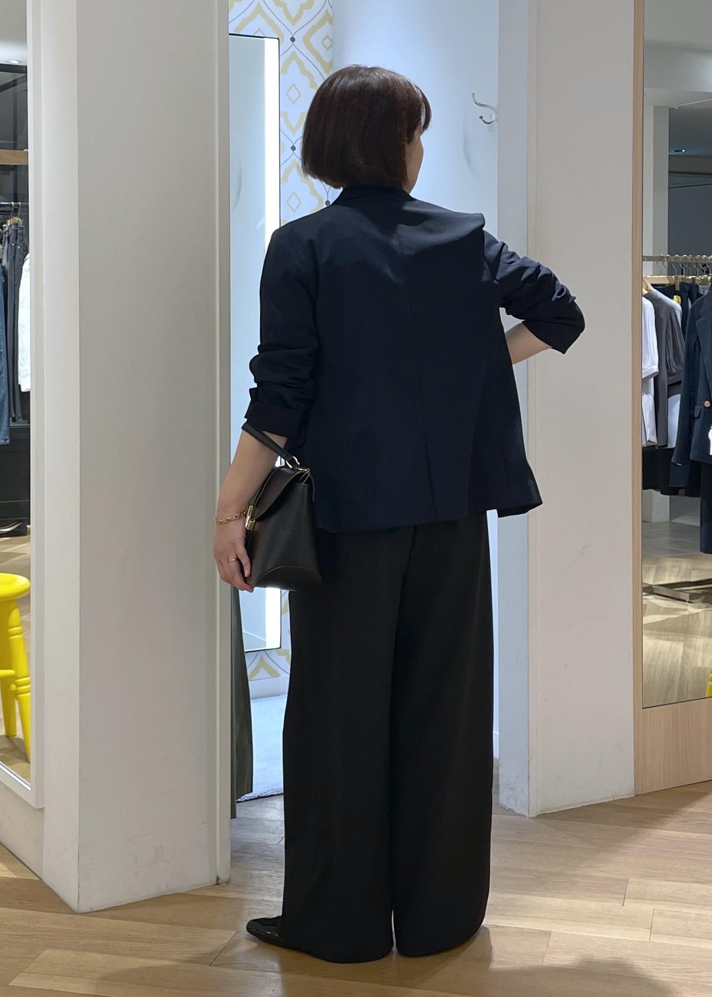 オールインワンのインナーには袖プリーツのブラウスを合わせて、ジャケットを脱いでもきちんとお洒落見えが叶うスタイルに◎