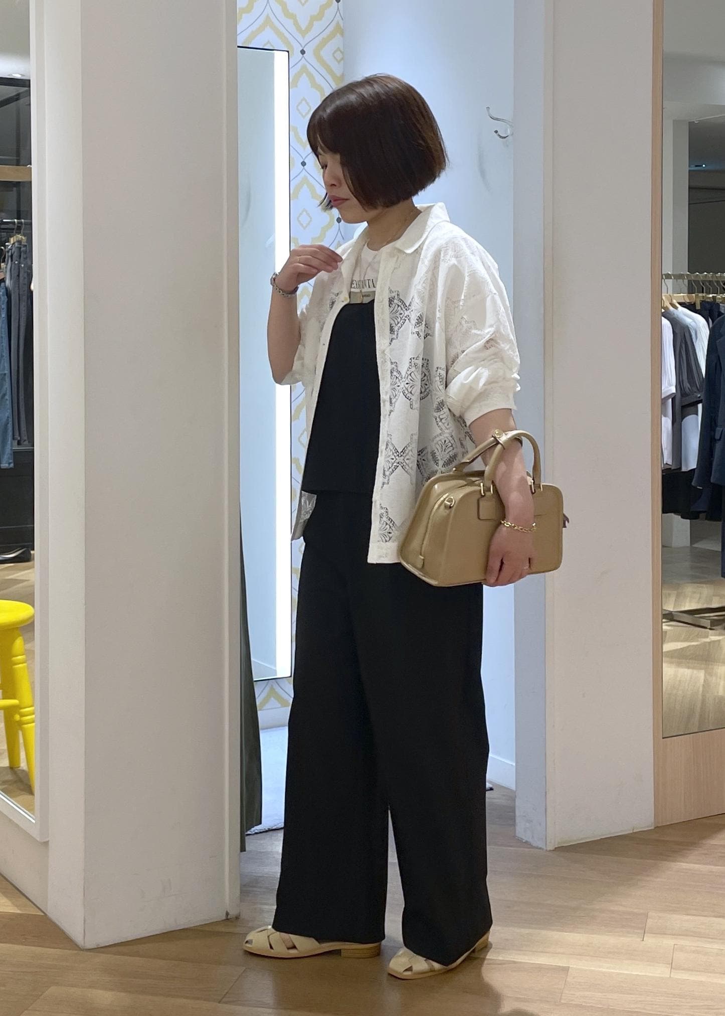 ブラックのオールインワンにレースシャツを羽織った、トレンド感ある軽やかなカジュアルコーデです!