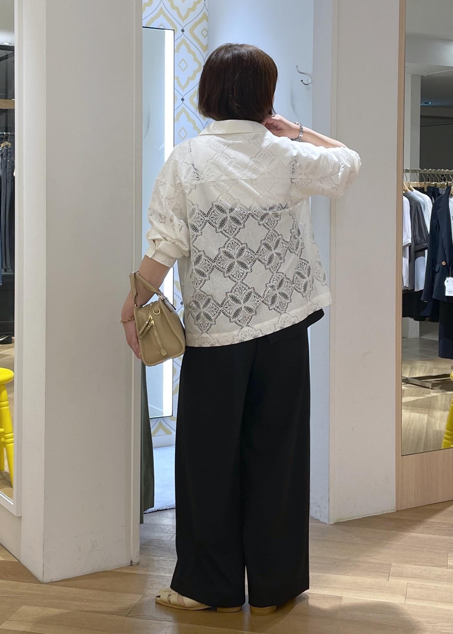 オールインワンのレースシャツコーデ