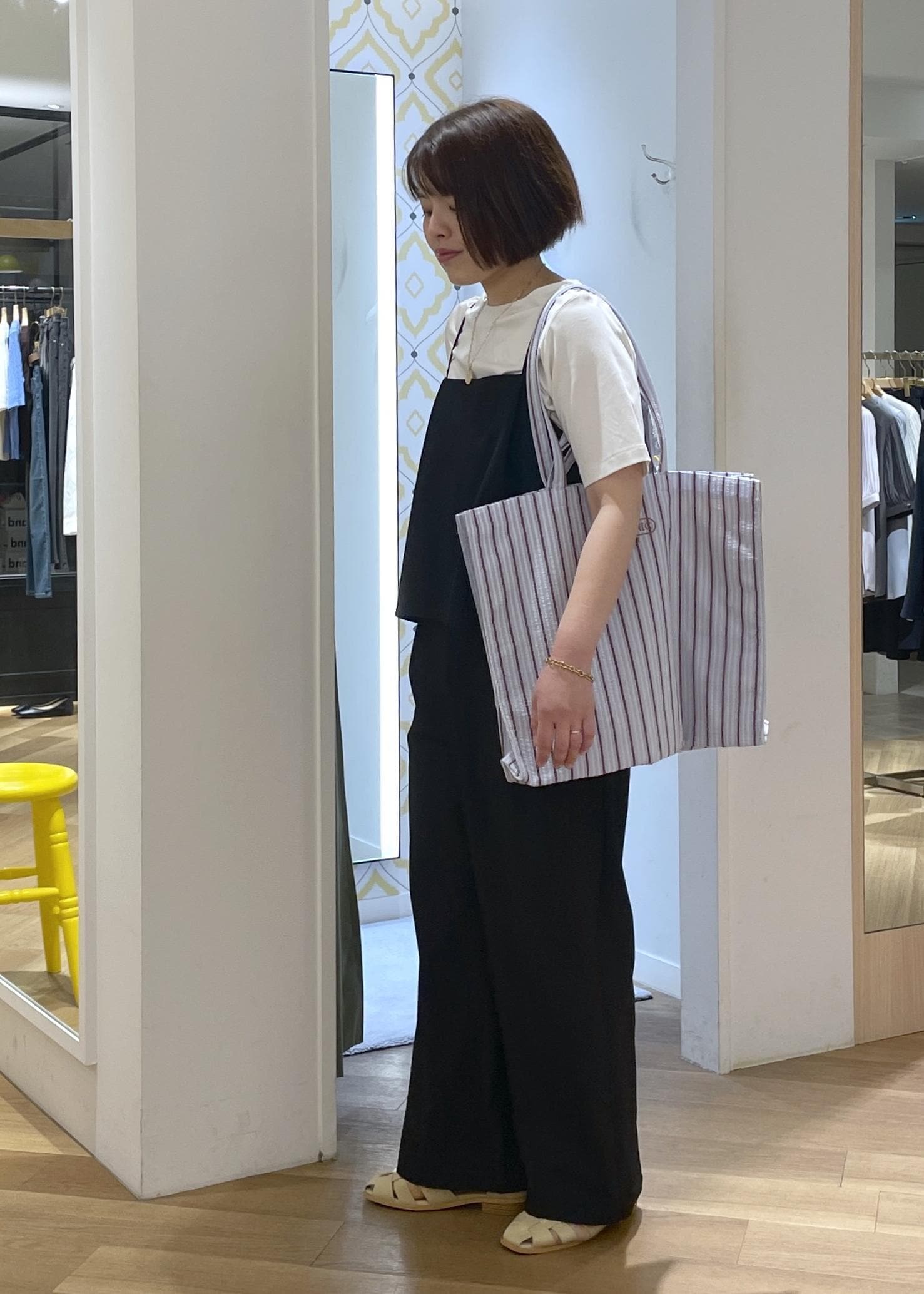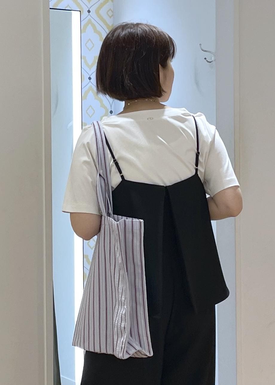 バッグはストライプのトートバッグを合わせて、シンプルスタイルのアクセントに◎