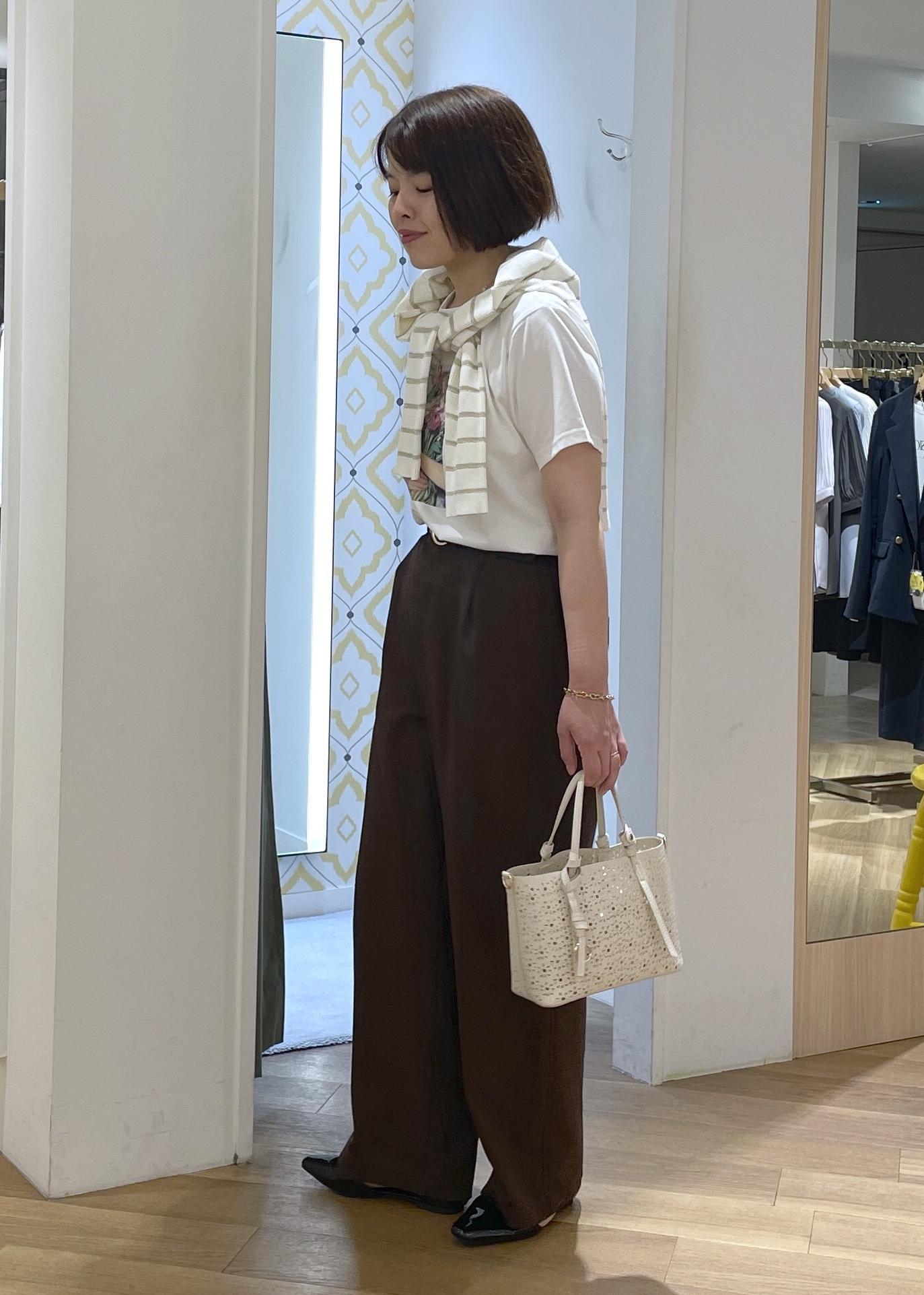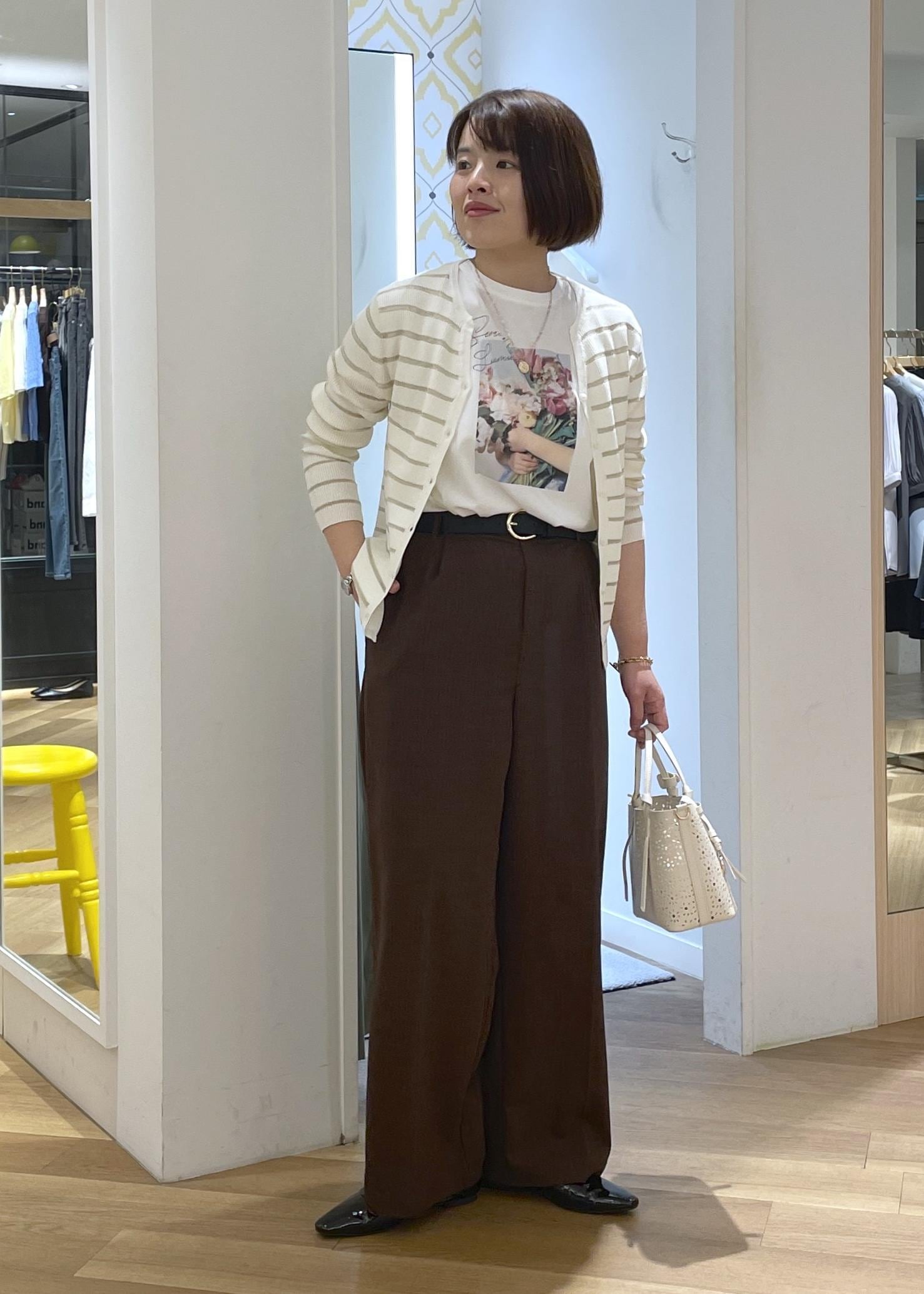 トレンド感のあるブラウンのワイドパンツにフォトプリントのTシャツを合わせた、リラックス感のある大人カジュアルコーデです!