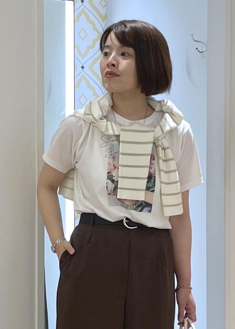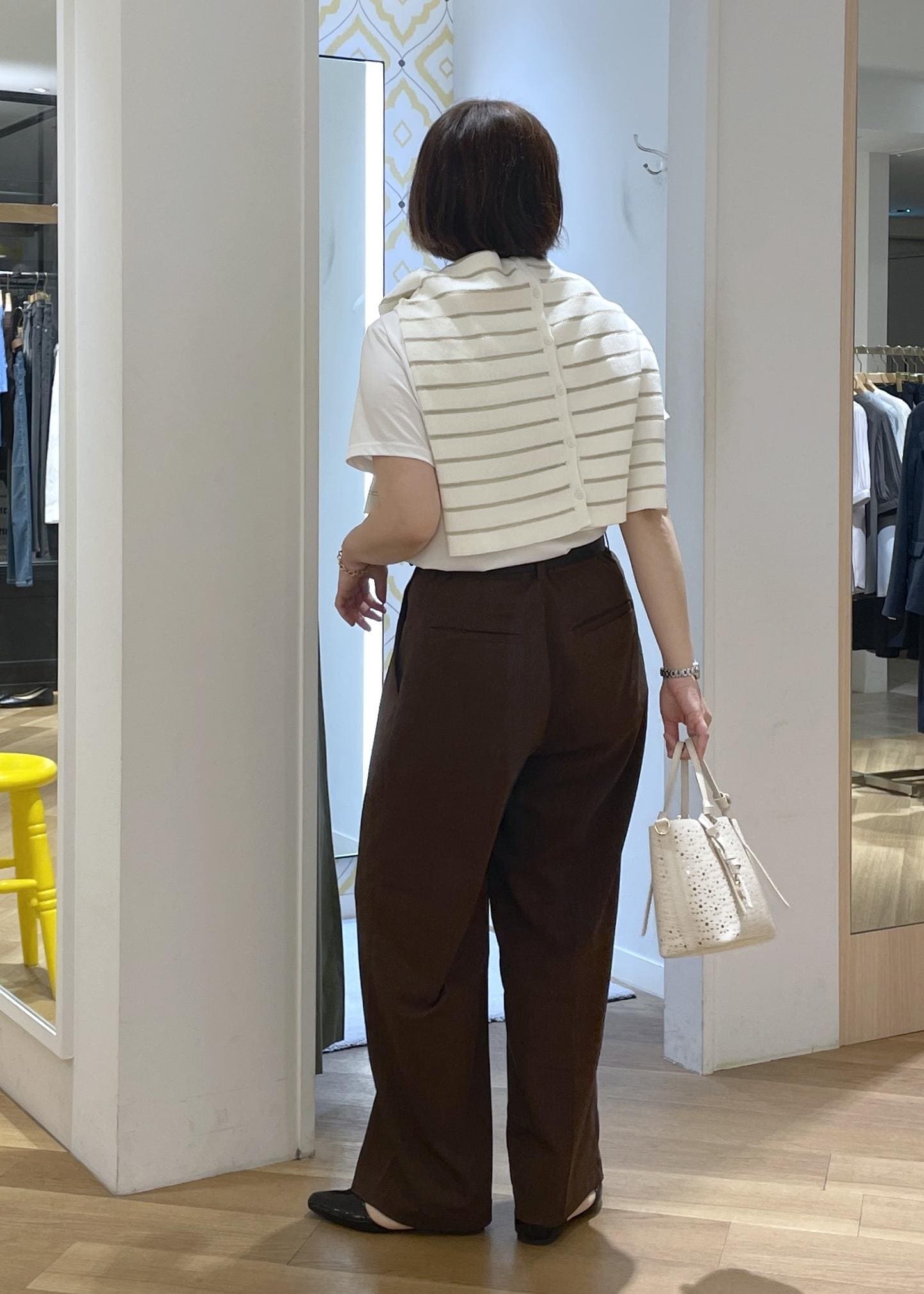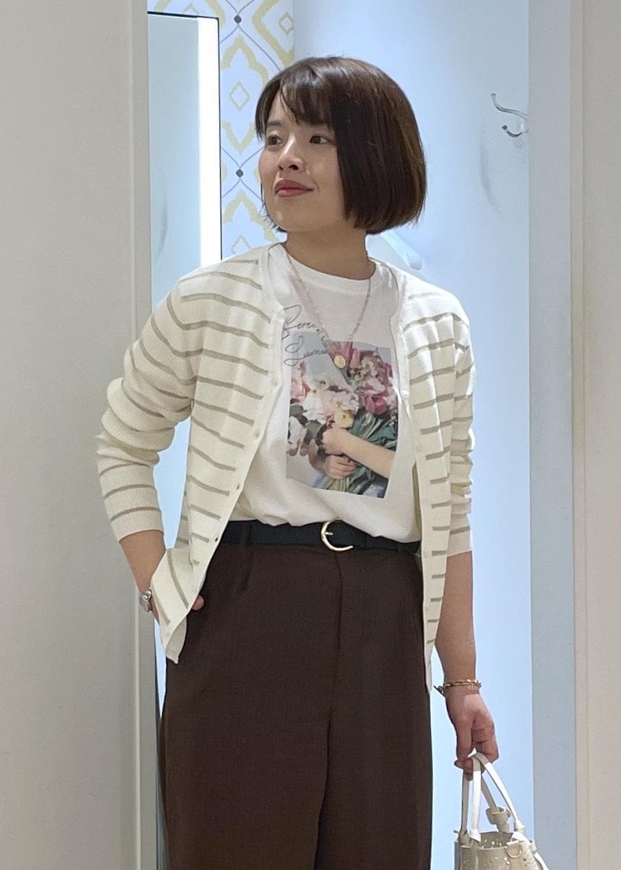 シアーボーダーのカーディガンを肩掛けしてシンプル過ぎないスタイルに◎