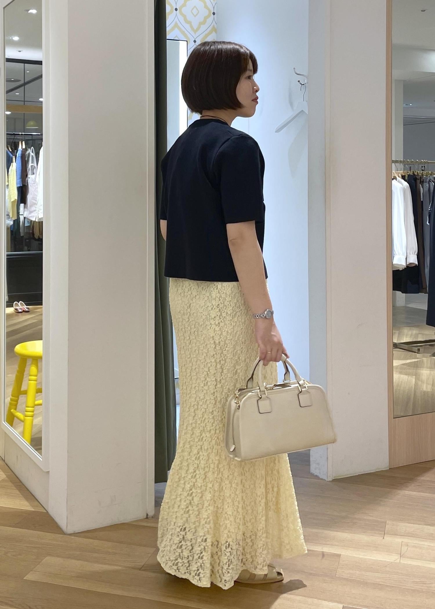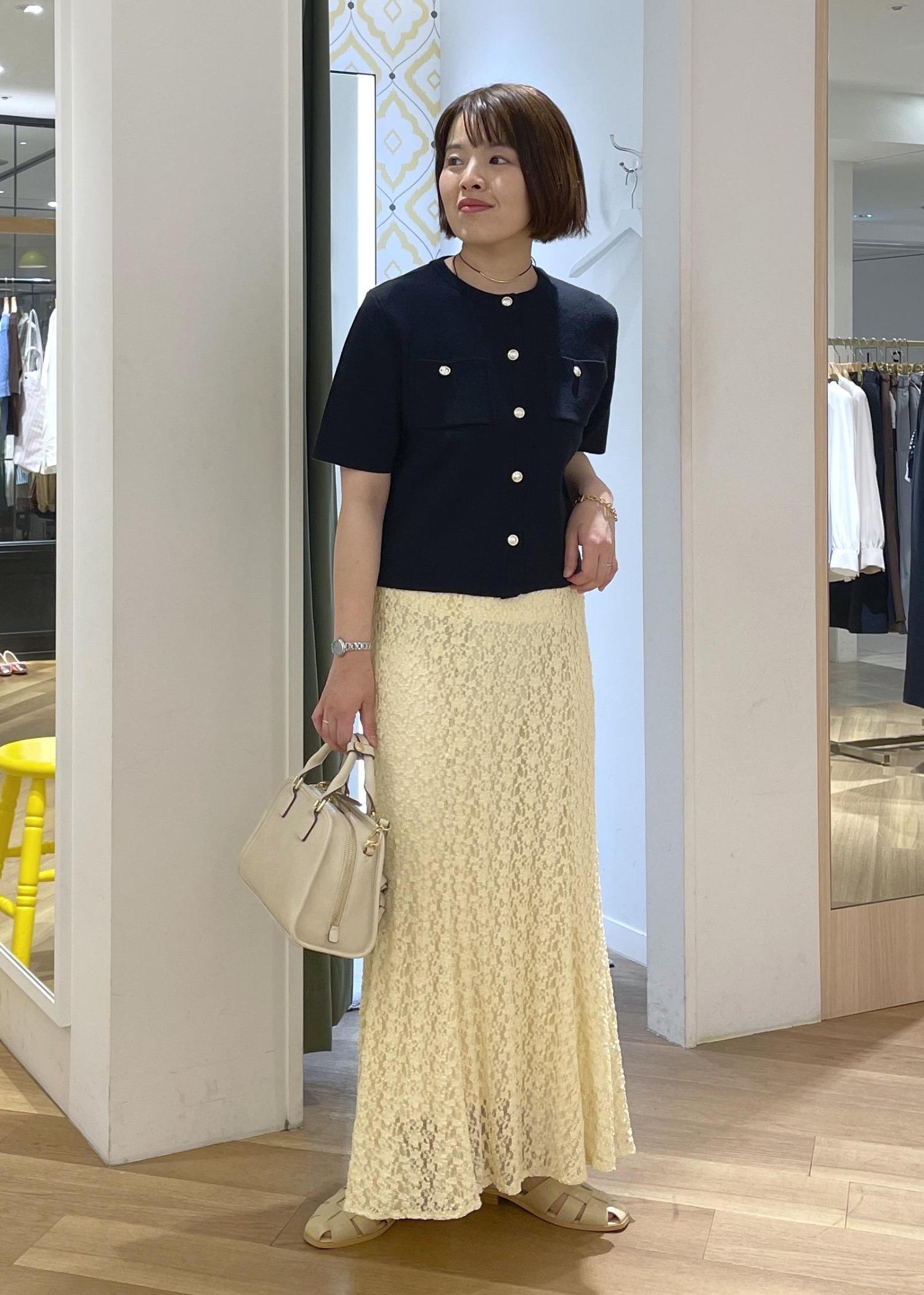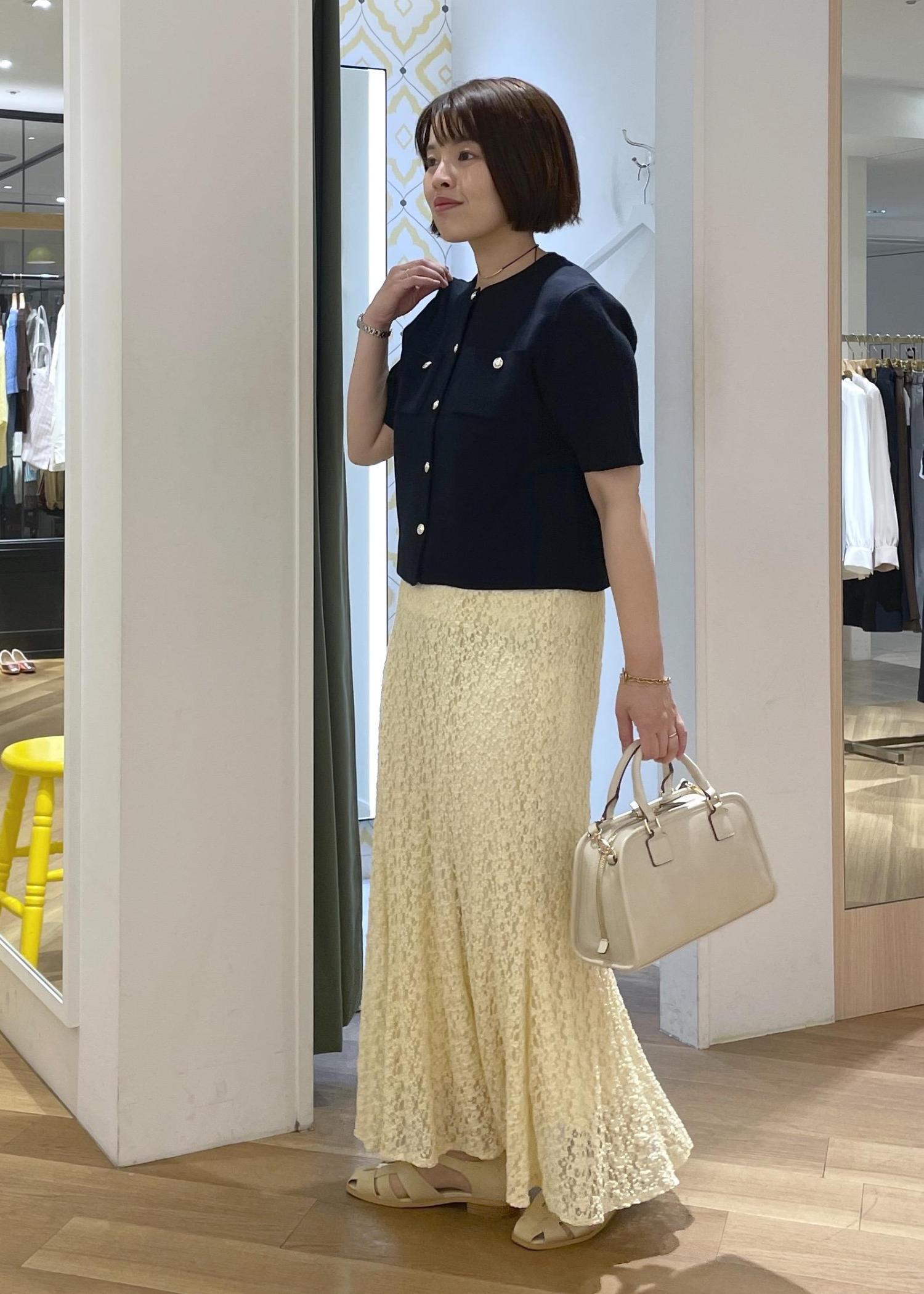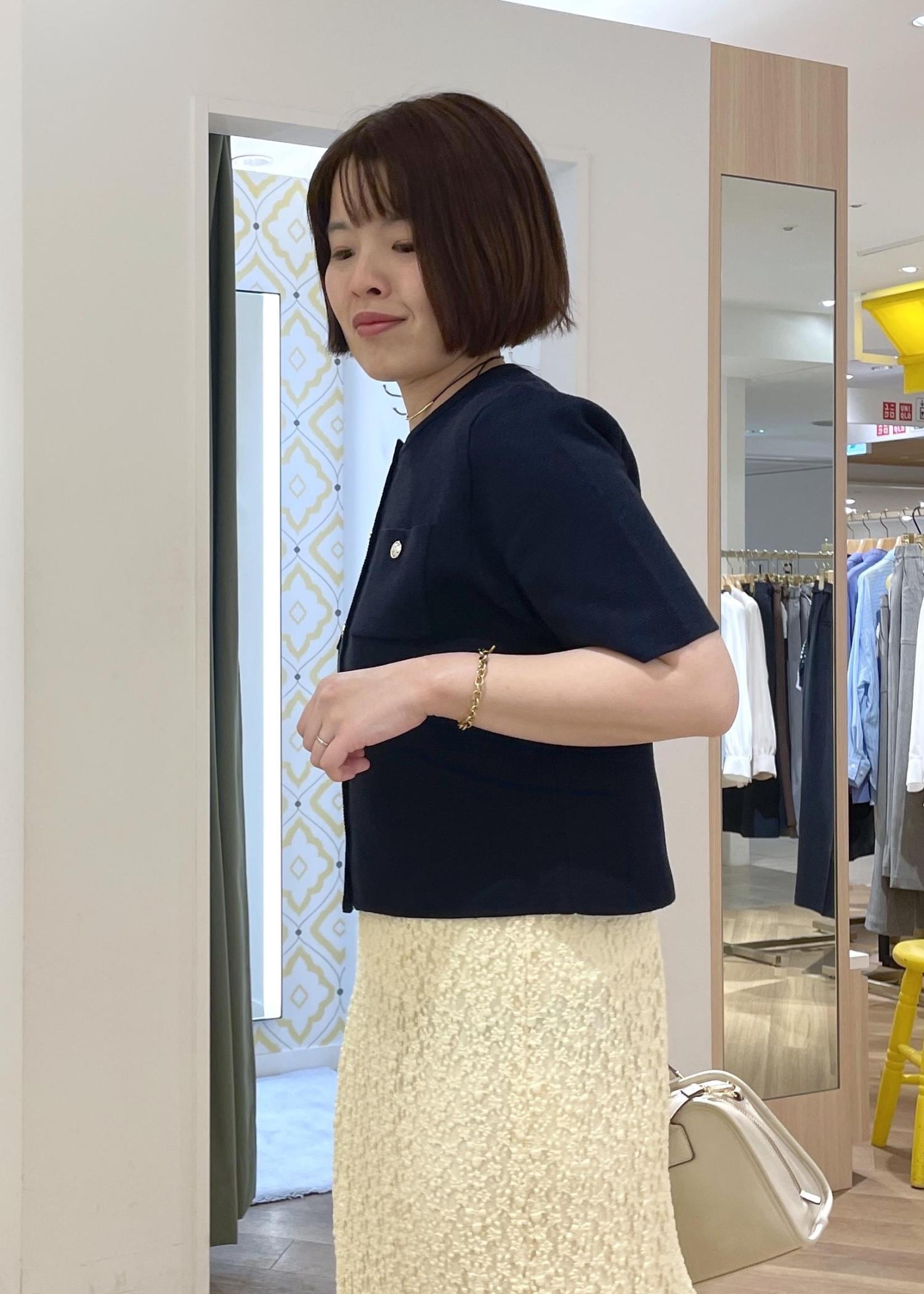 カーディガンはネイビー、スカートはクリームのカラーを合わせて、メリハリを付けて大人っぽくまとめました◎