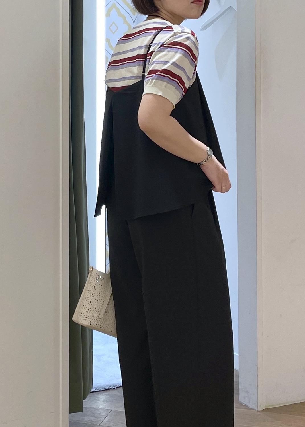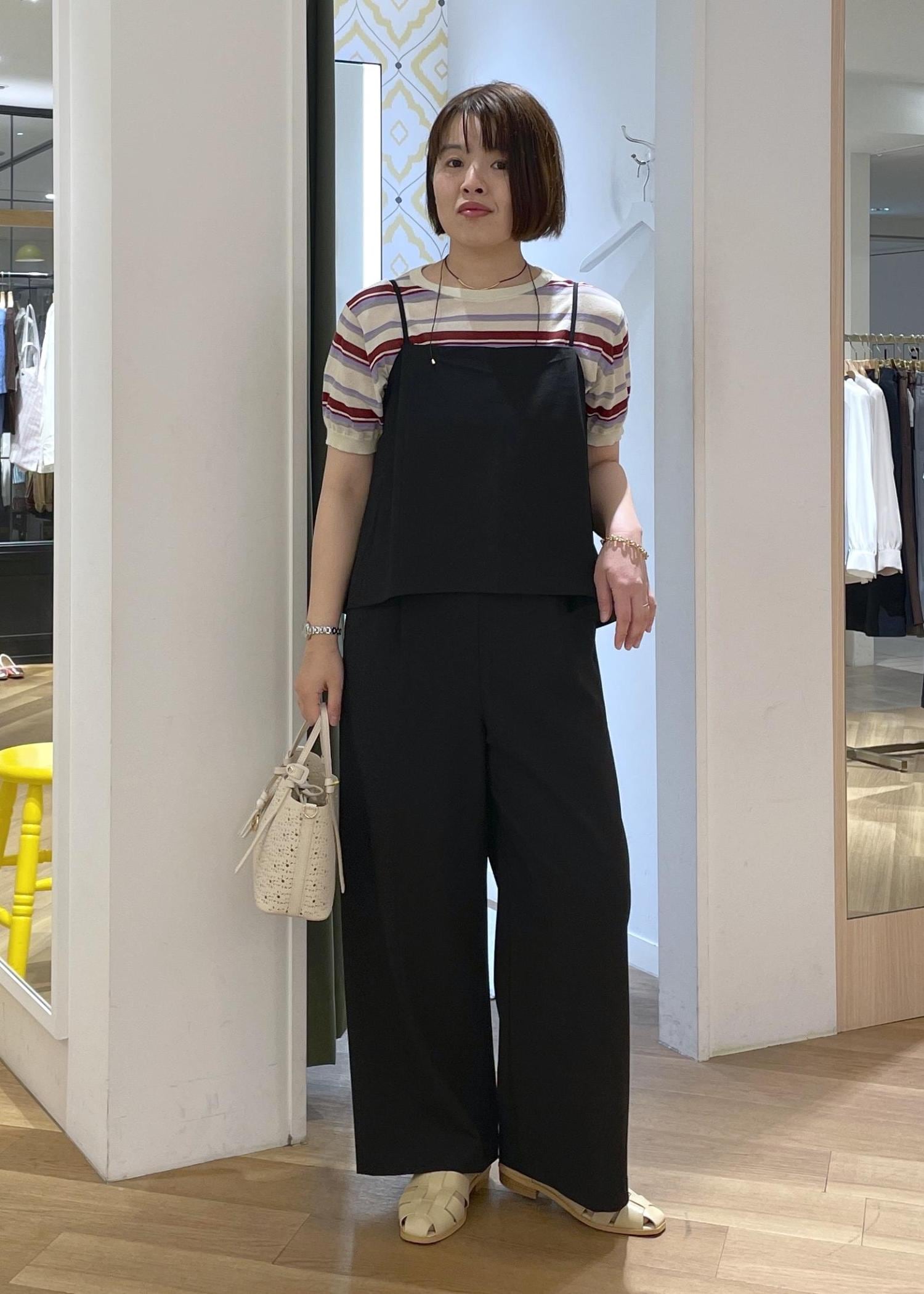 きれい見えも叶うブラックのオールインワンに、マルチボーダーのニットを合わせた、大人カジュアルコーデです!
