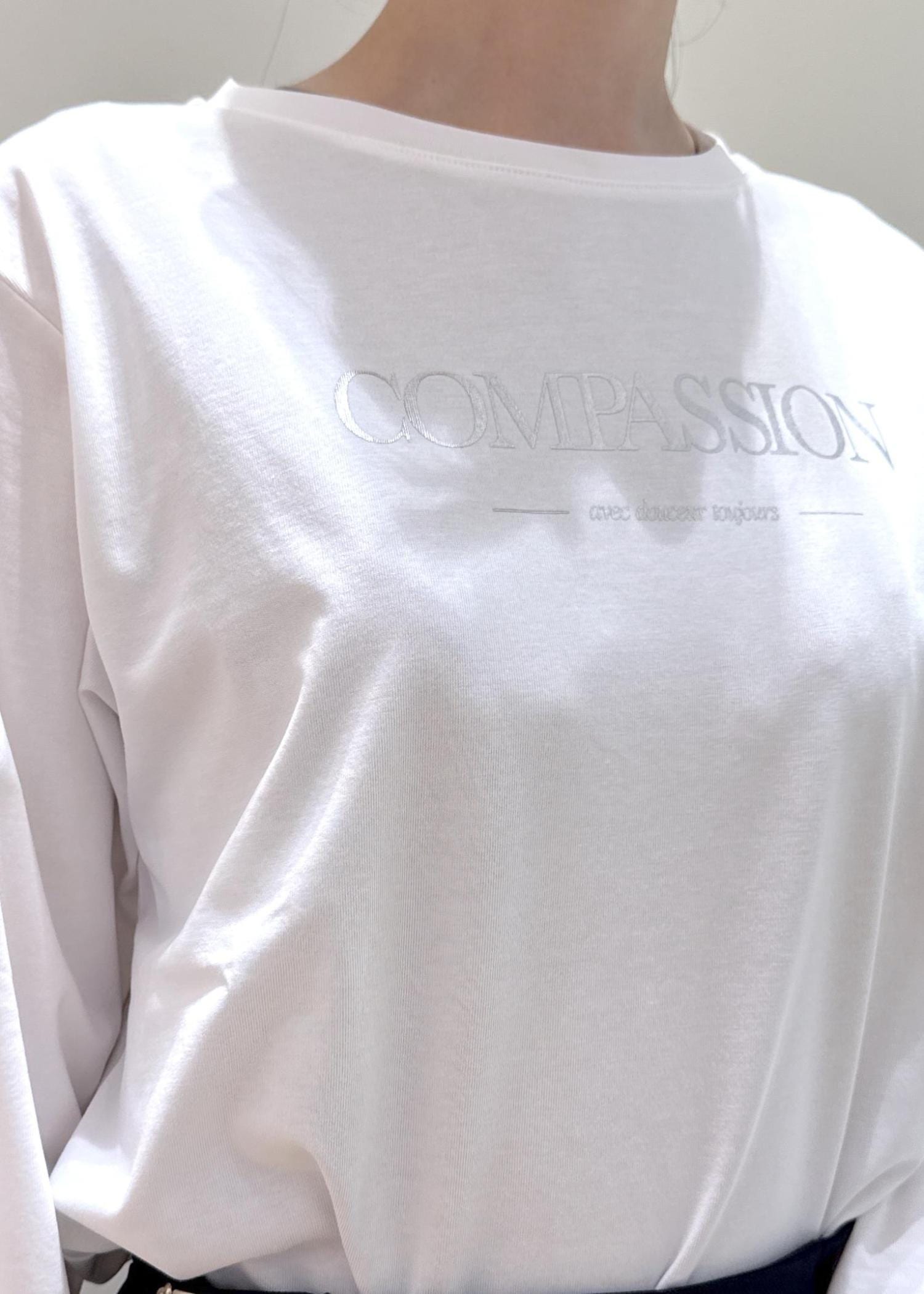 フリルブラウスが引き立つように中はシンプルなロゴロンTをチョイス。