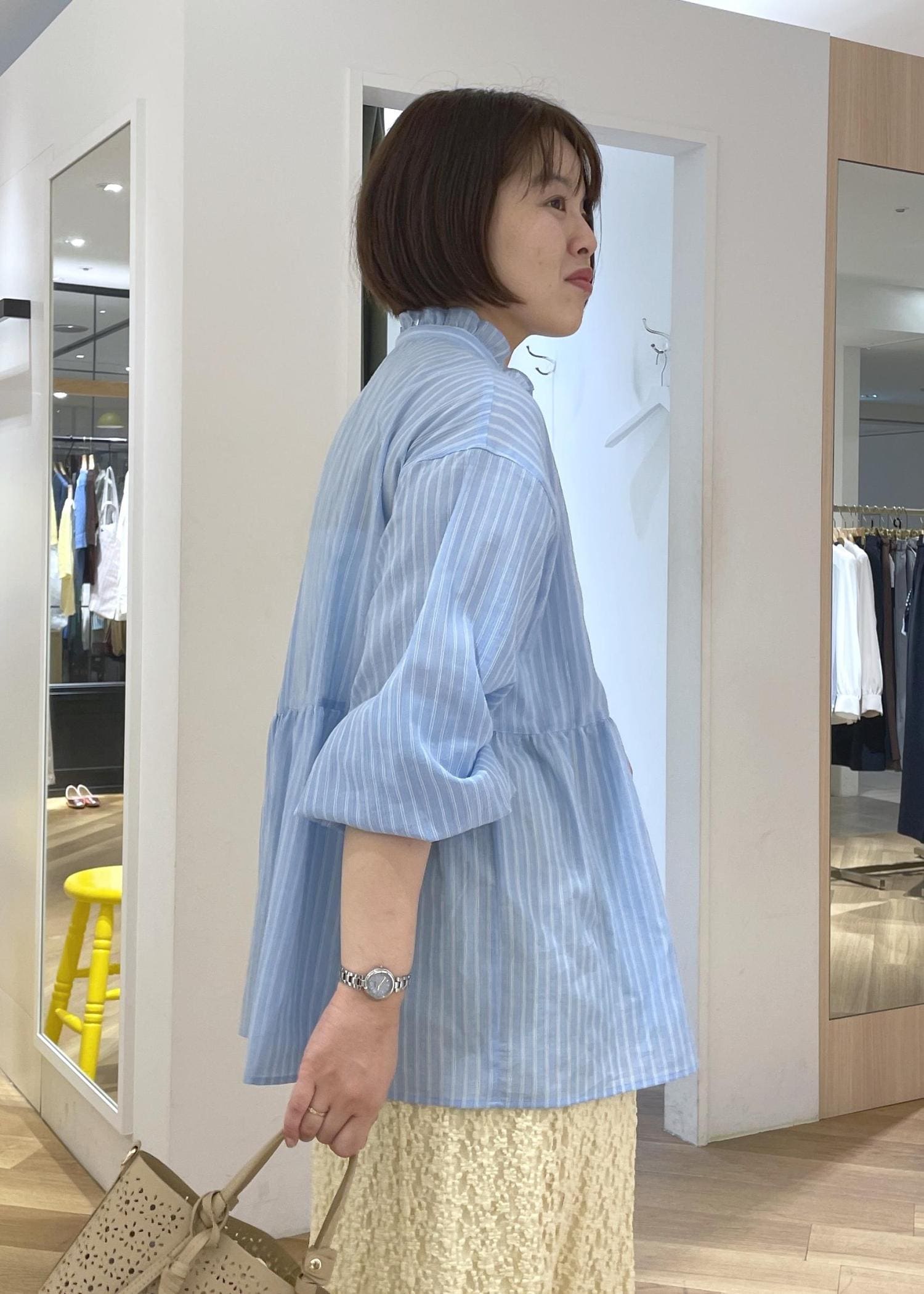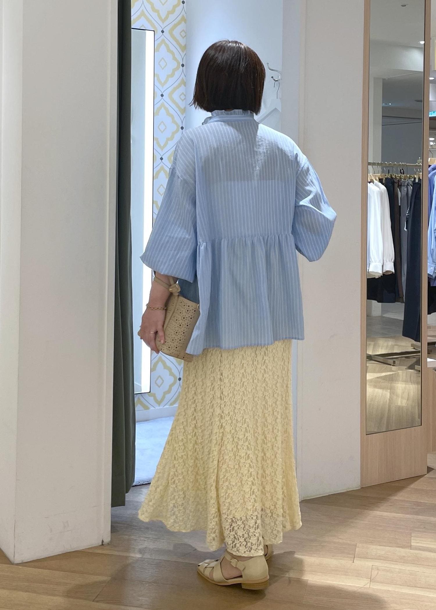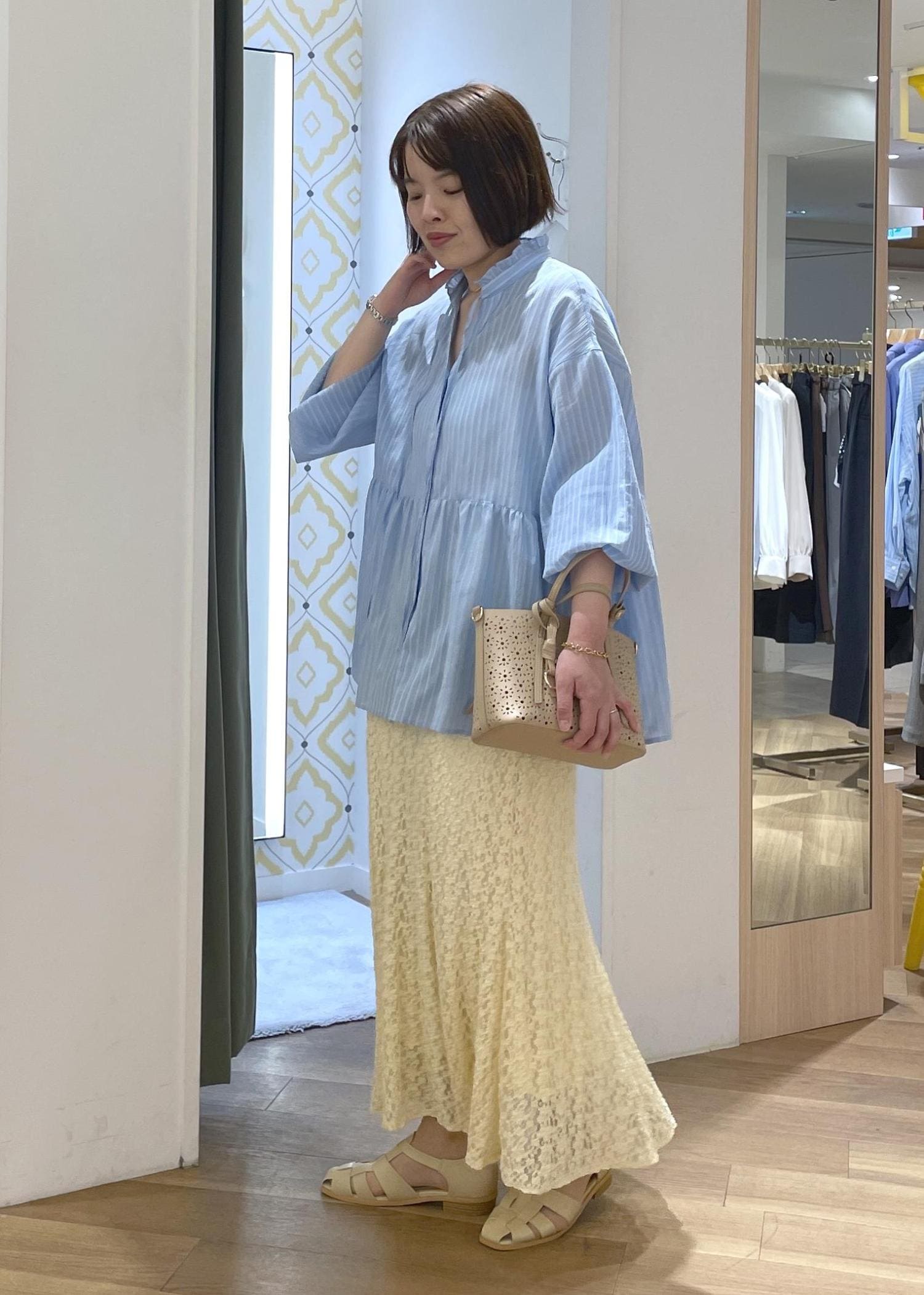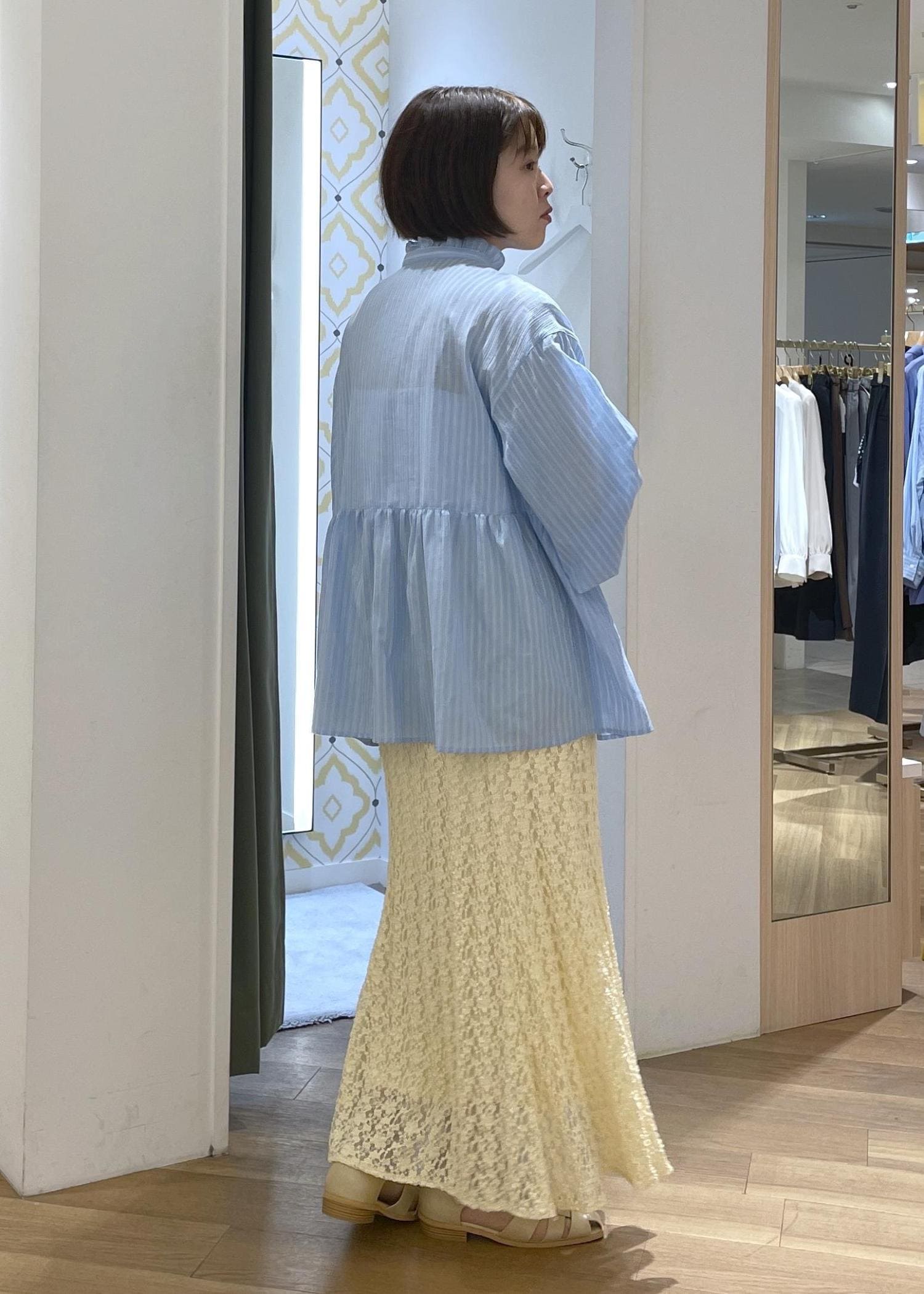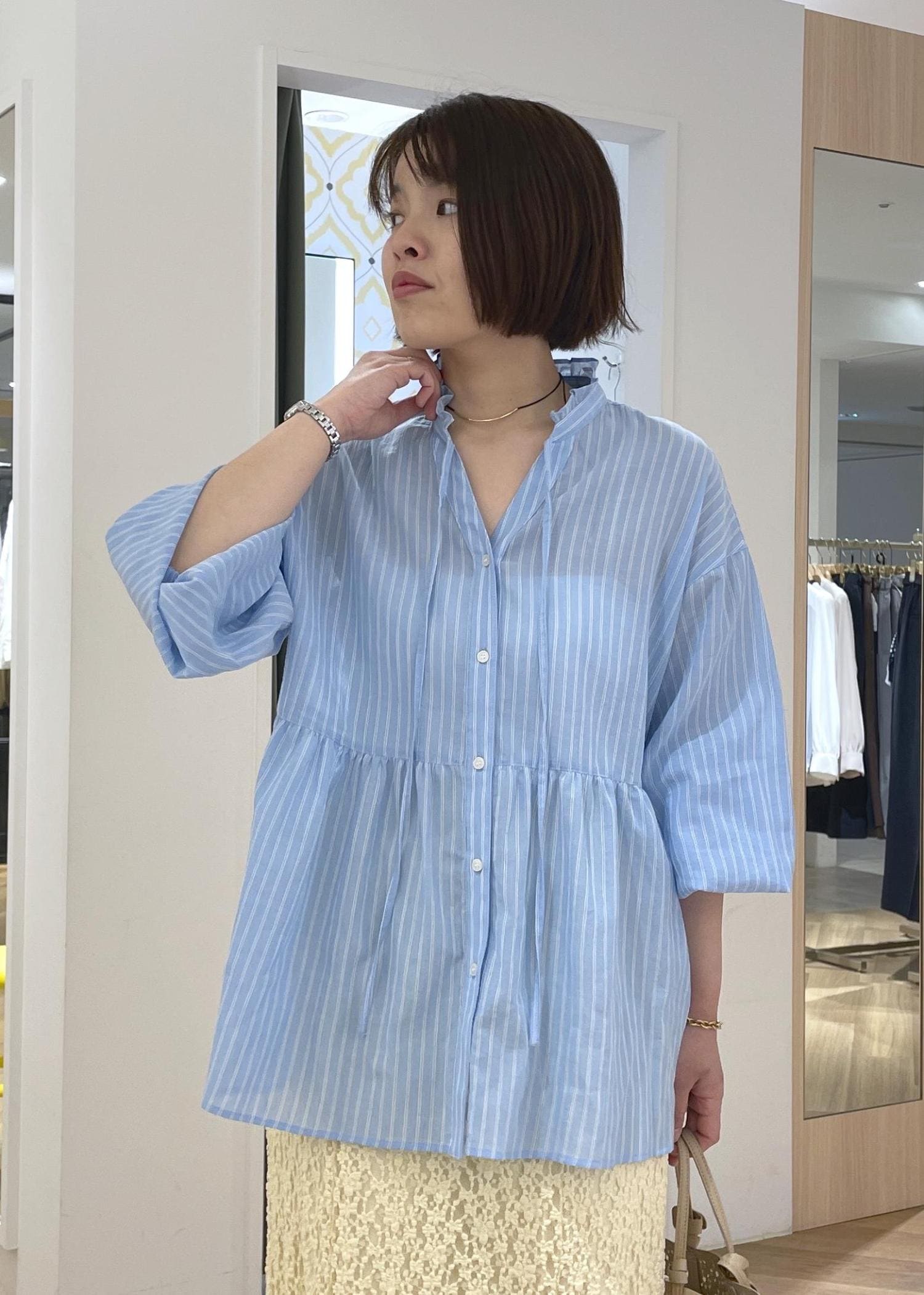 軽く爽やかなストライプシャツにレースのスカートを合わせた、リラックス感のあるきれいめスタイルです!