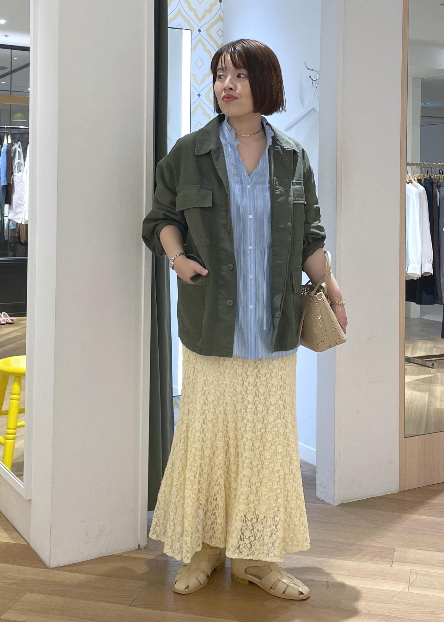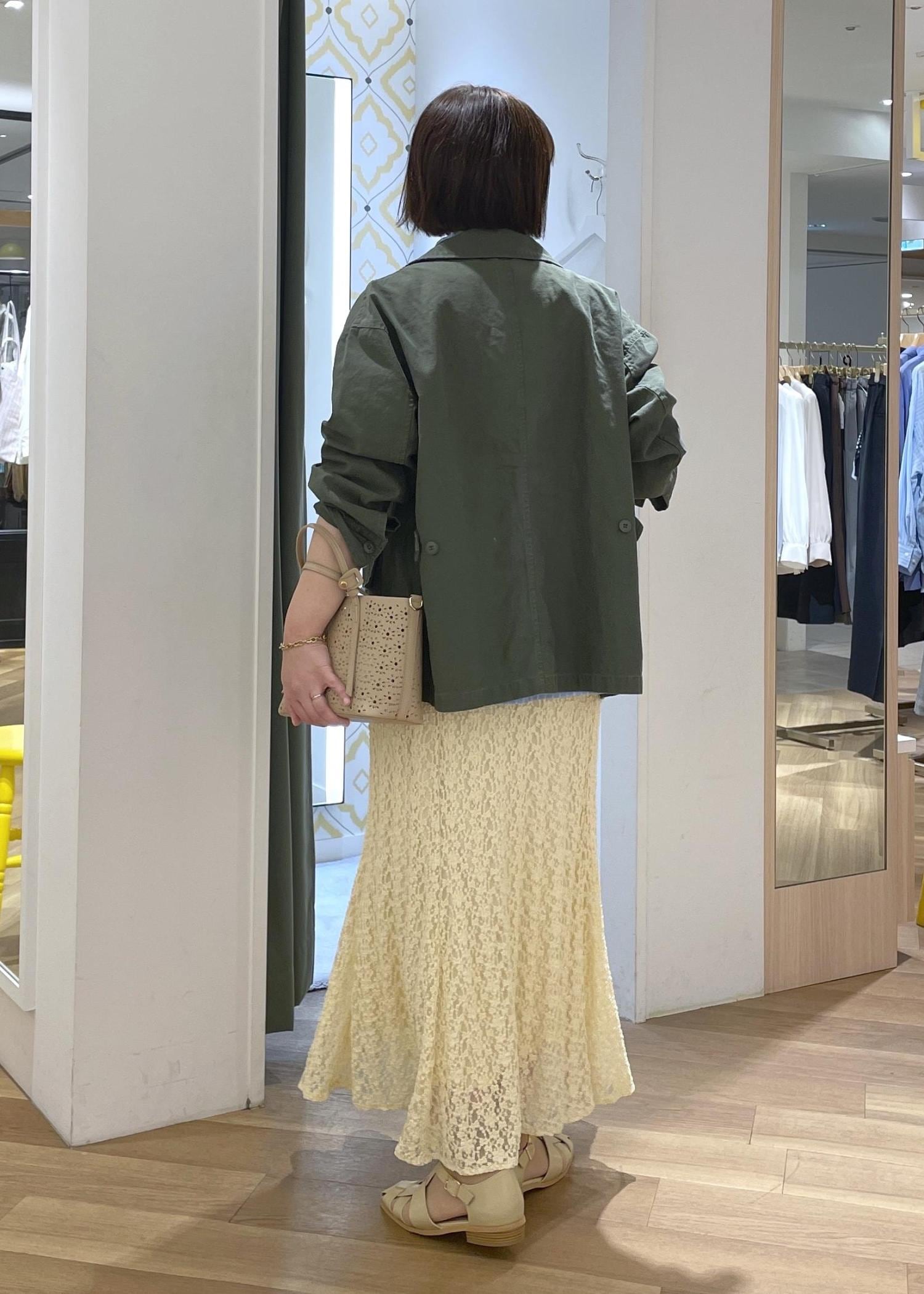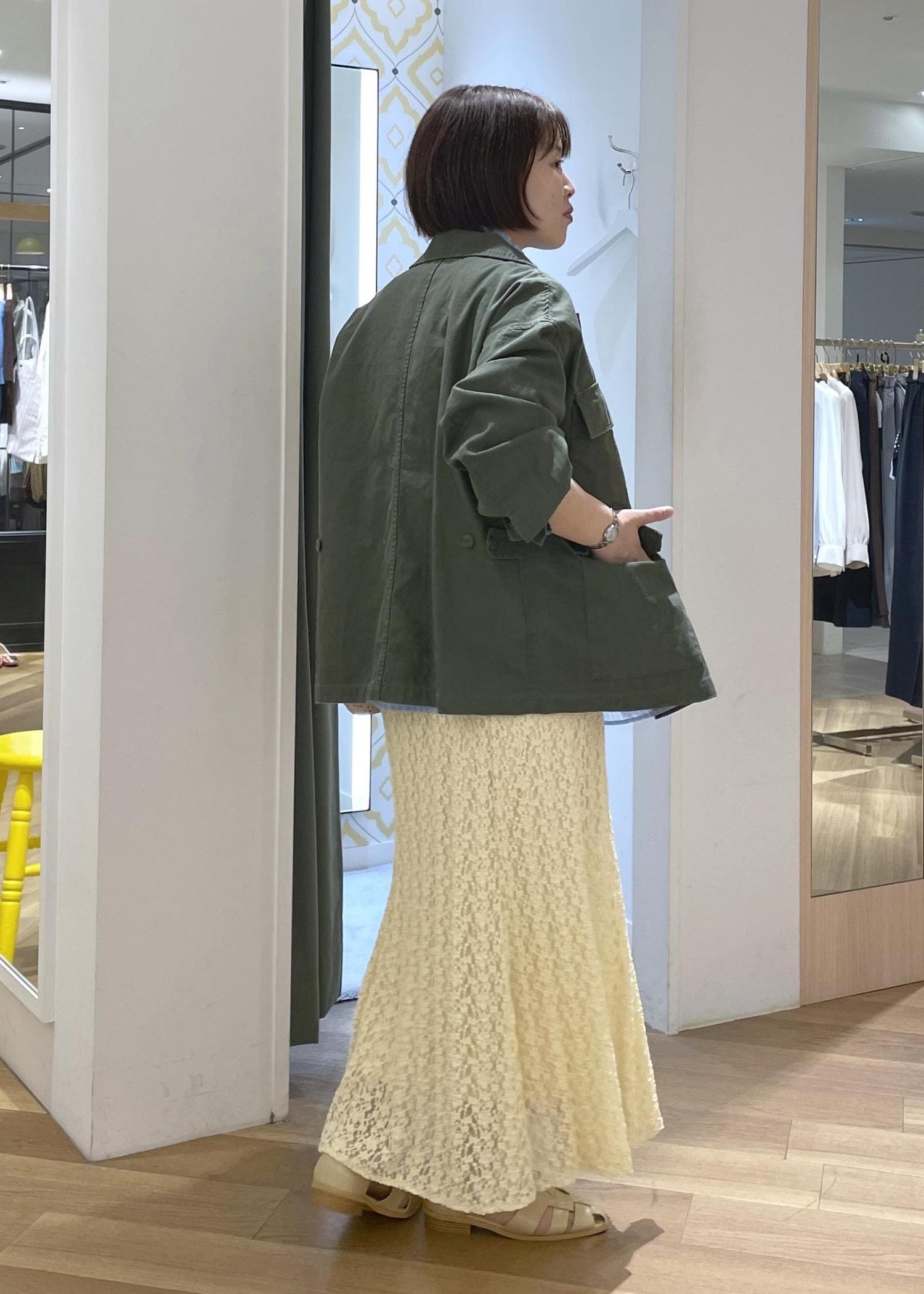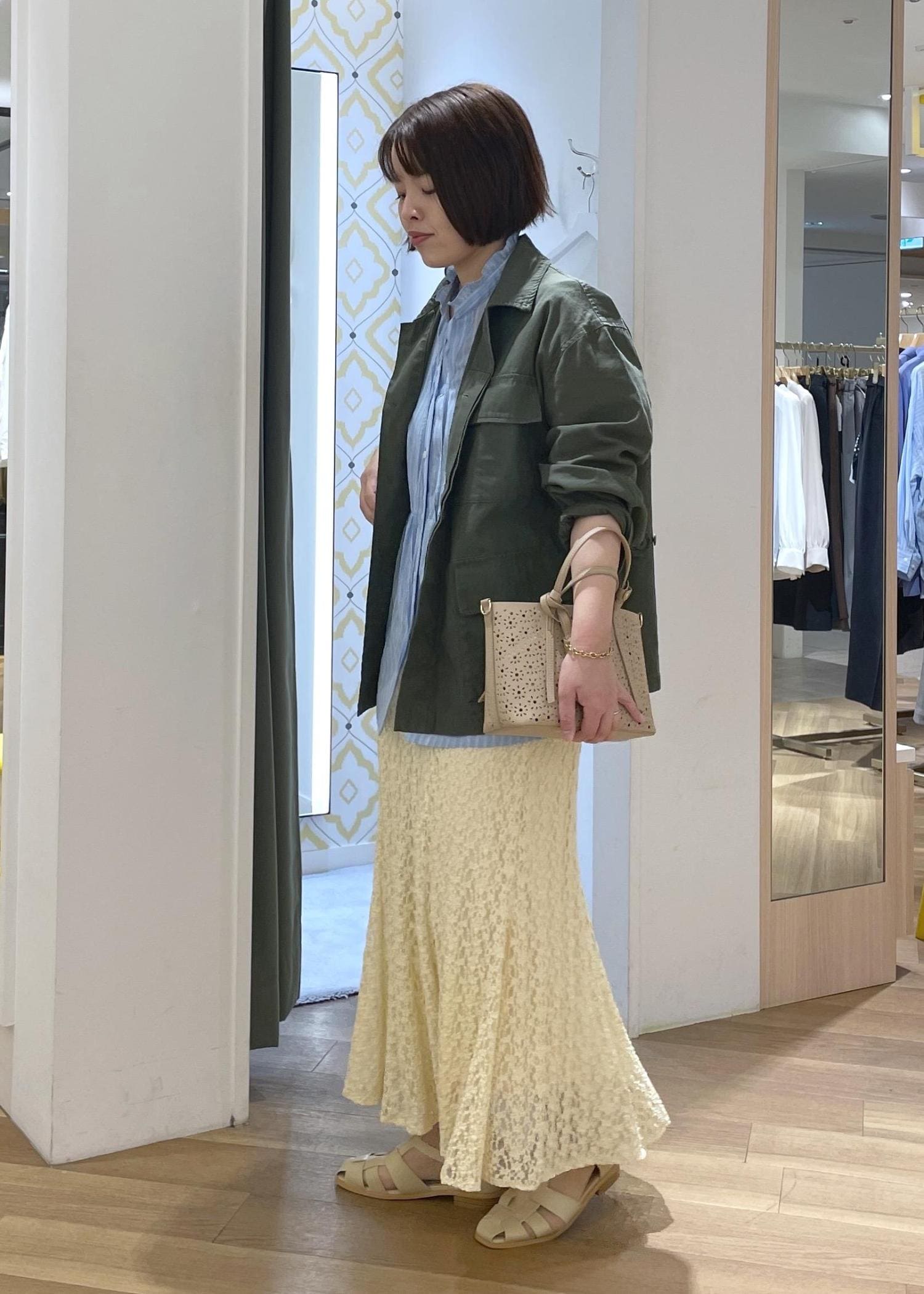 カジュアルなミリタリージャケットにレーススカートを合わせた、少し甘めな休日カジュアルコーデです!