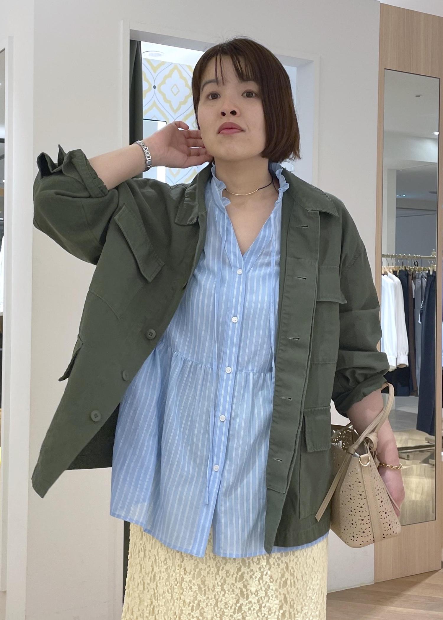 ジャケットのインナーにはストライプのフリルシャツを合わせて、爽やかでナチュラルな装いに◎
