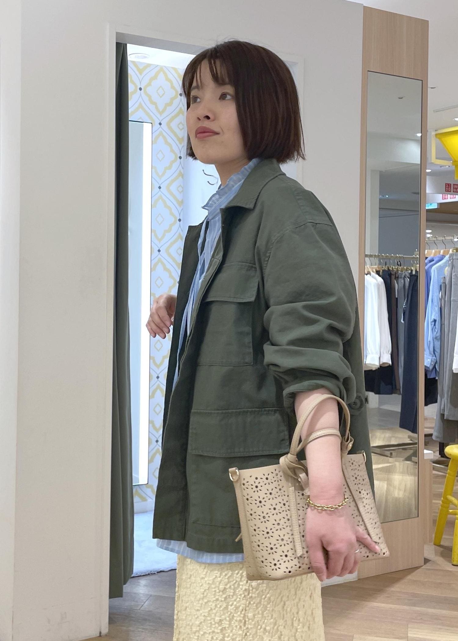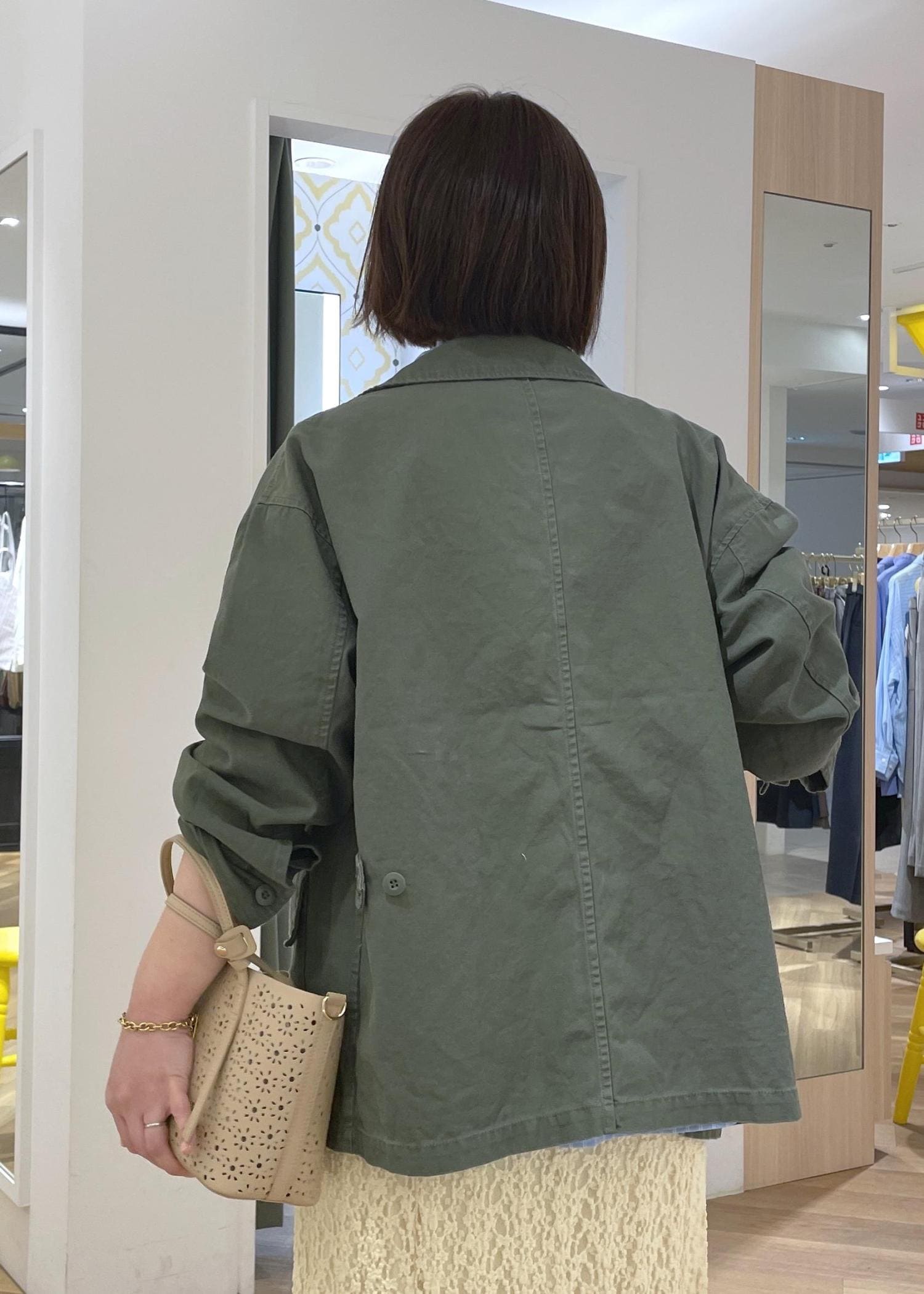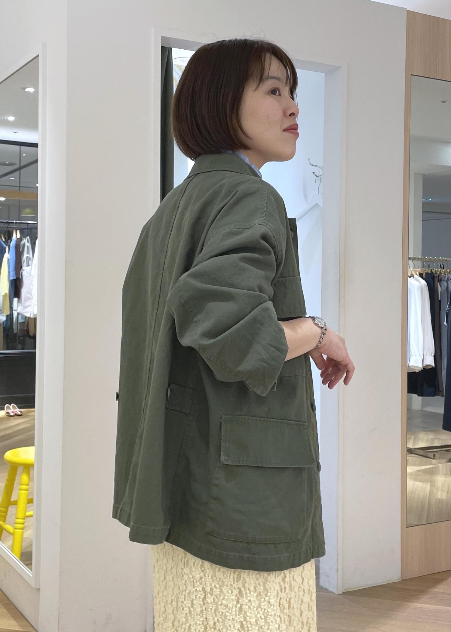 ハリのある綿素材のミリタリージャケットです。軽い羽織心地でシャツ感覚でお召し頂けます。身頃はゆったりとしておりオーバーサイズのリラックス感あるシルエットです。着丈はヒップにかかるくらいの長さです。