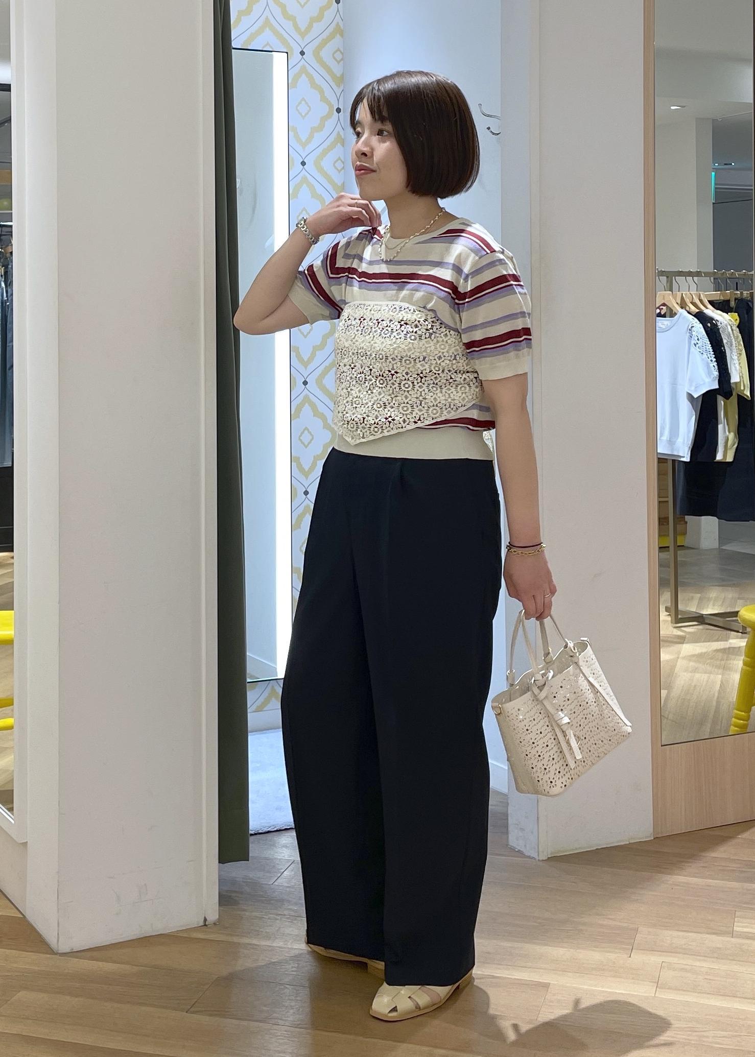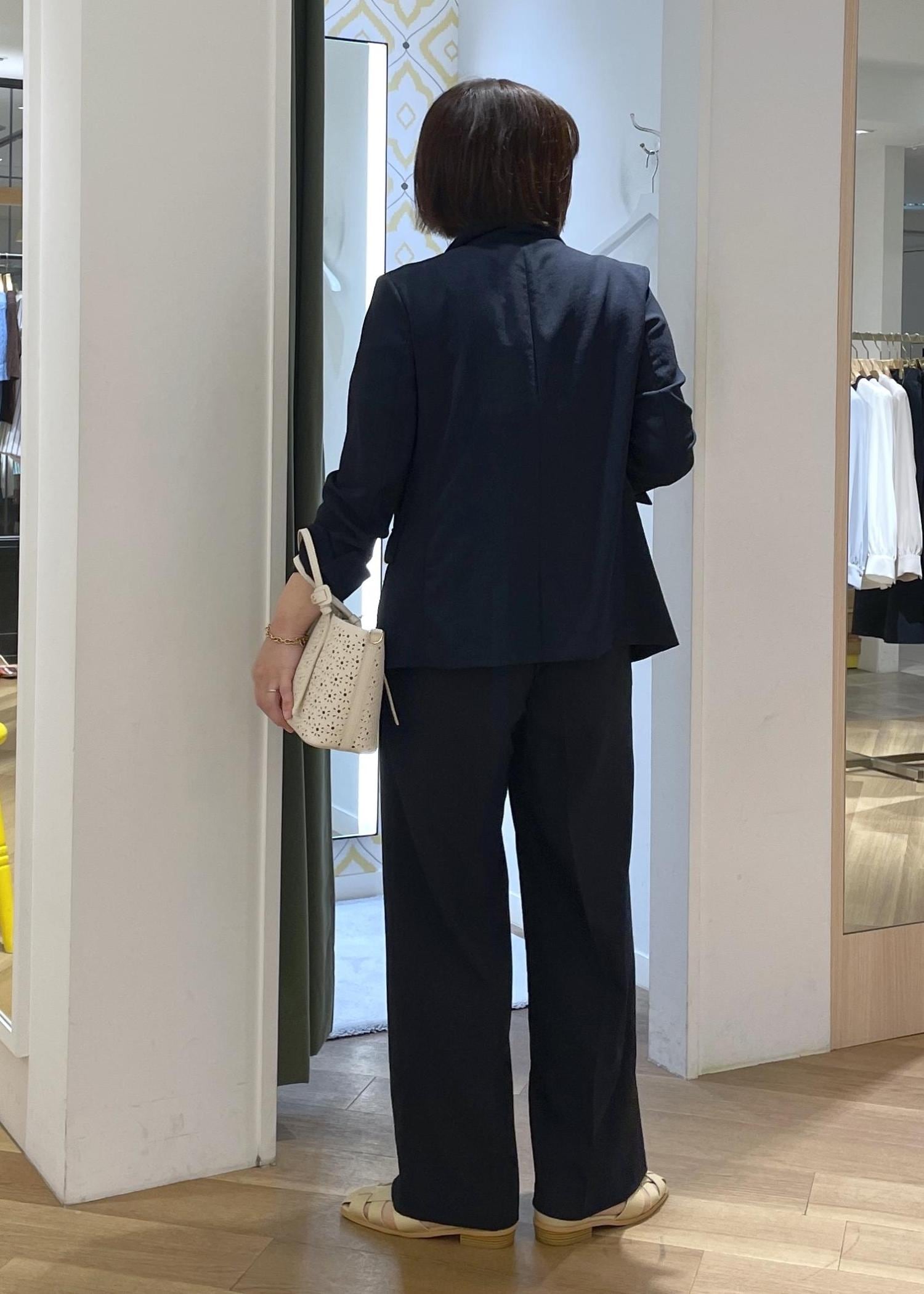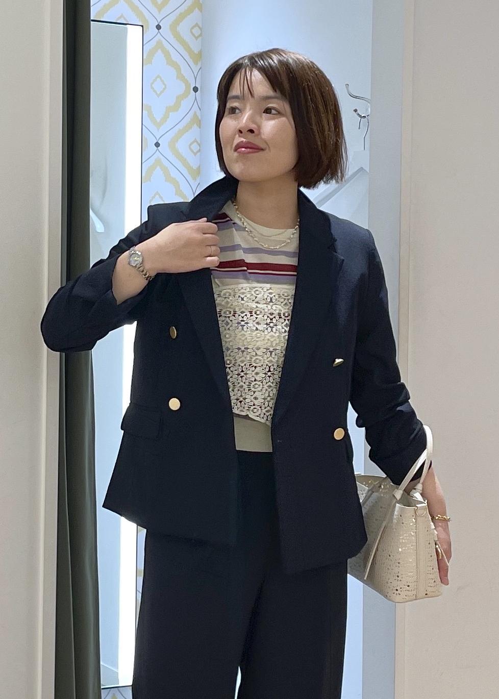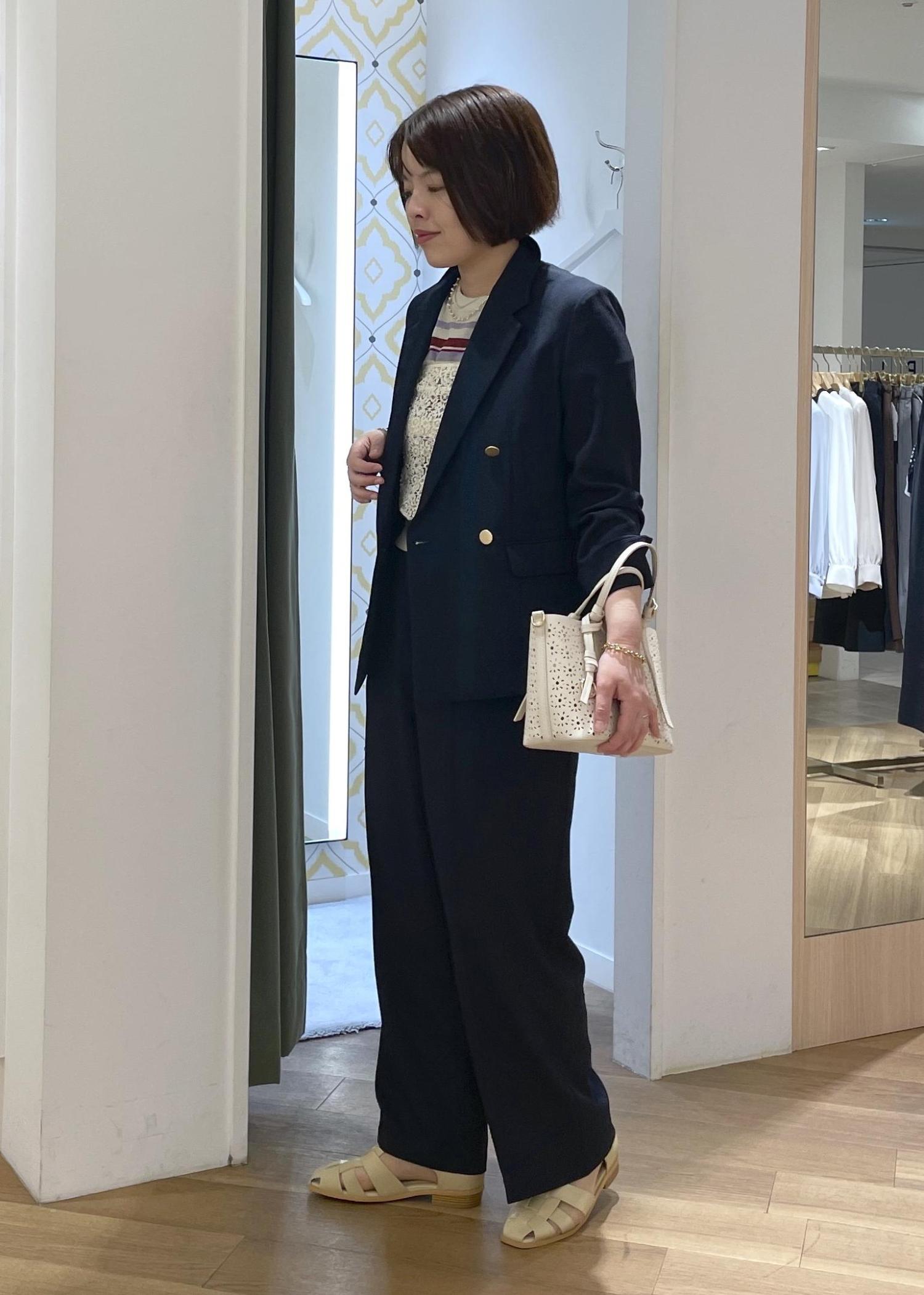 きちんと感と清涼感を兼ね備えた麻調ジャケットのセットアップに、マルチボーダーのサマーニットを合わせた、爽やかな大人カジュアルコーデです!