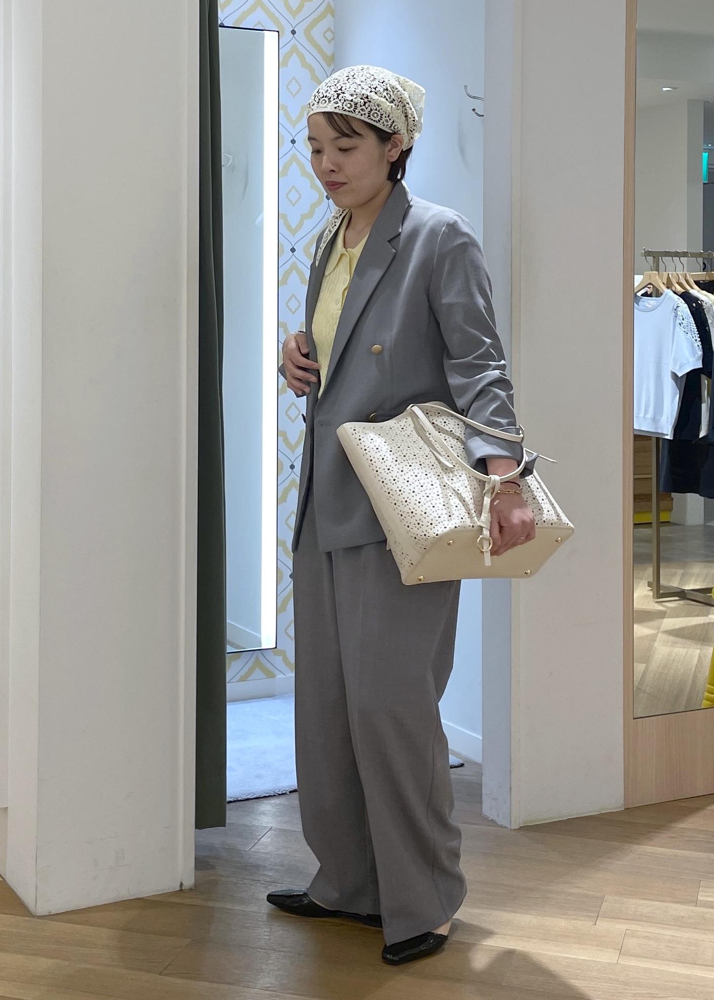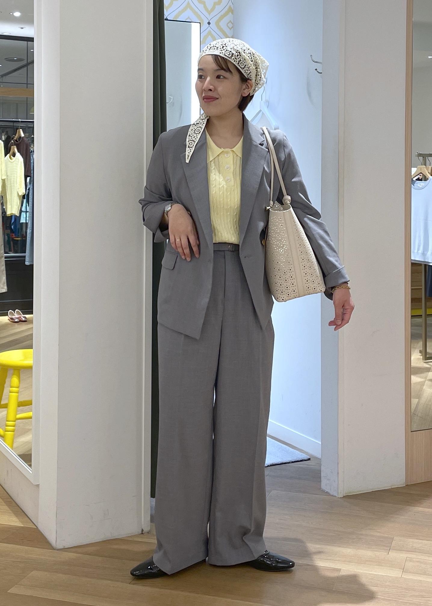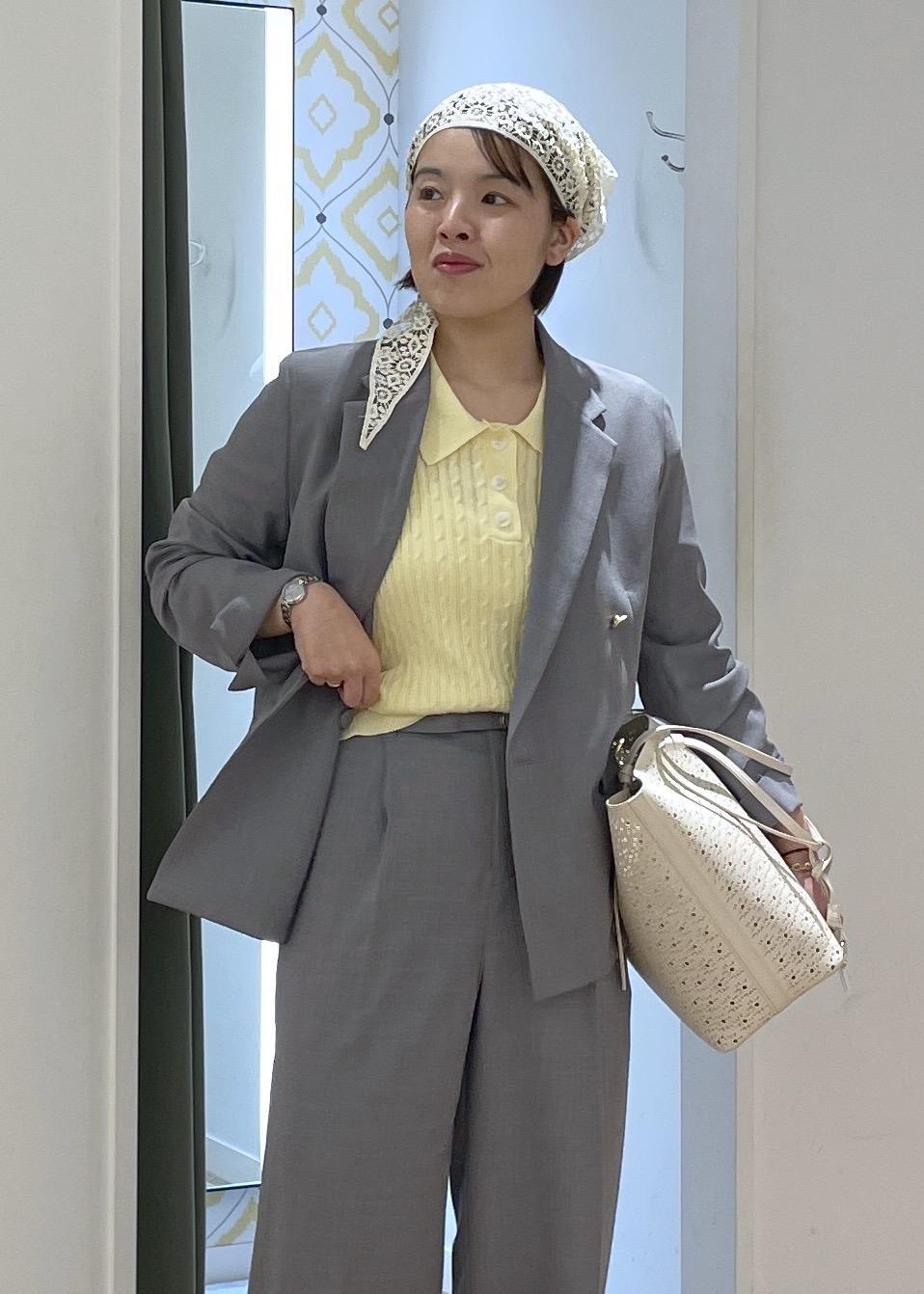 知的なグレーのジャケットセットアップに、柔らかなイエローのポロニットを合わせたトレンドカジュアルコーデです!