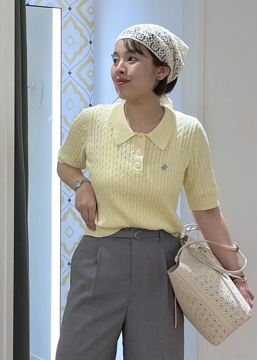 カチッと感のあるグレーのセットアップなので、カジュアルなイエローのポロニットを取り入れることで、春のお出かけスタイルに!