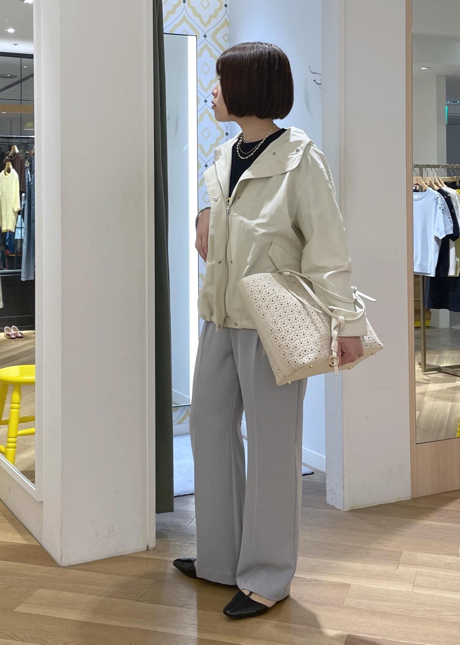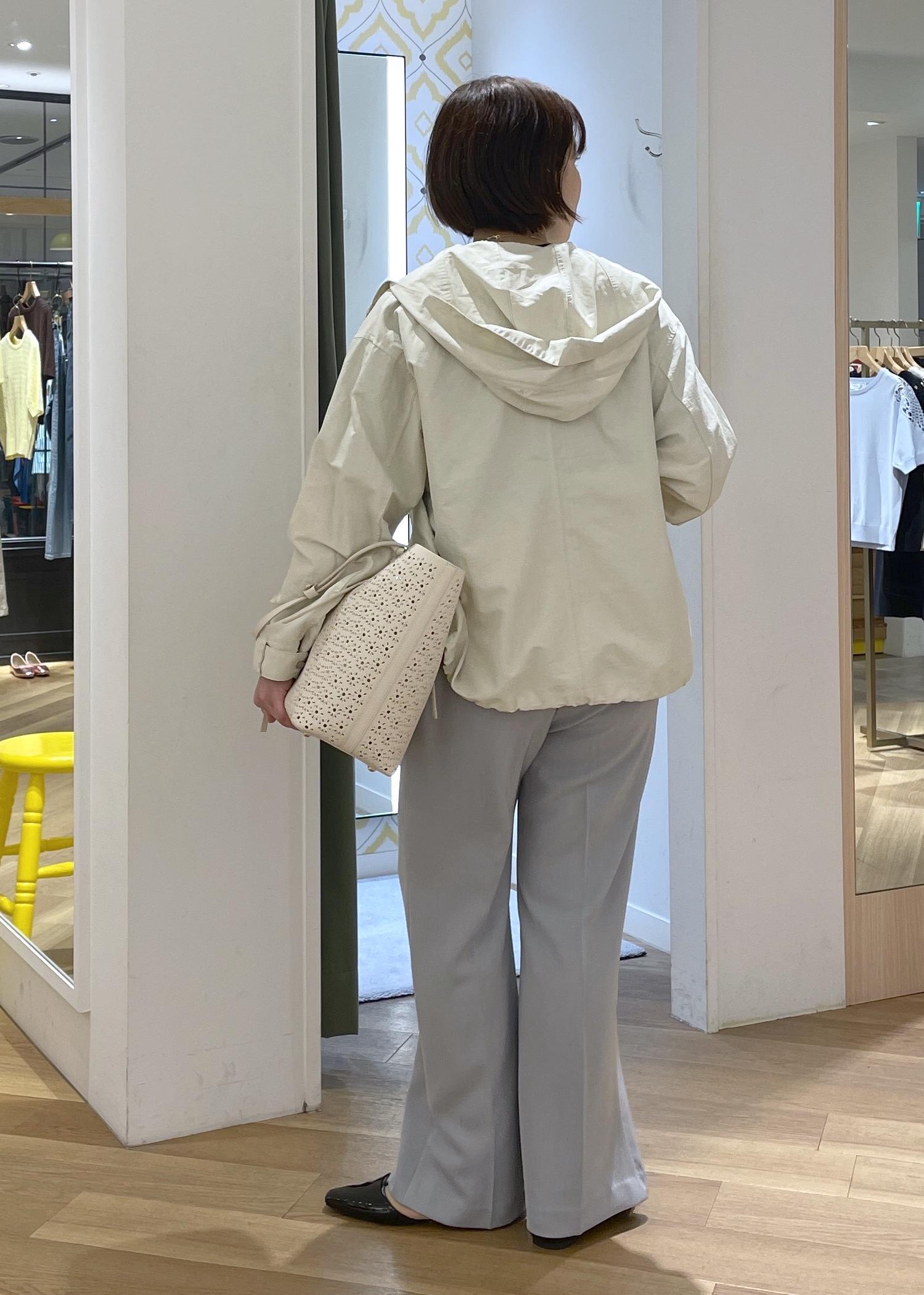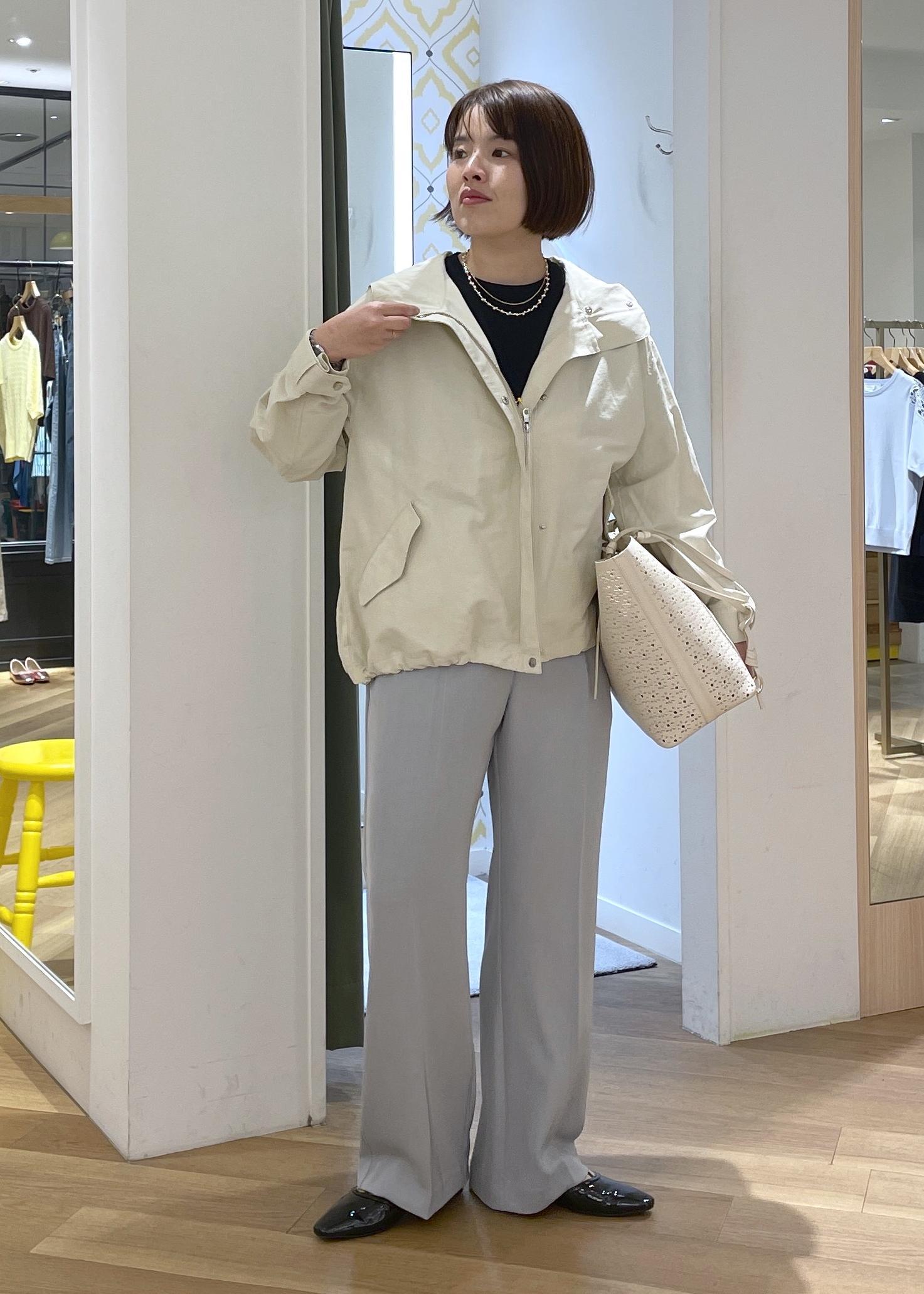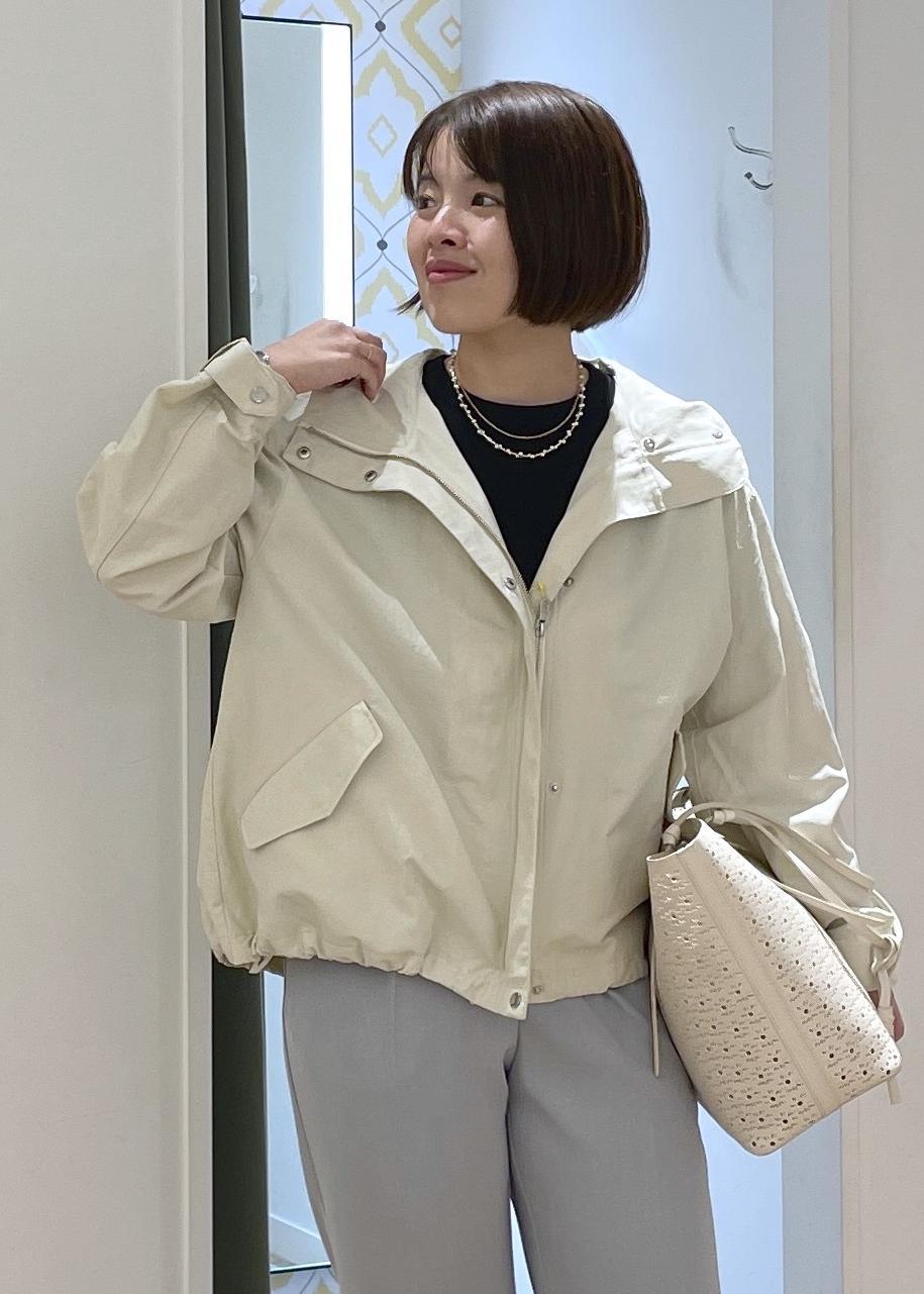 軽い素材感で羽織り心地も良いアウターです。少しハリがある生地感です。身頃はゆとりがあり、厚地のトップスの上からでも羽織れます。着丈はヒップに掛かるくらいの長さです。