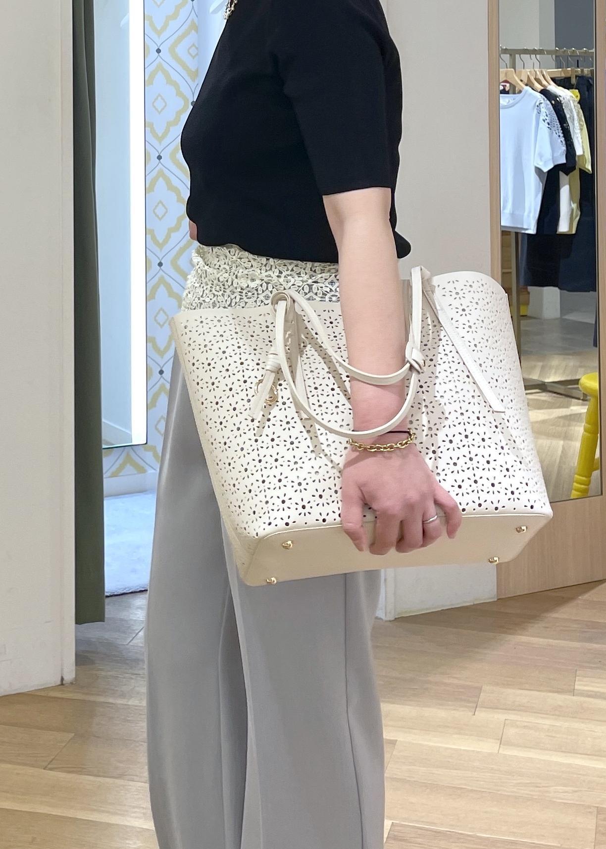 パンチングレースが爽やかで持つだけでポイントになるトートバッグです。A4サイズの収納もでき、マチもしっかりあるので収納力も抜群です。長めのハンドルなので肩にもかけやすかったです。中に巾着も付いているので、透けを気にせず使って頂けます。