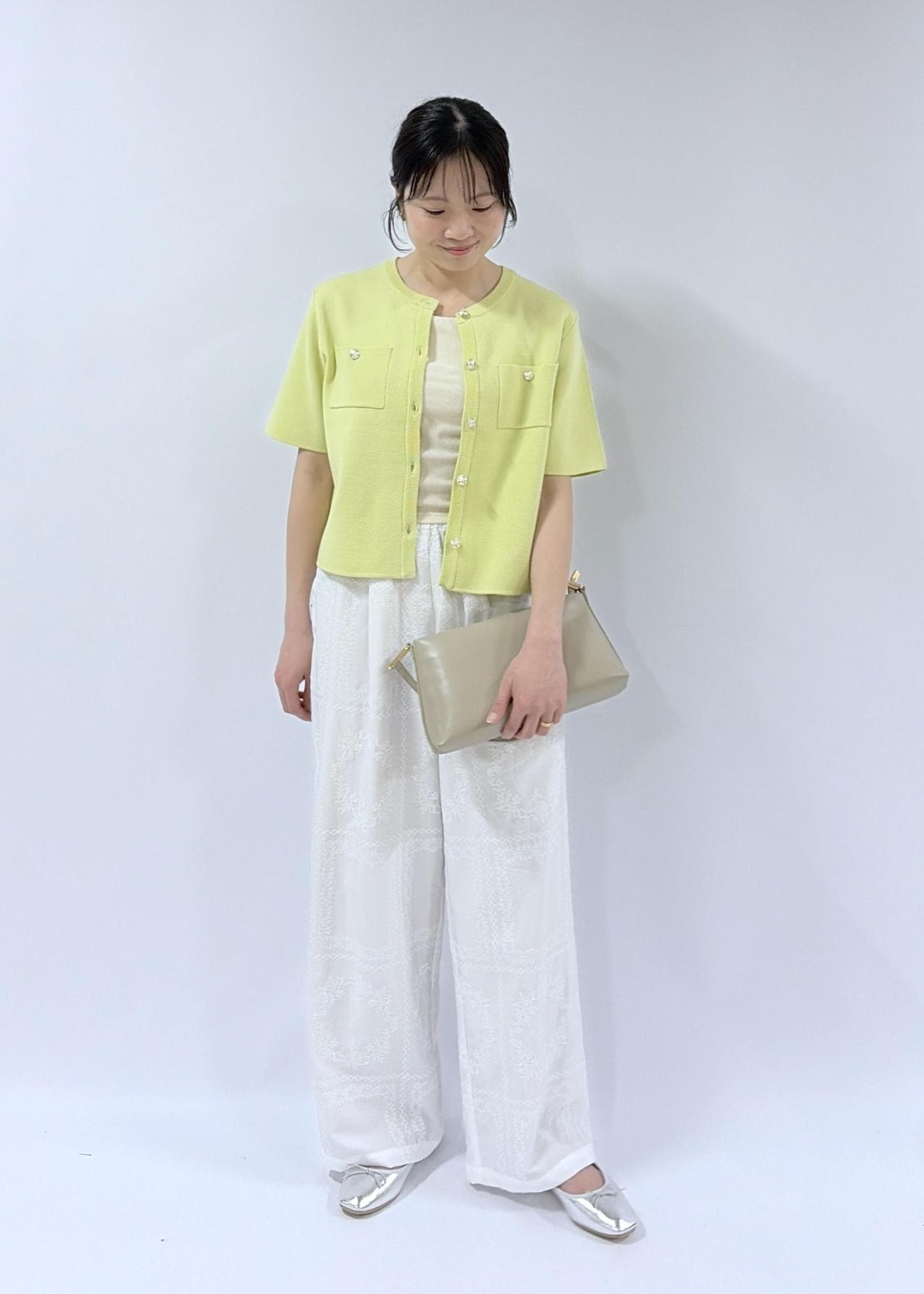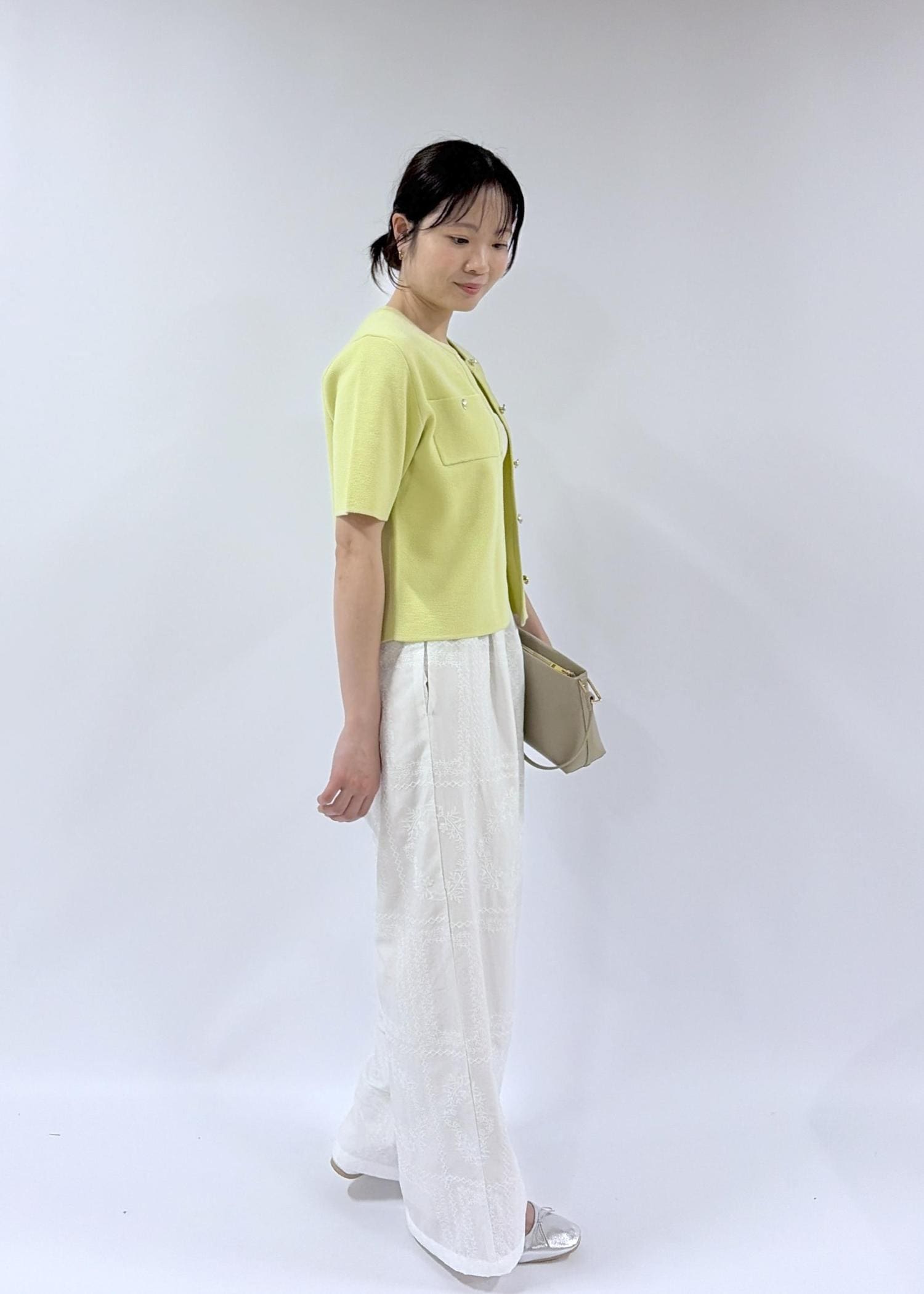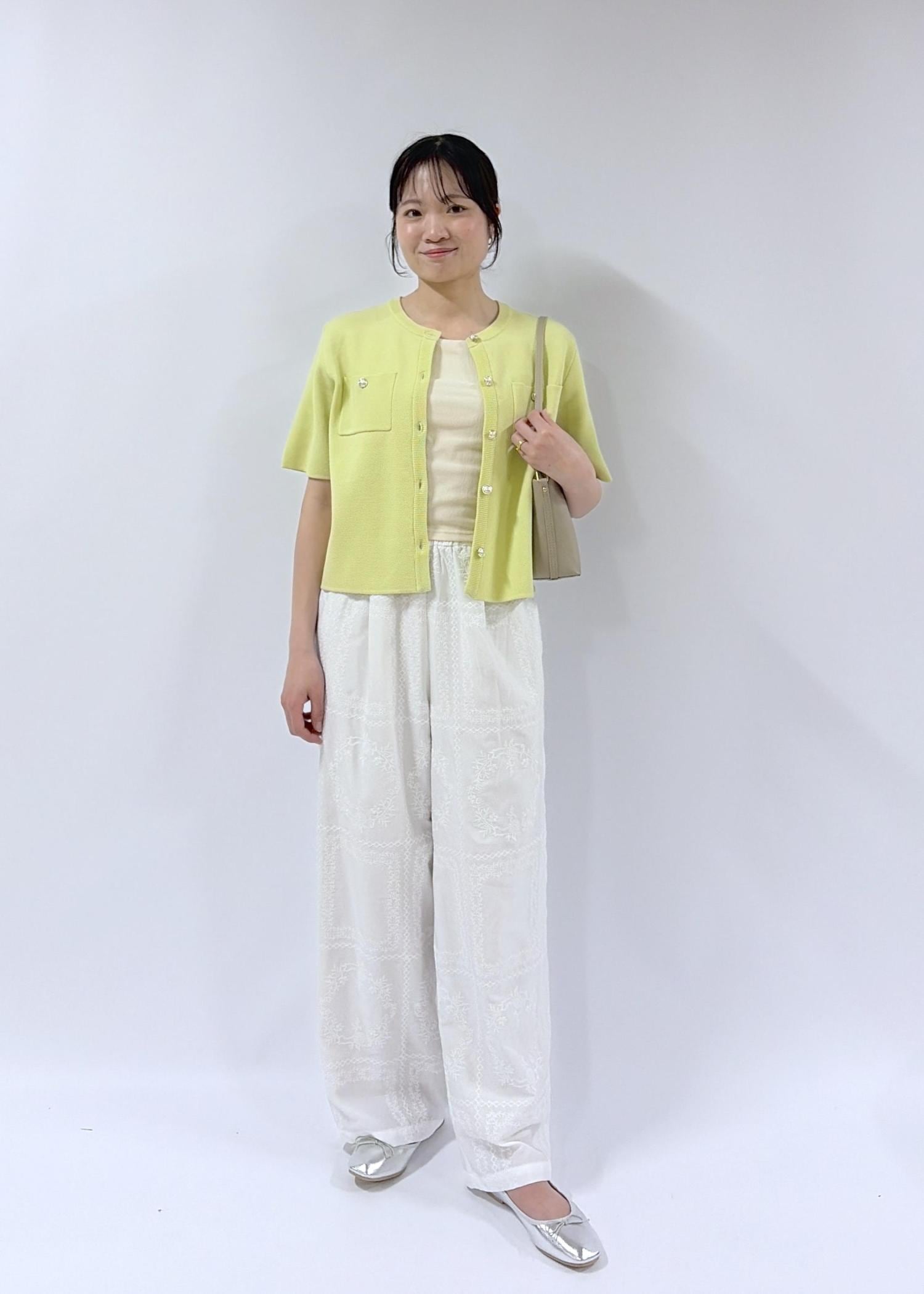 ライトグリーンにホワイトの爽やかな春カラーコーデ。毎年人気のミラノリブカーディガンはハリ感があって羽織りでも使える優れものです。