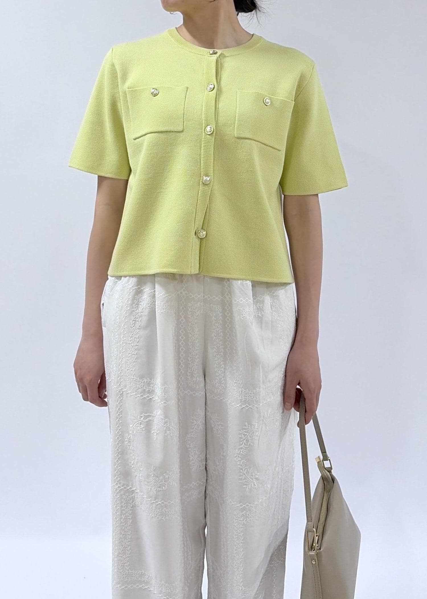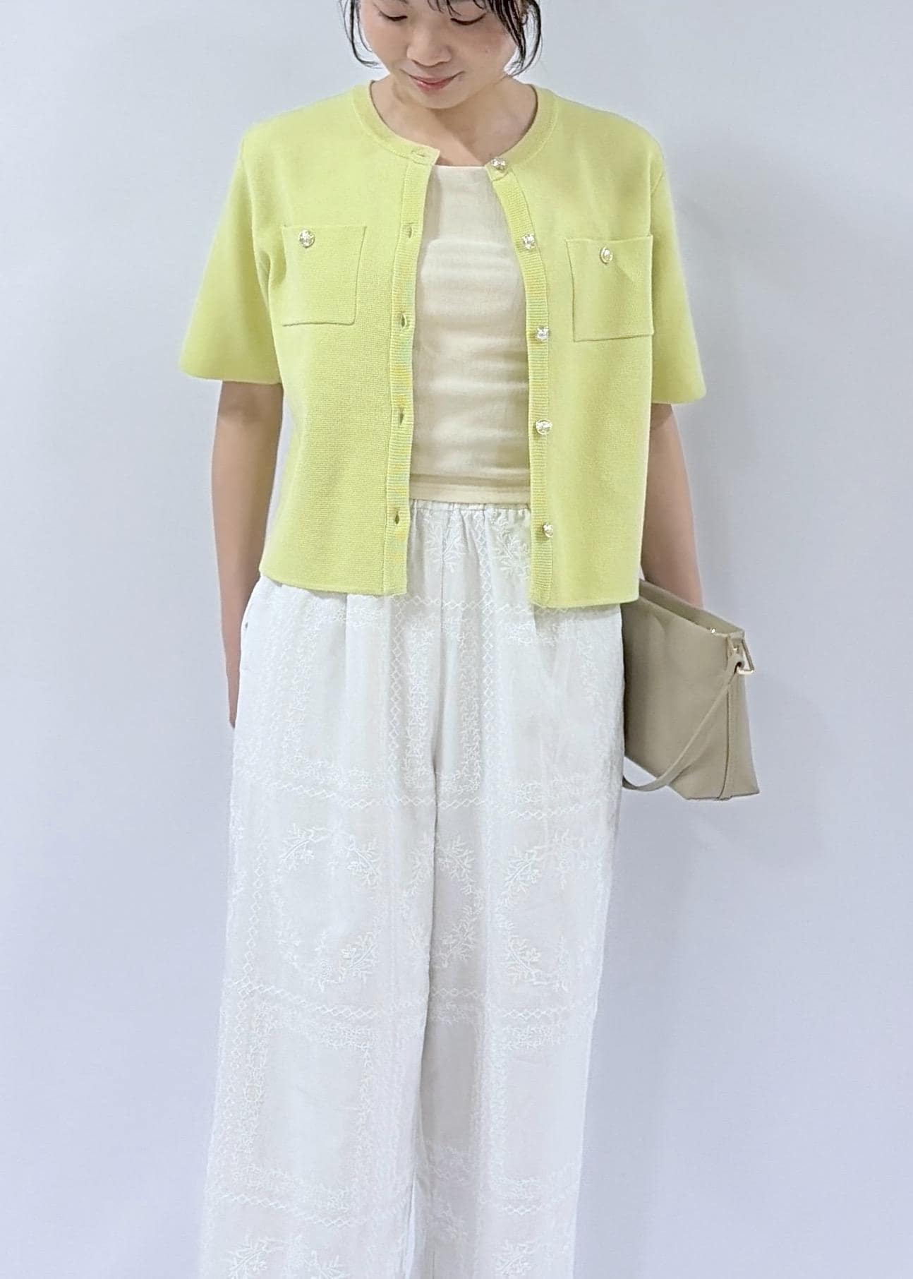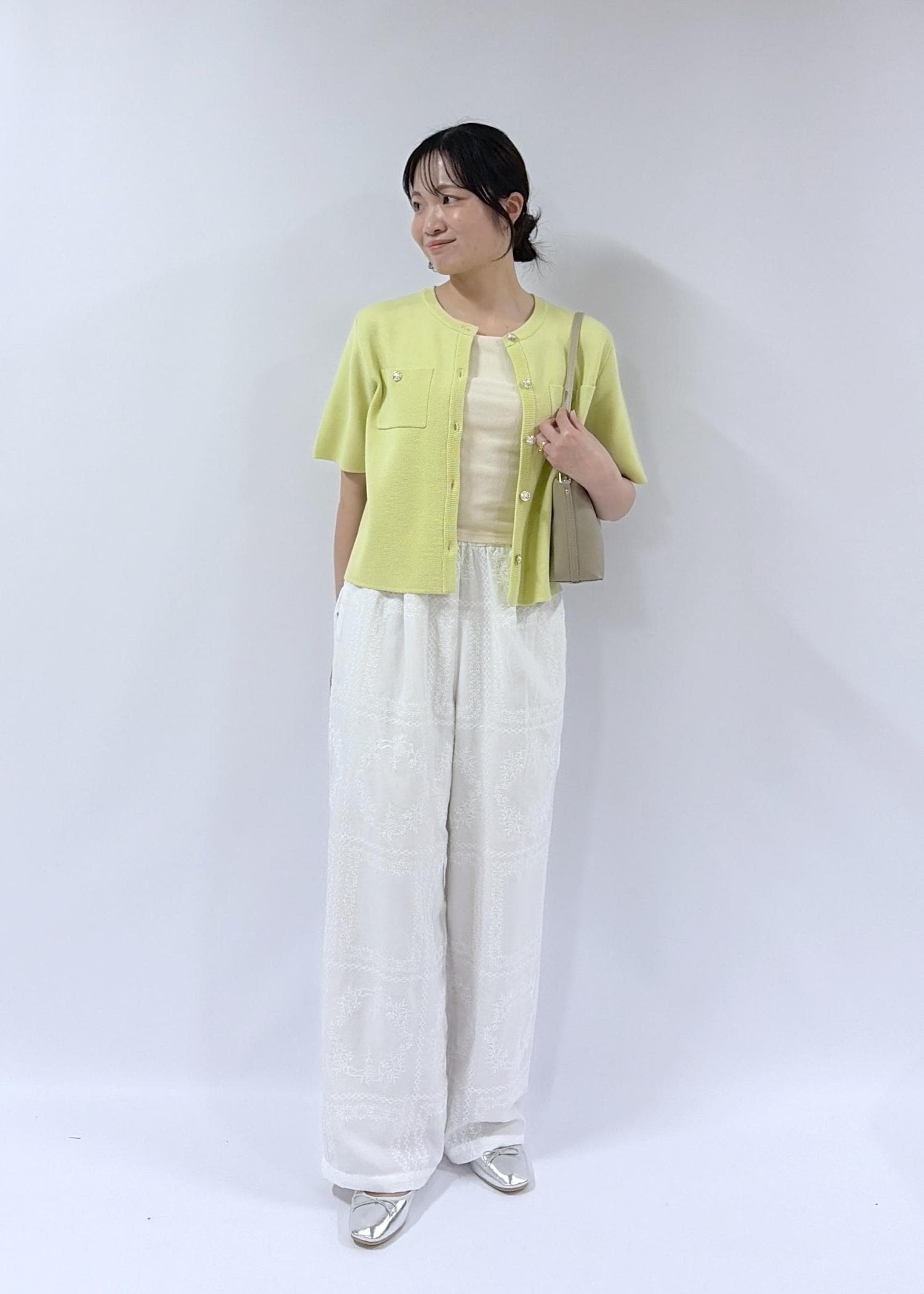 ライトグリーンにホワイトの爽やかな春カラーコーデ。毎年人気のミラノリブカーディガンはハリ感があって羽織りでも使える優れものです。