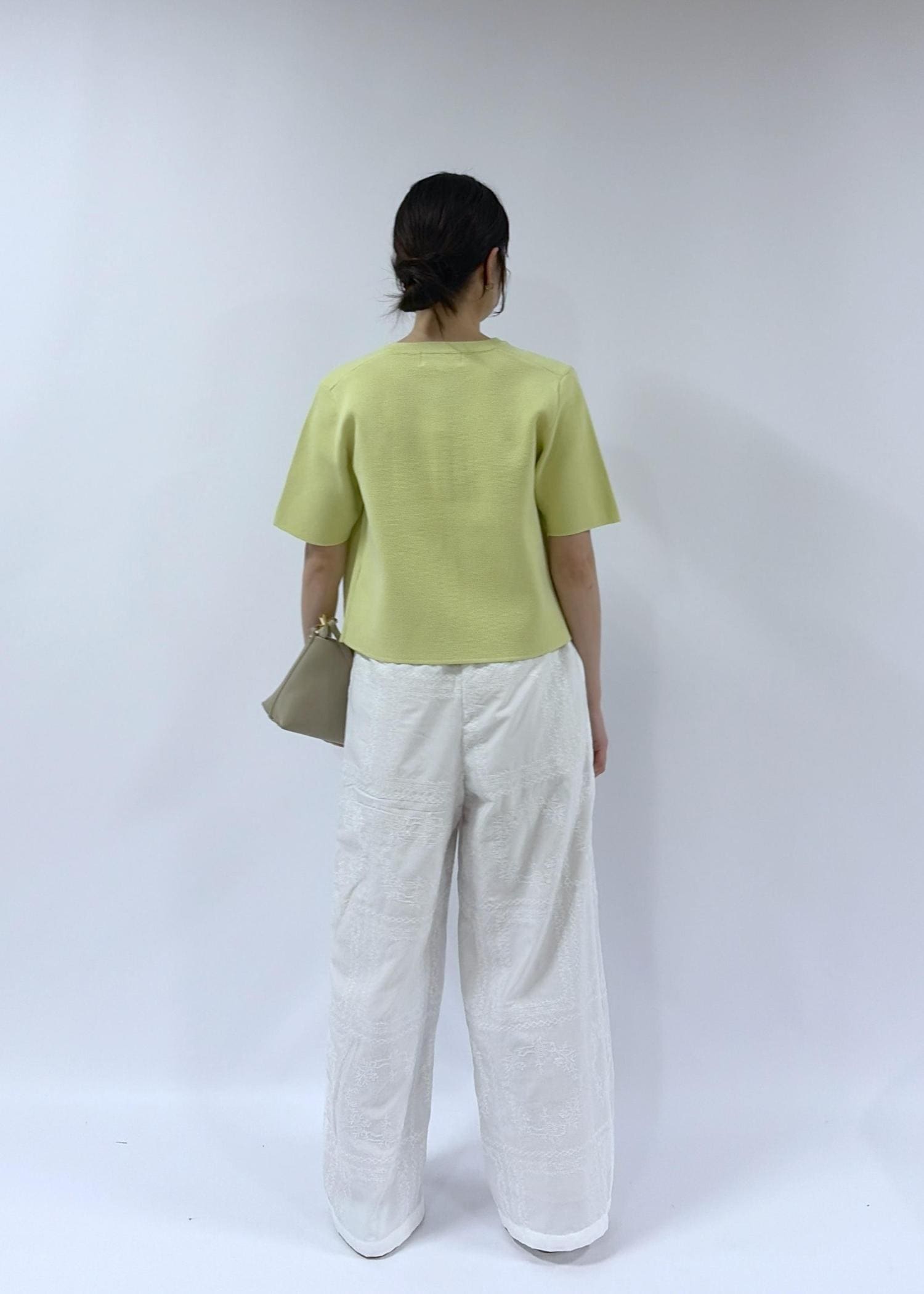 スクエアレースの刺繍が華やかなパンツです。ウエストゴムで履き心地は楽々。白でも裏地が入るので透け感気にせず履けました。