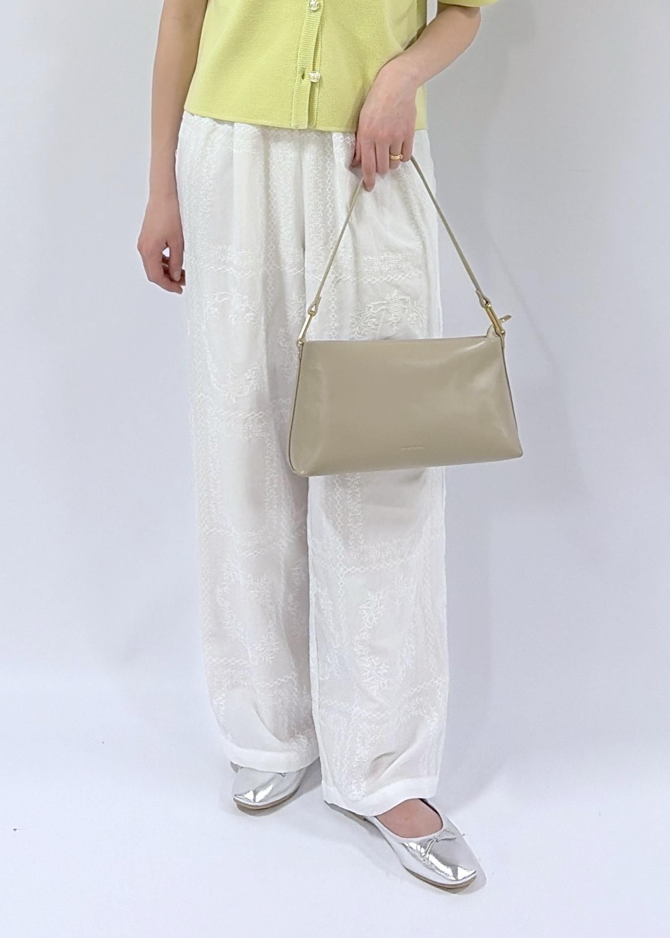 薄型でスッキリとしたシルエットです。持ち手が細いので綺麗めやちょっとしたセレモニーやパーティースタイルなどにも持てそうなバッグです。