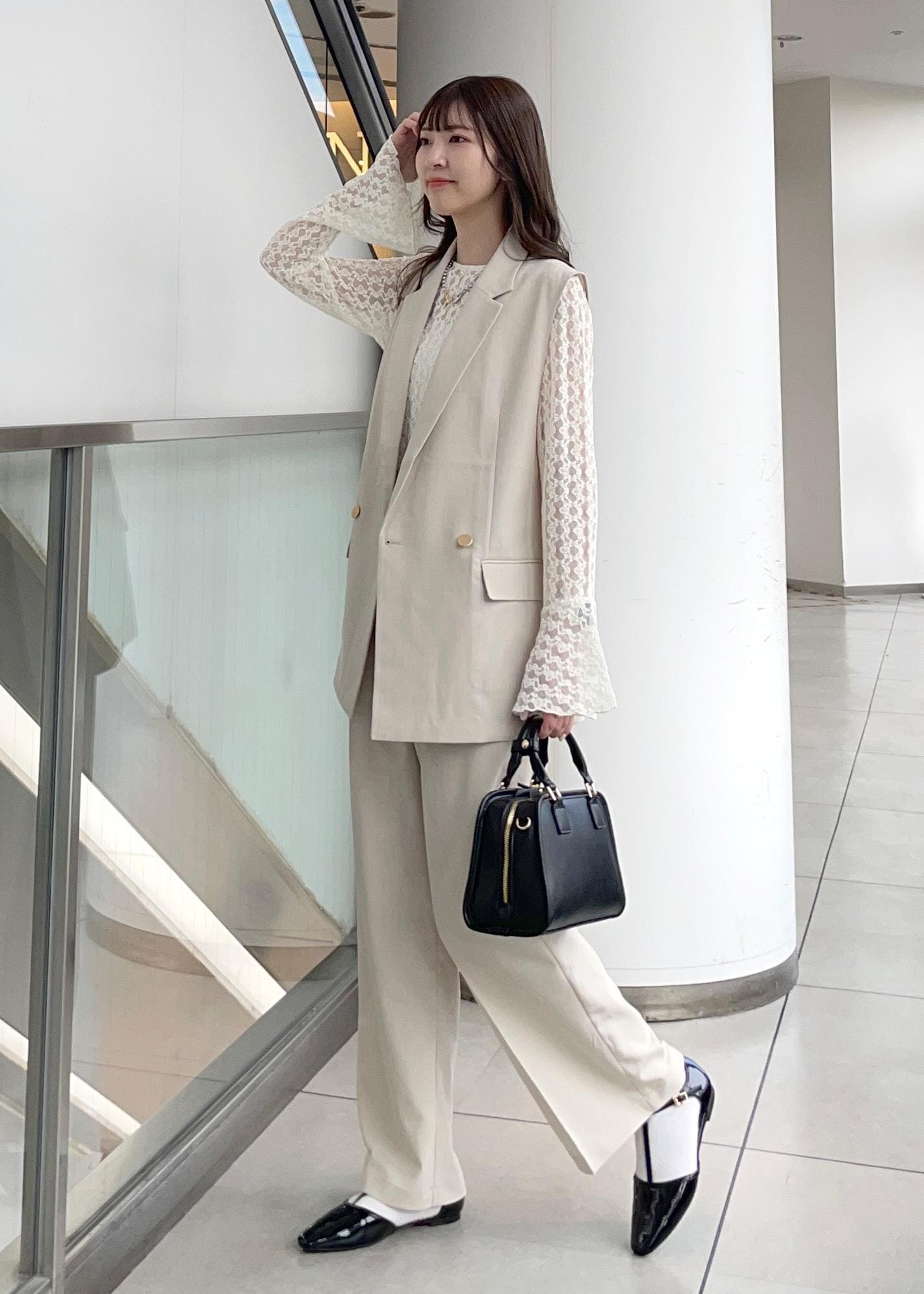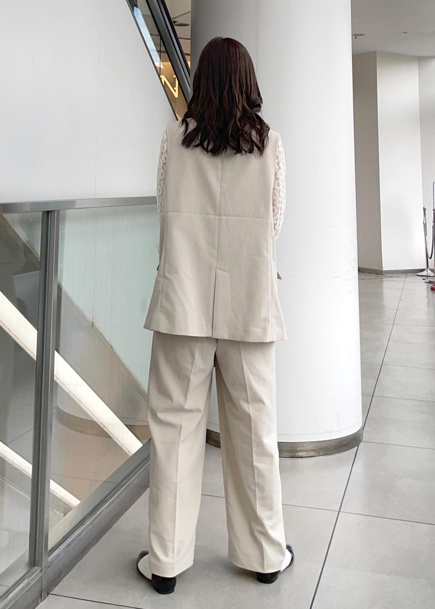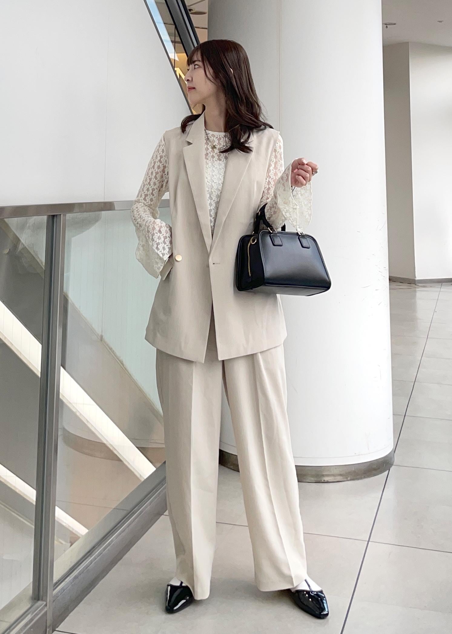 コーディネートが簡単でサマになる、ジレのセットアップスタイルです。インナーをTシャツやブラウスに変えても着回しが効くアイテムです。