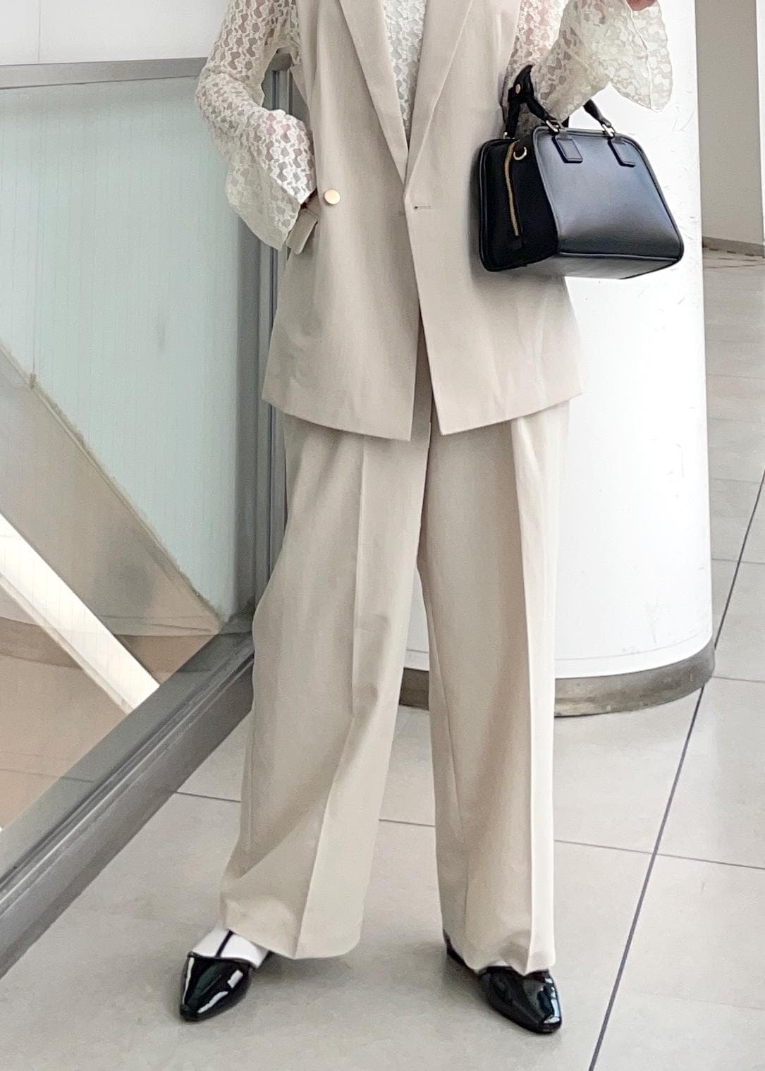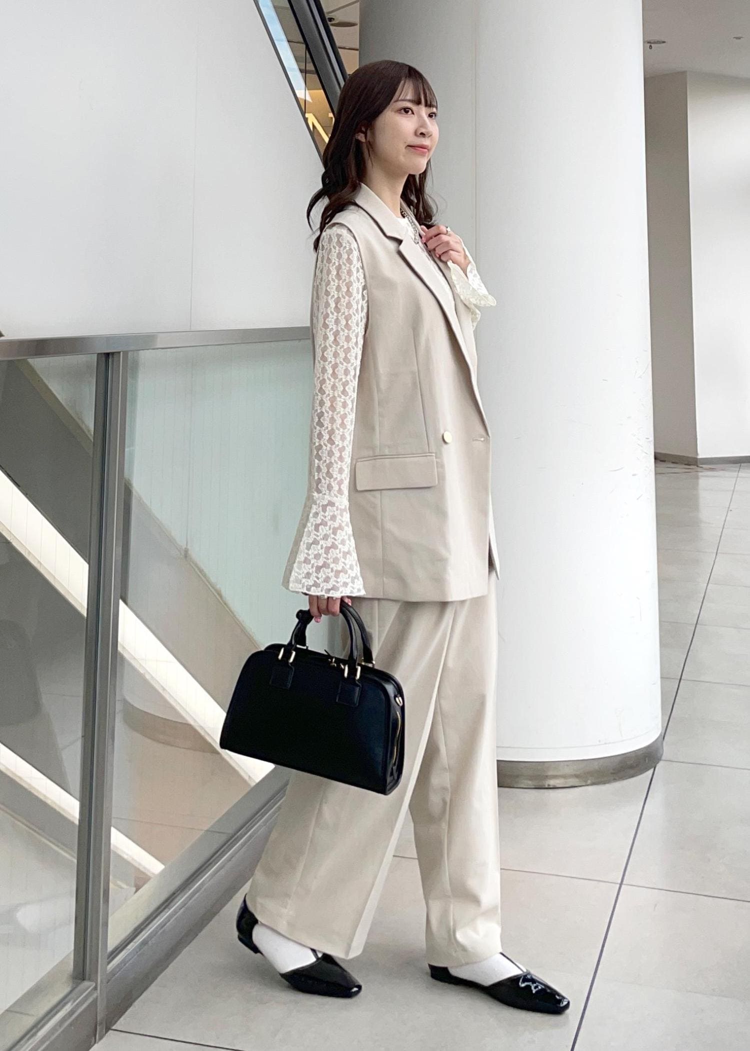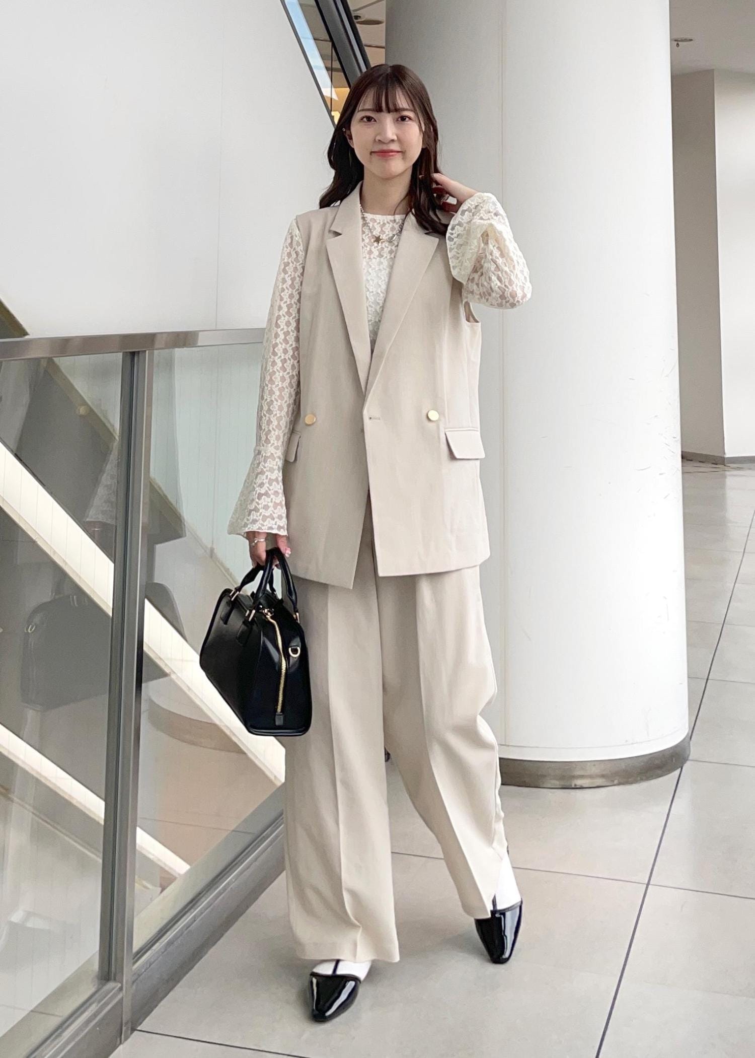 コーディネートが簡単でサマになる、ジレのセットアップスタイルです。インナーをTシャツやブラウスに変えても着回しが効くアイテムです。