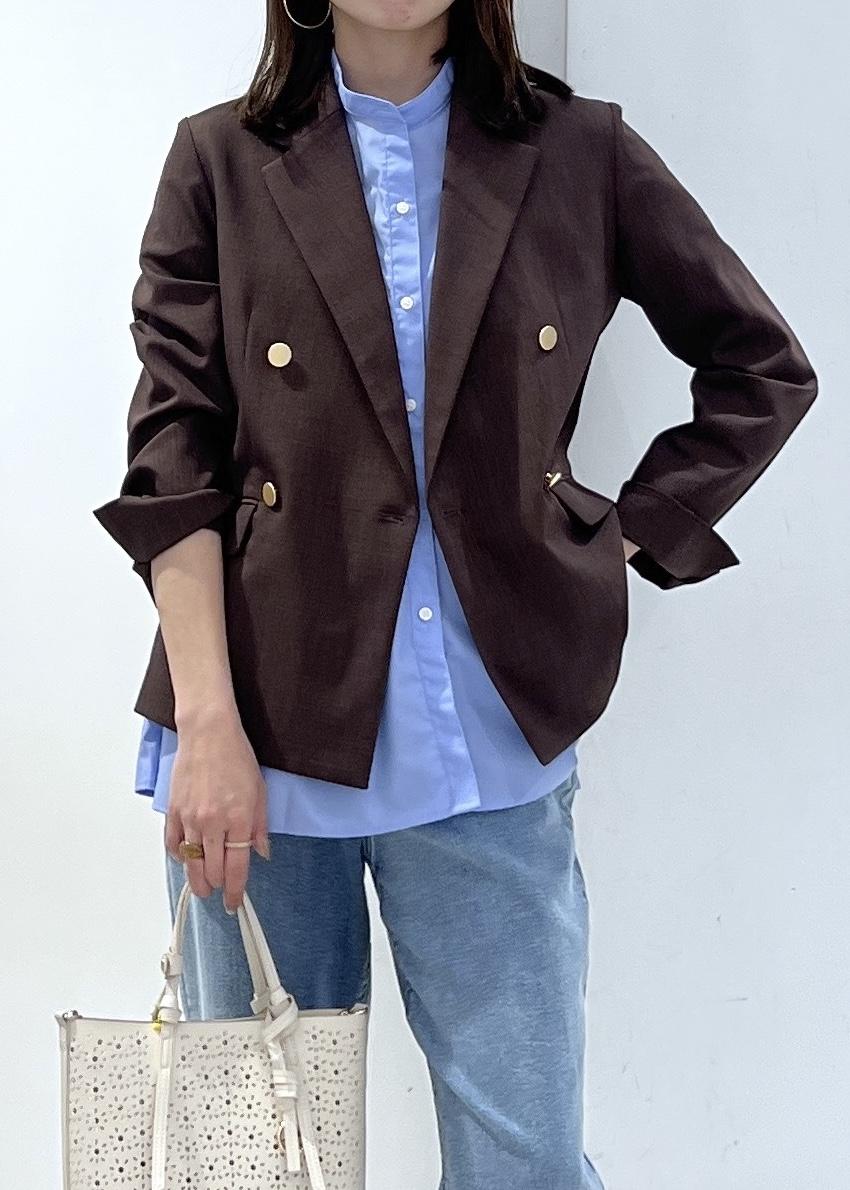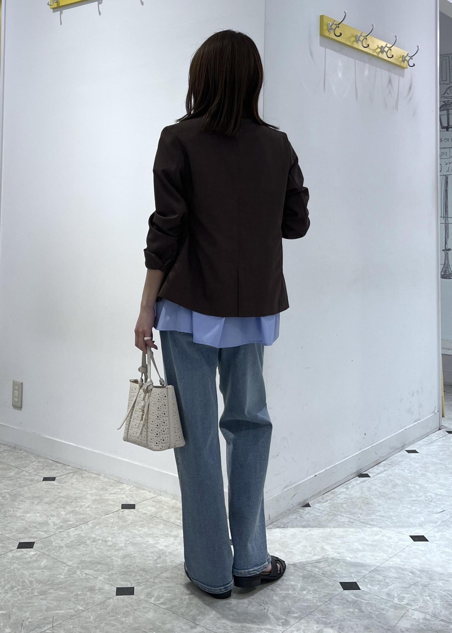 大人カジュアルにおすすめのブラウンはジャケットで取り入れて、トレンド感のあるコーデに。