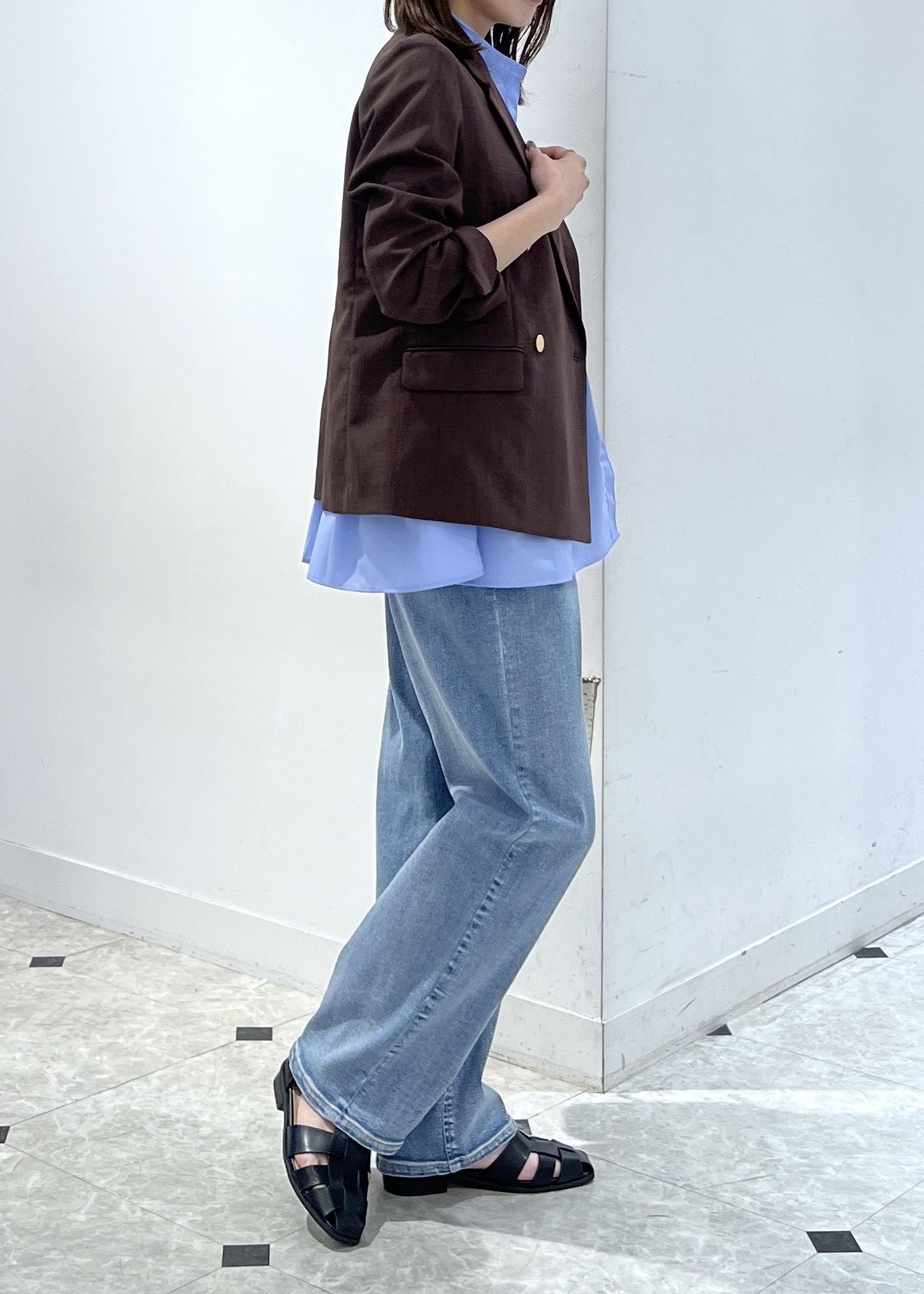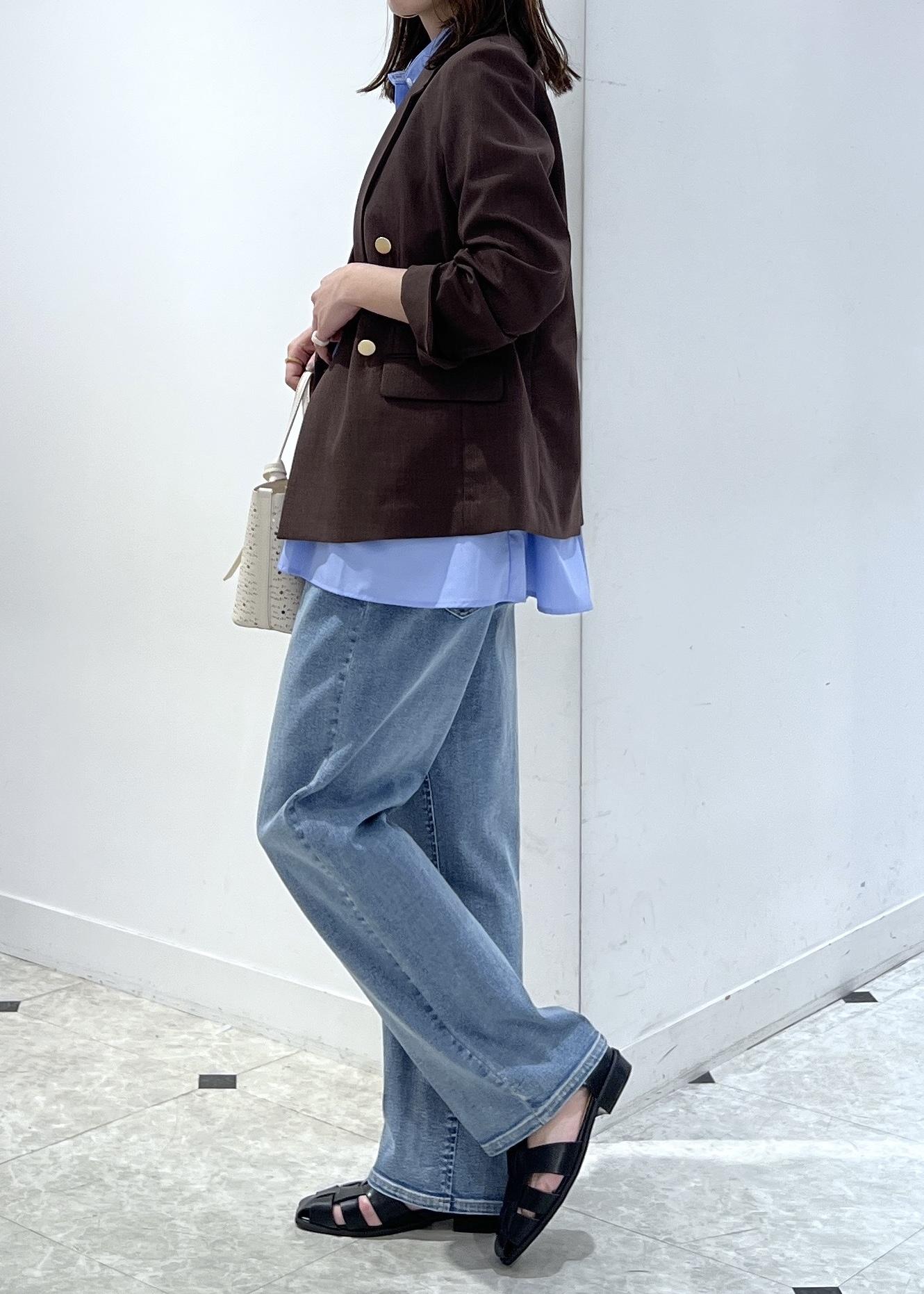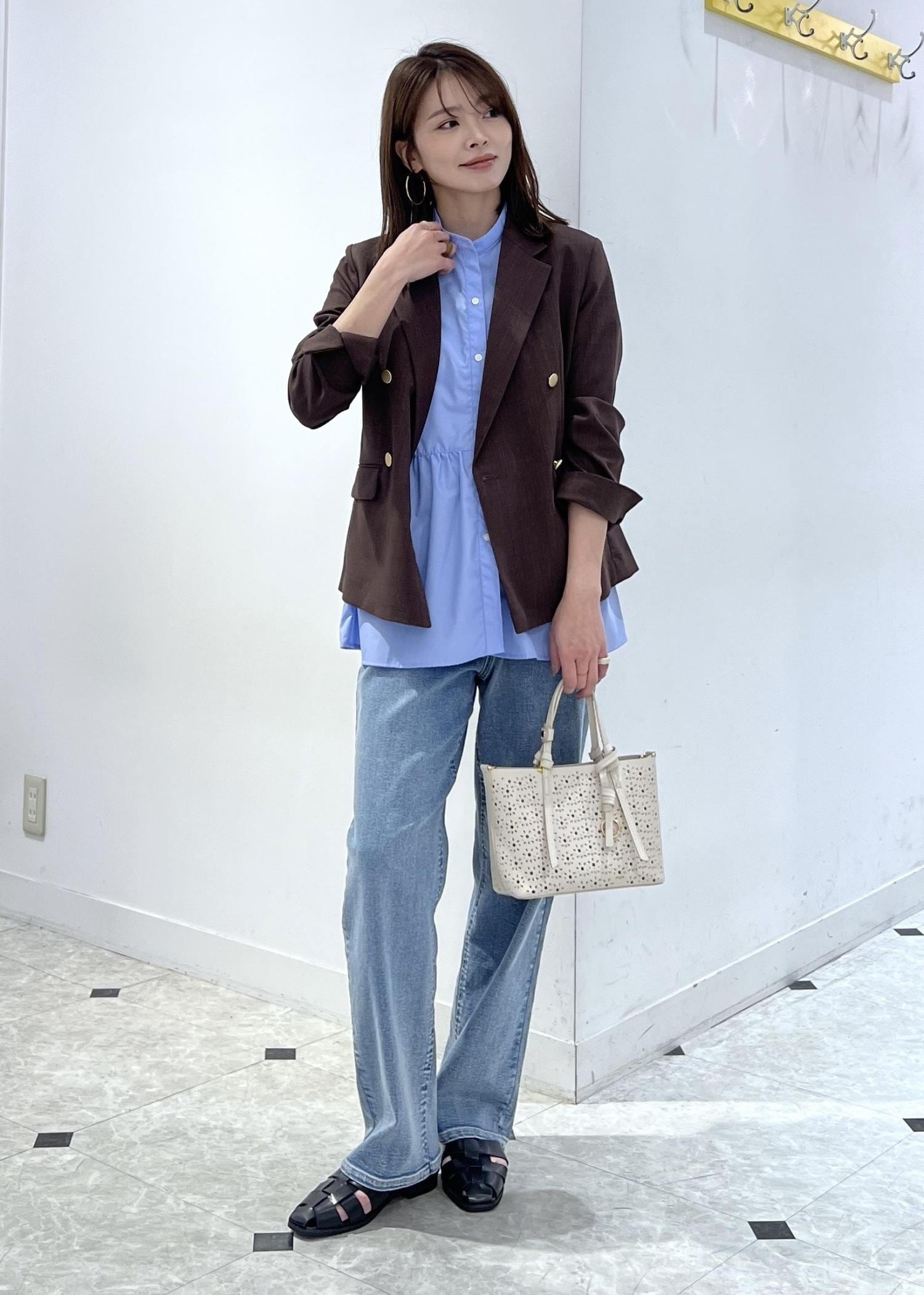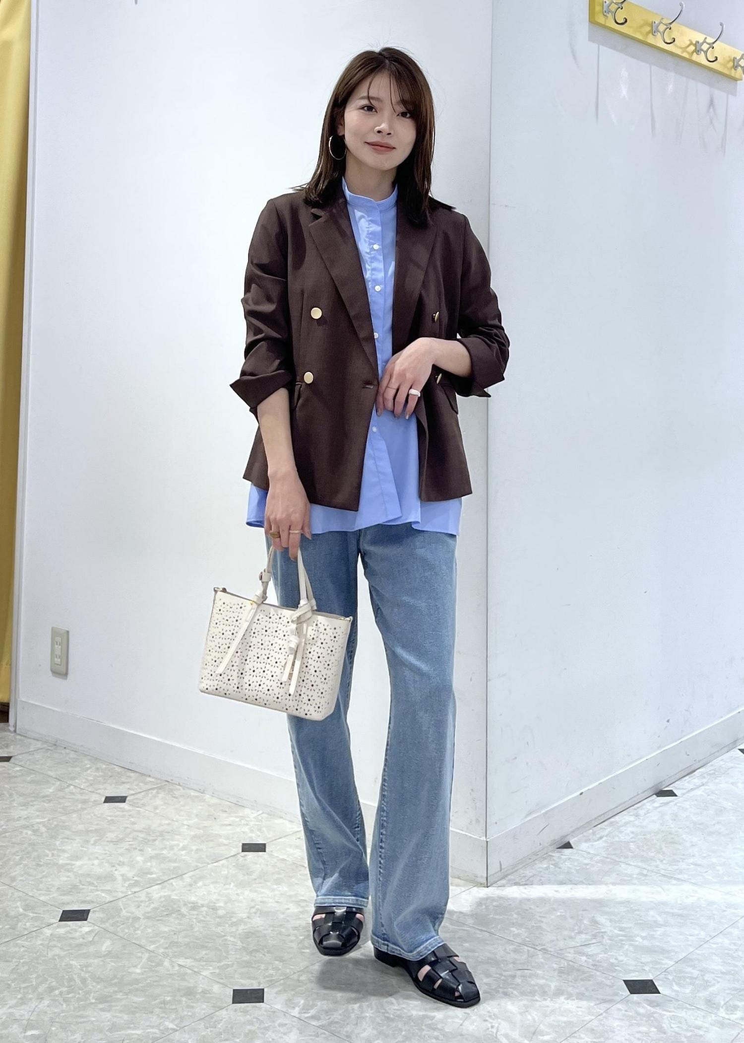 ブルーシャツをインして、爽やかな春夏コーデにしました。