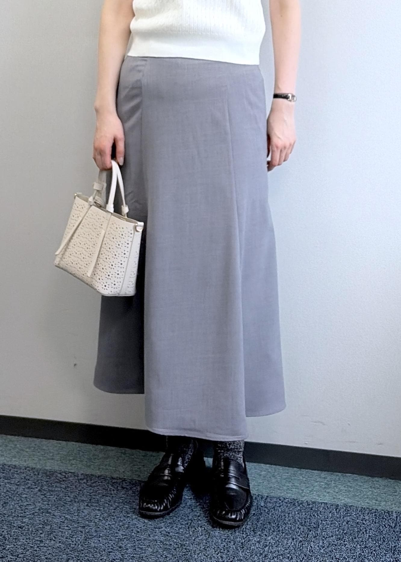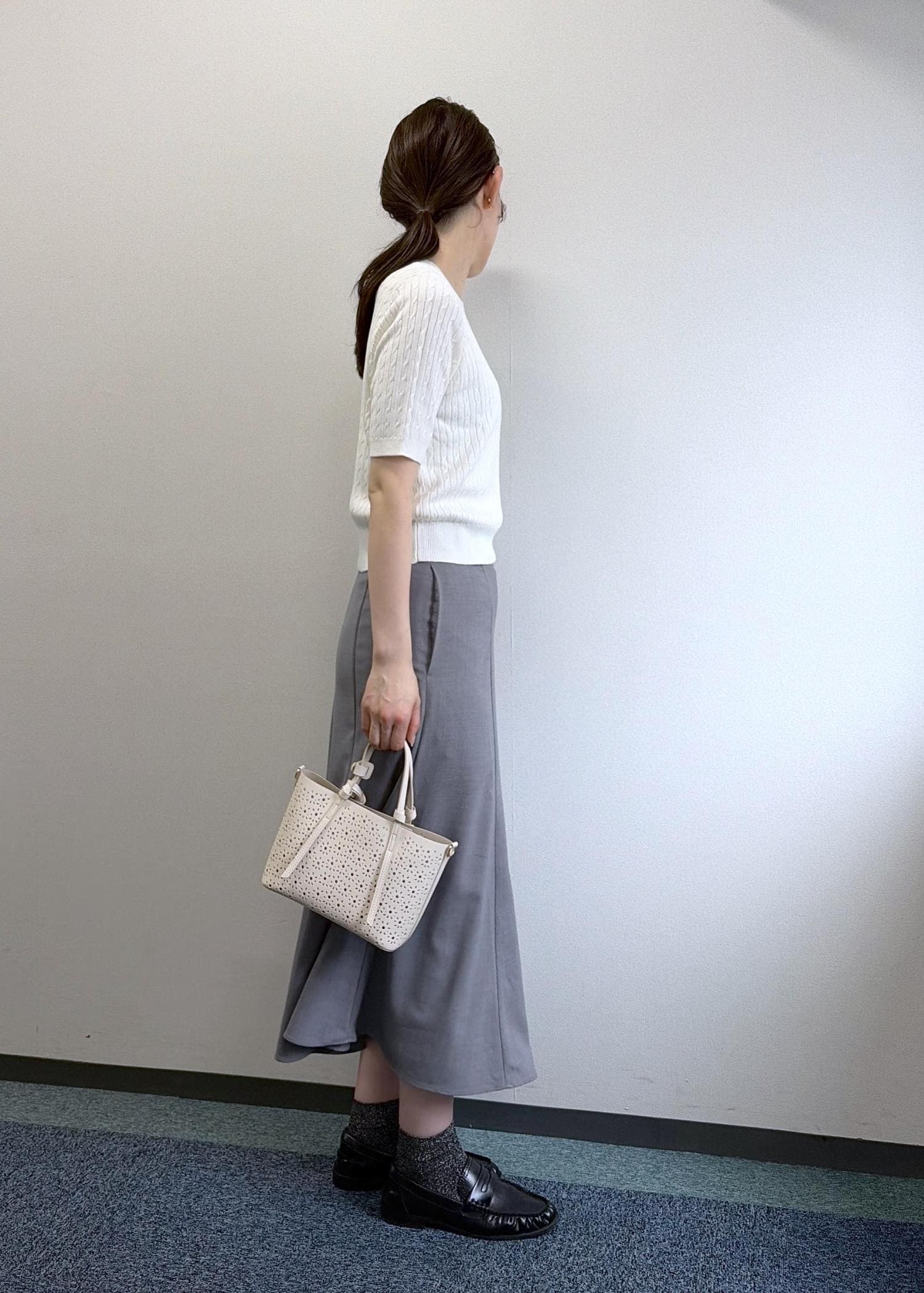 軽やかな素材なのにきちんと見えするスカートはオンオフ、シーンを選びません。マーメイドシルエットが女性らしく、スタイルアップにもなるデザインです♫