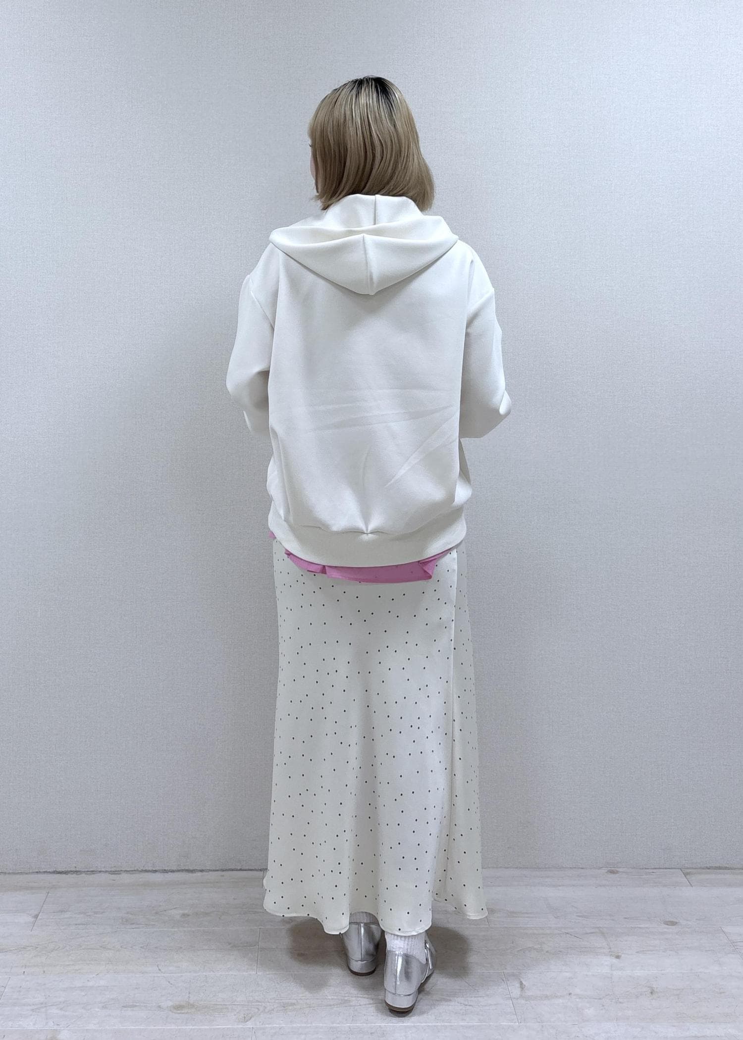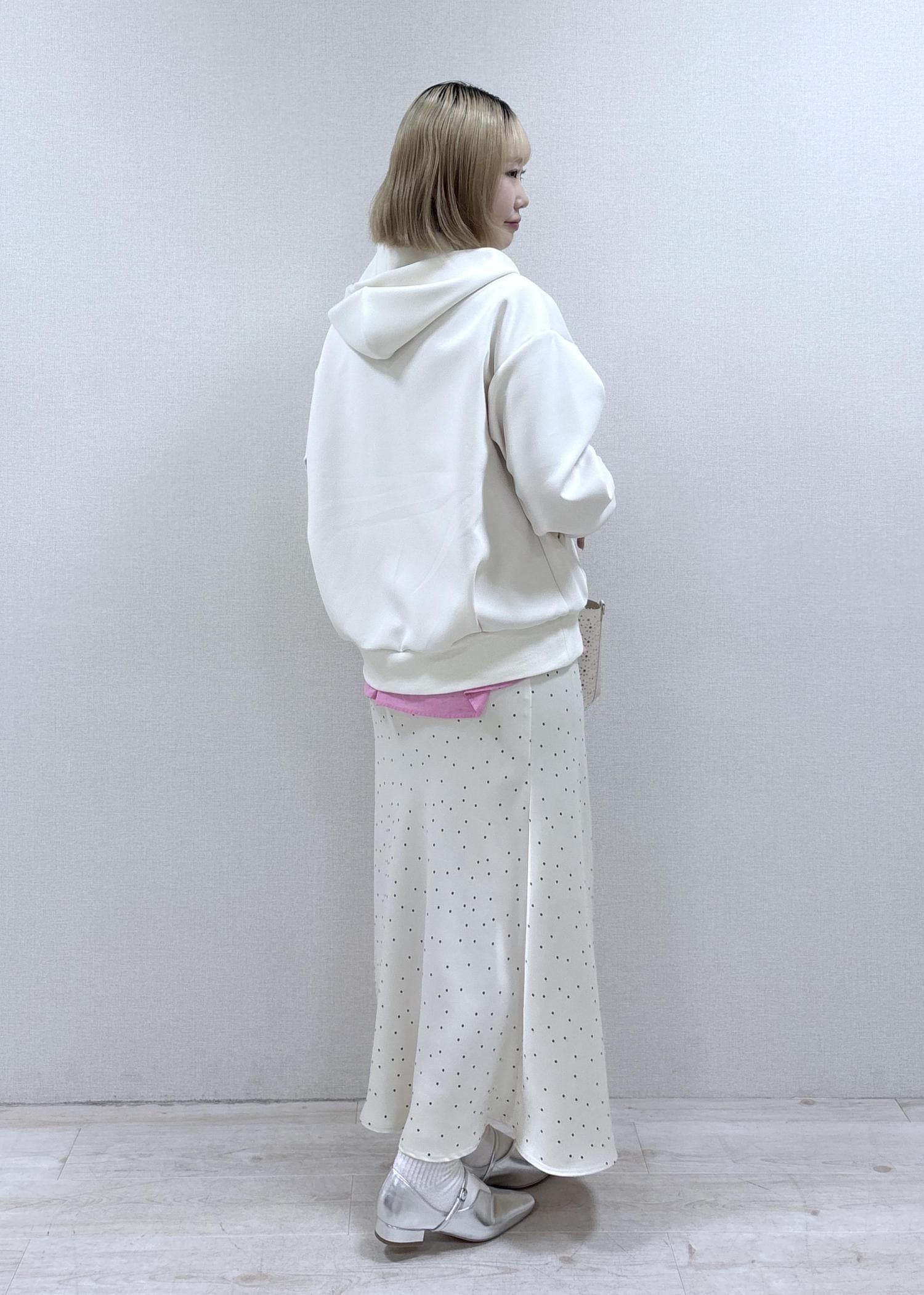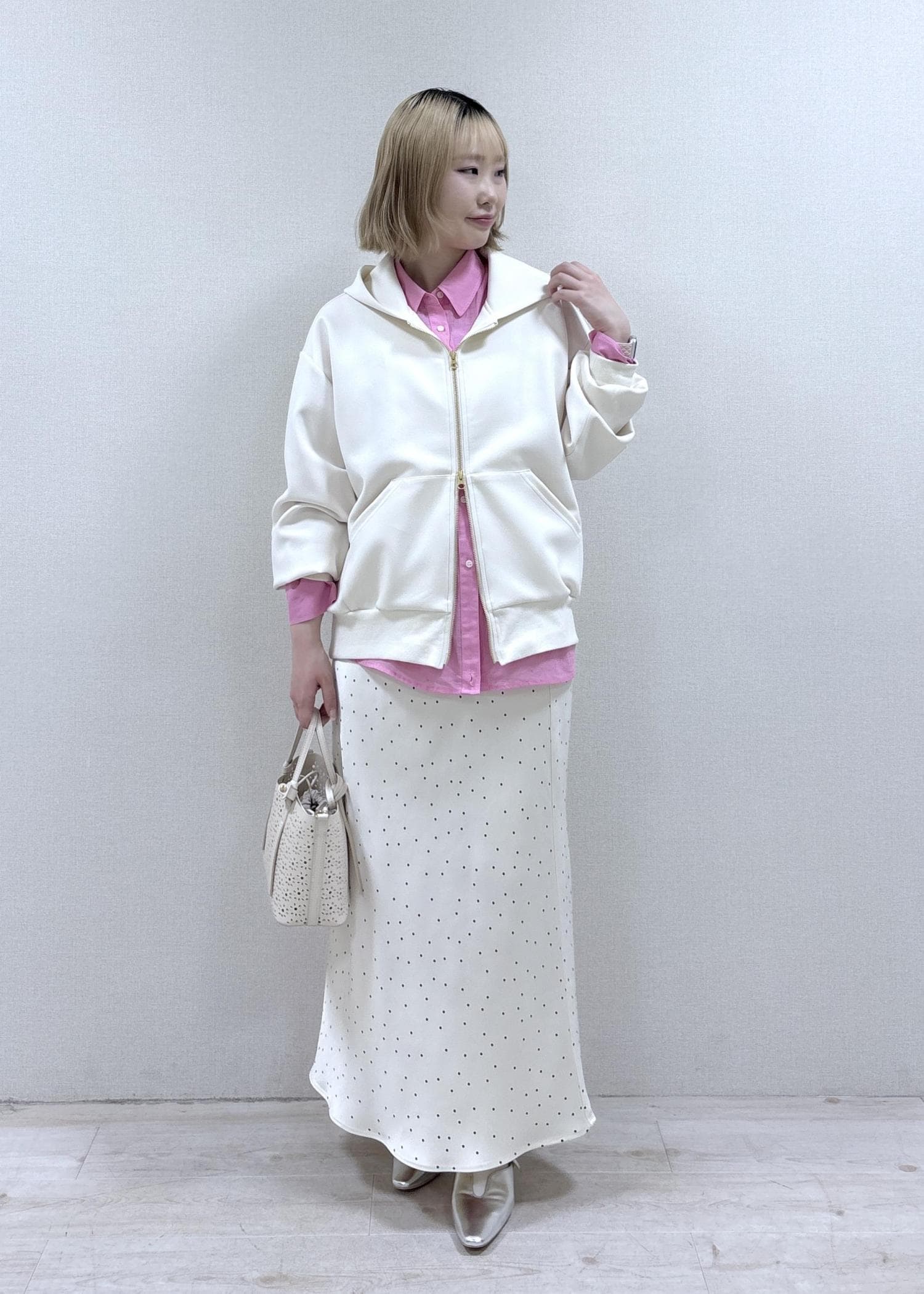 カジュアルになりすぎないよう、サテンスカートを合わせ女性らしさをプラスしました。