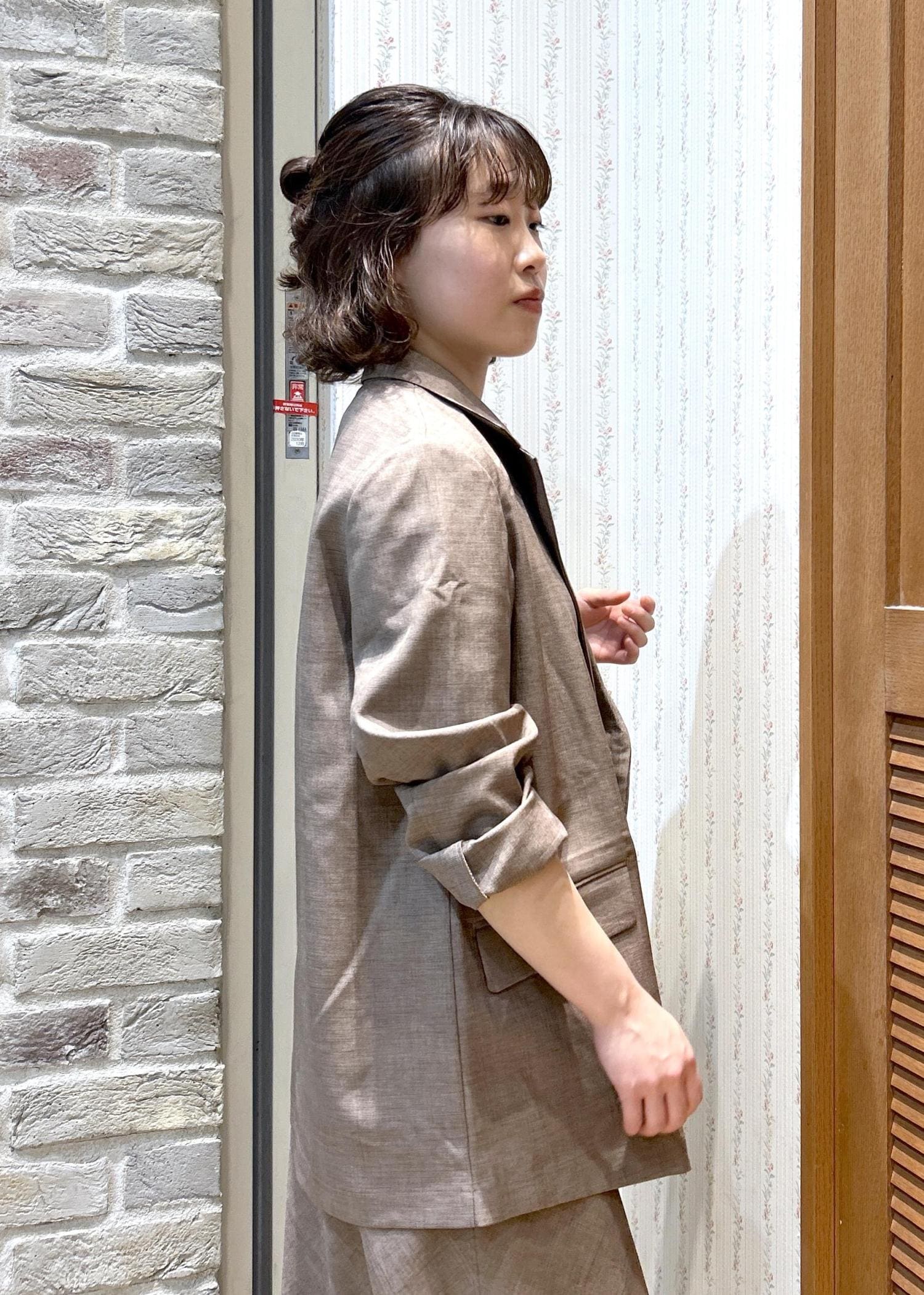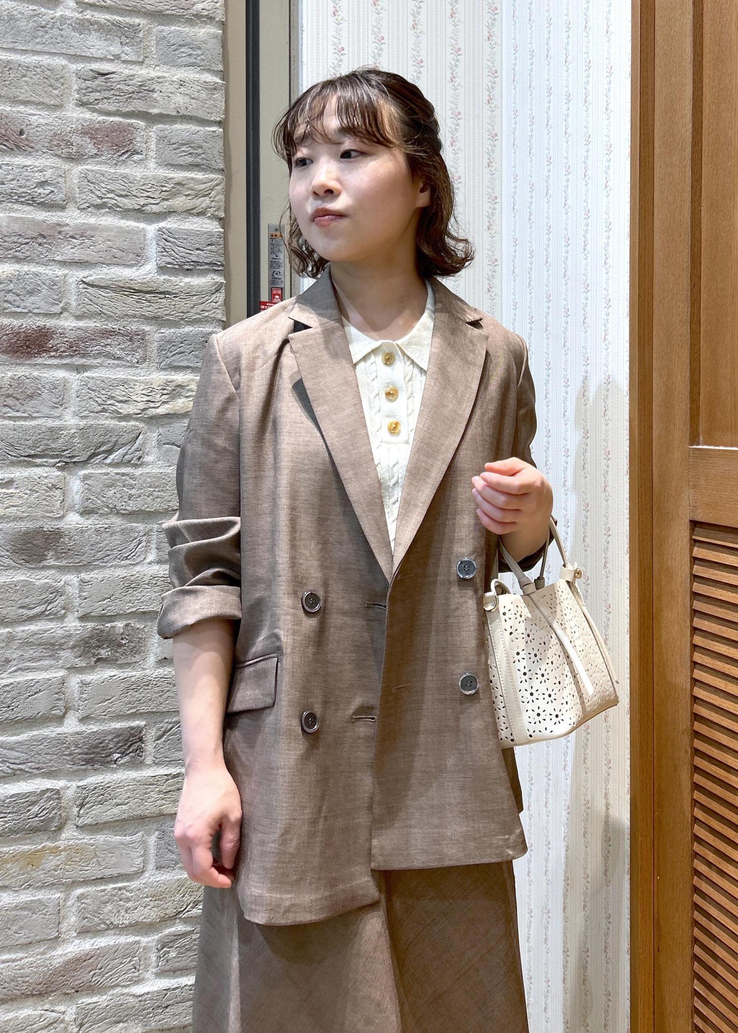 メランジドビーチェックシリーズをセットアップで着用してみました。ジャケットのインナーはポロカラーケーブルニットで、ジャケットを脱いでも可愛いスタイリングです!
