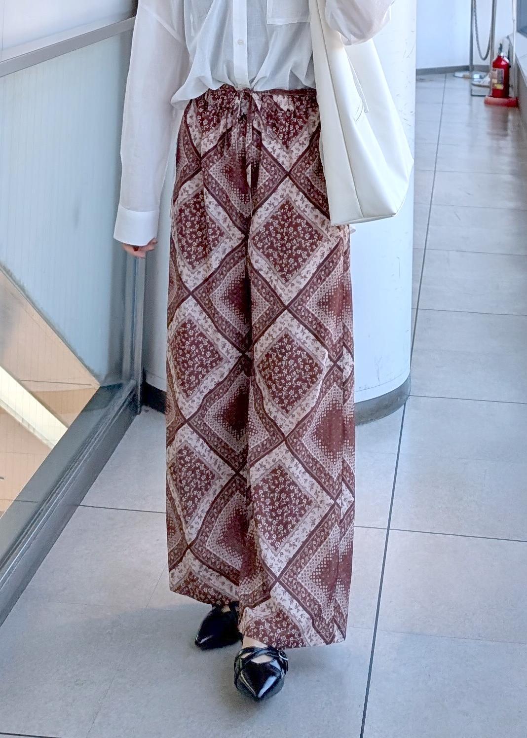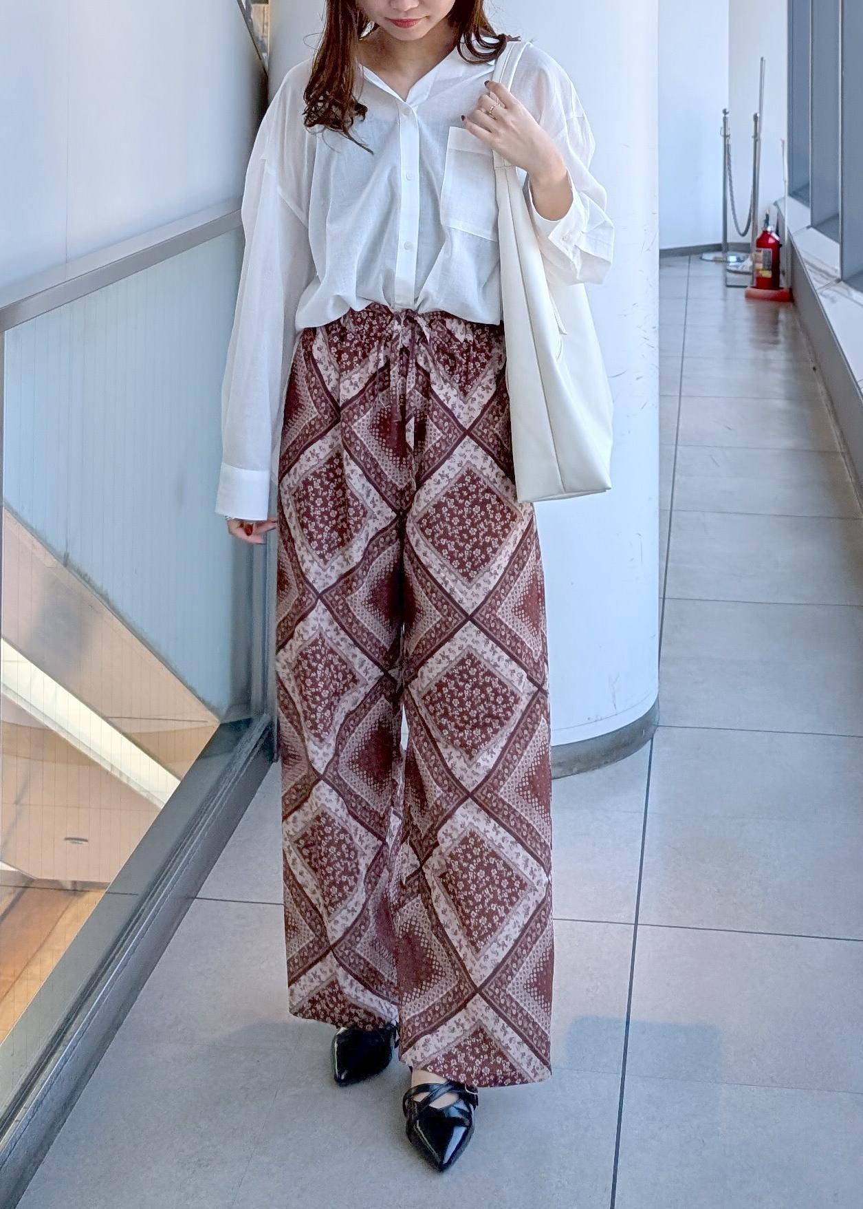 綿素材でこれからの時期にぴったりなシャツにスカーフ柄が印象的なパンツを合わせたコーデに。