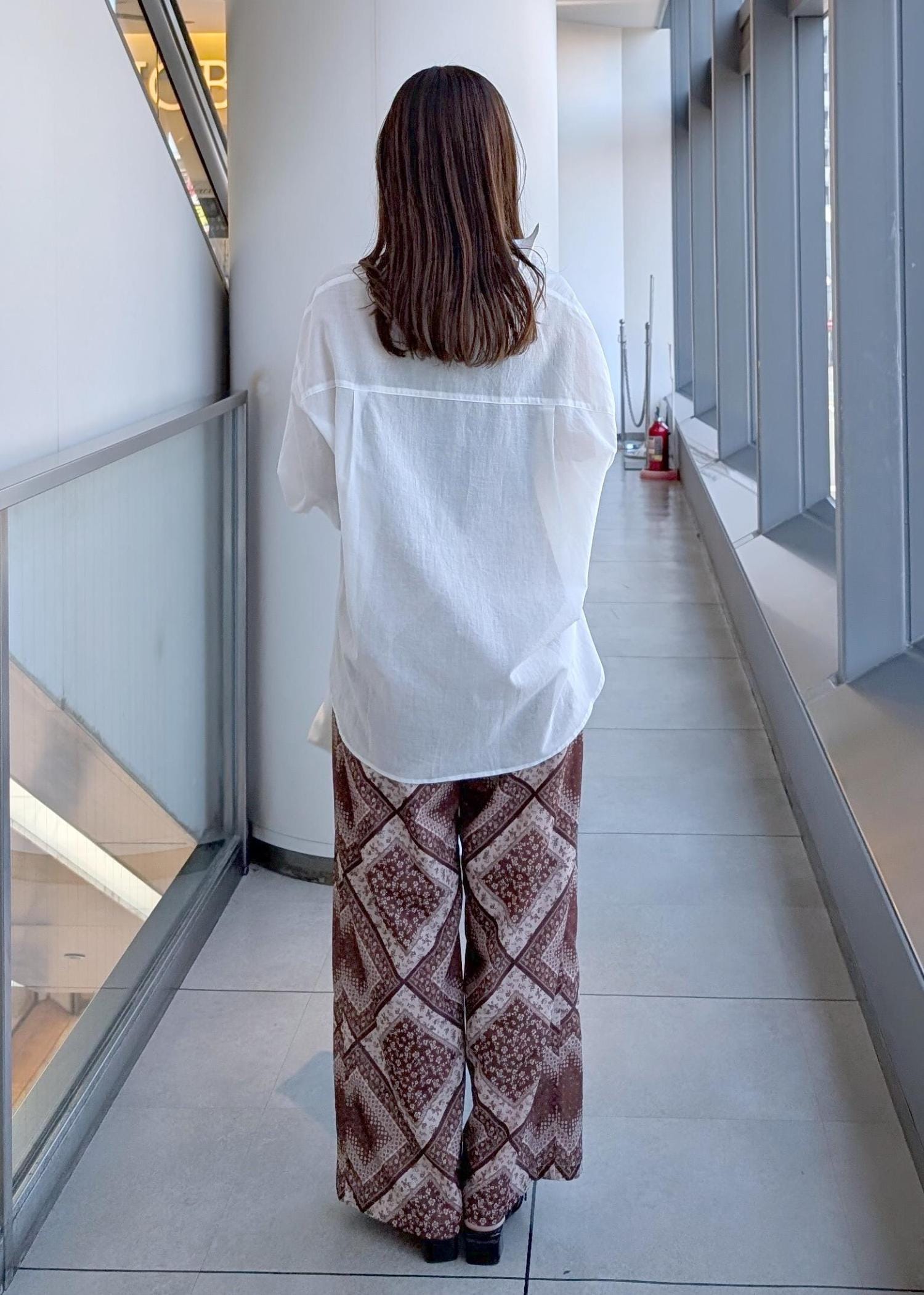 綿素材シャツ×スカーフ柄パンツ
