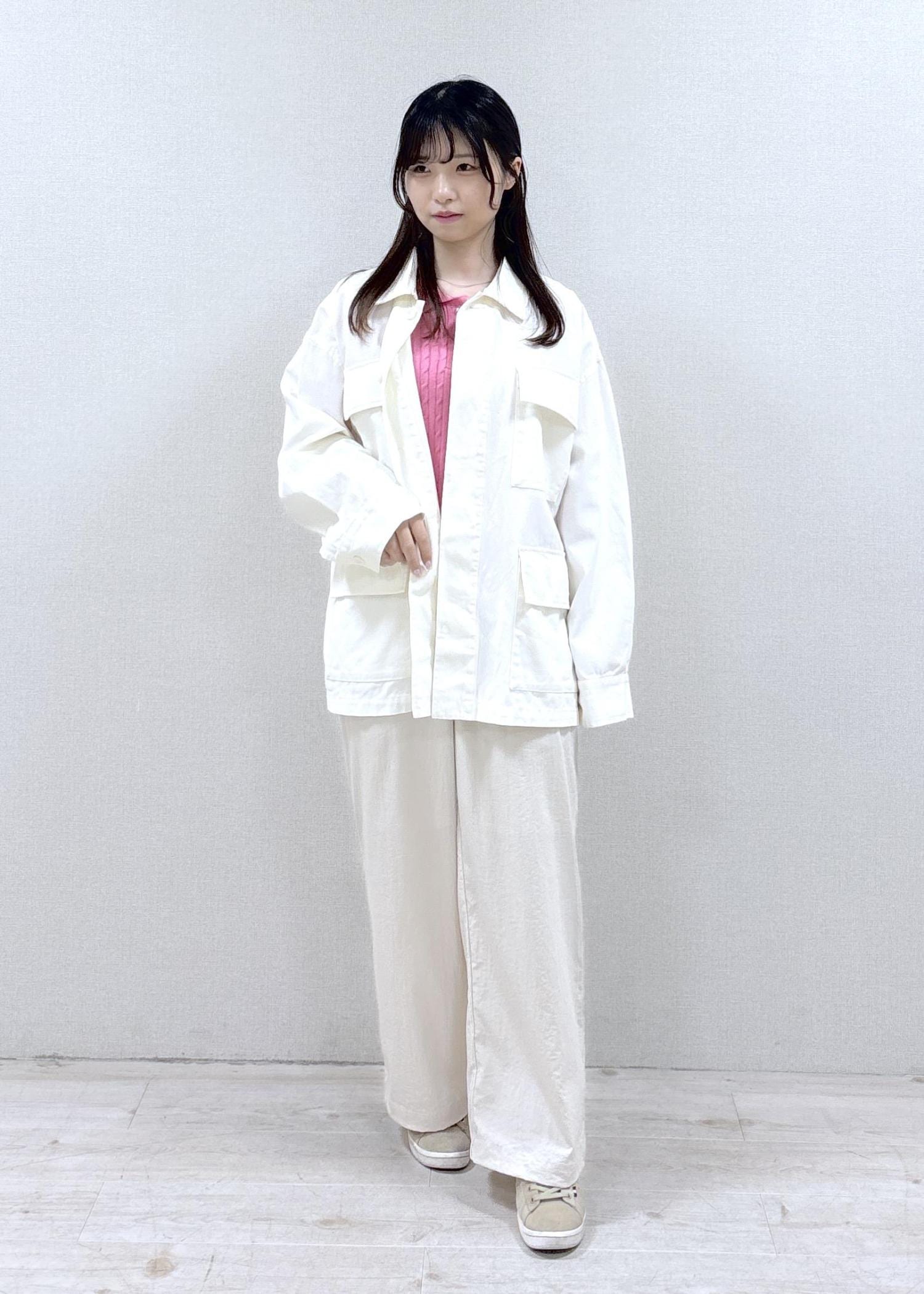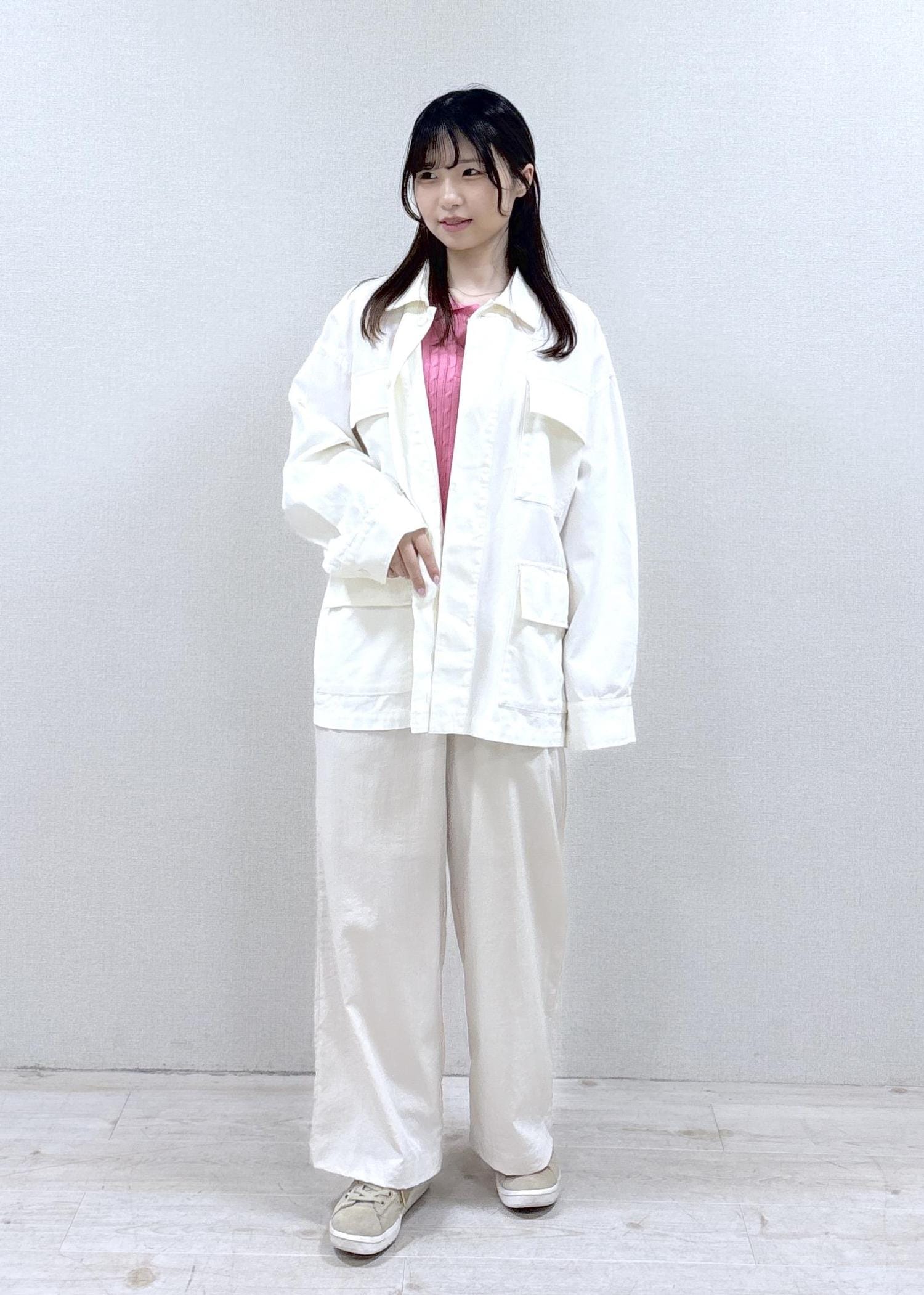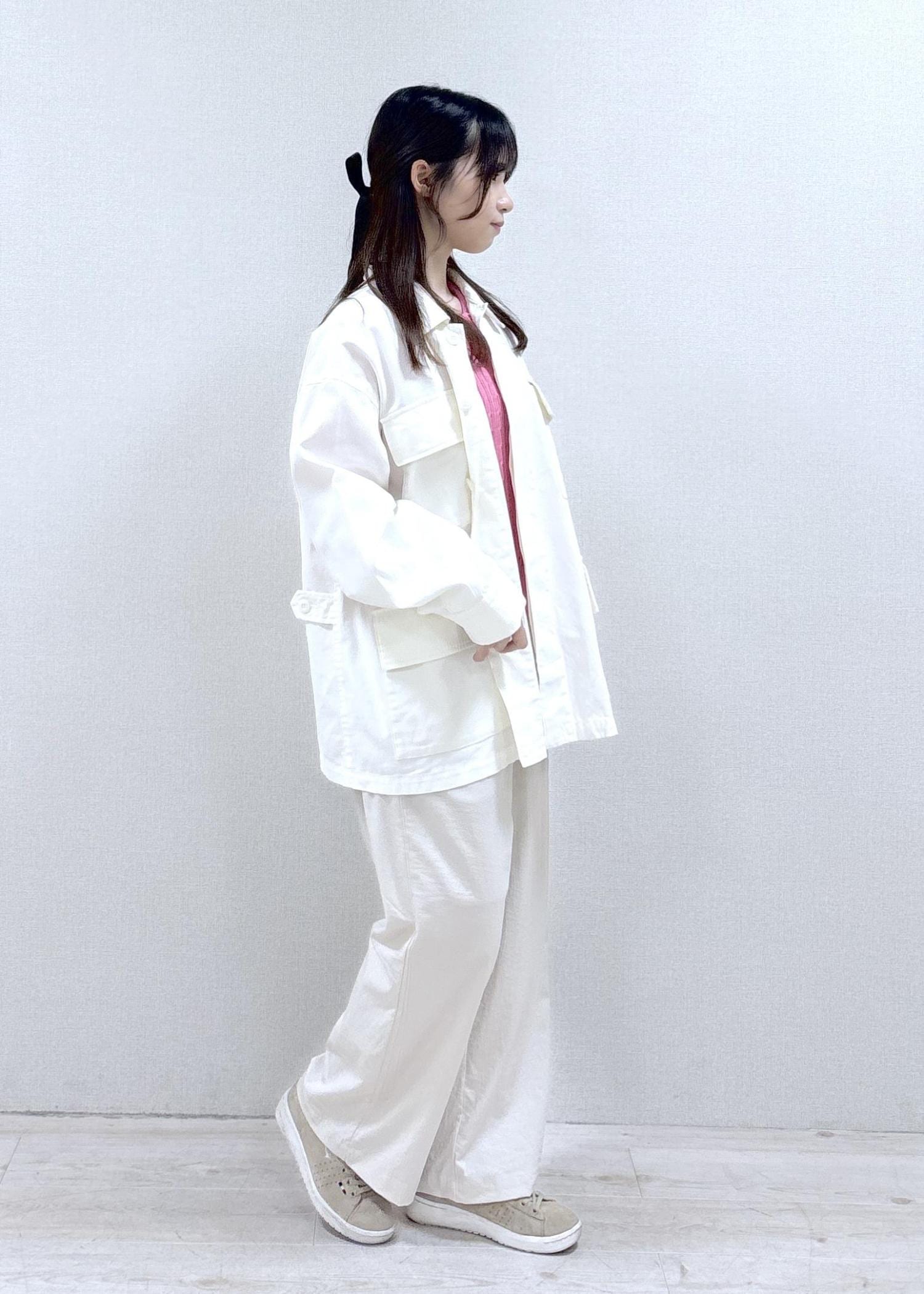 ホワイトを基調にしてフレッシュなピンクを差し色に入れた少しラフなコーディネートです。