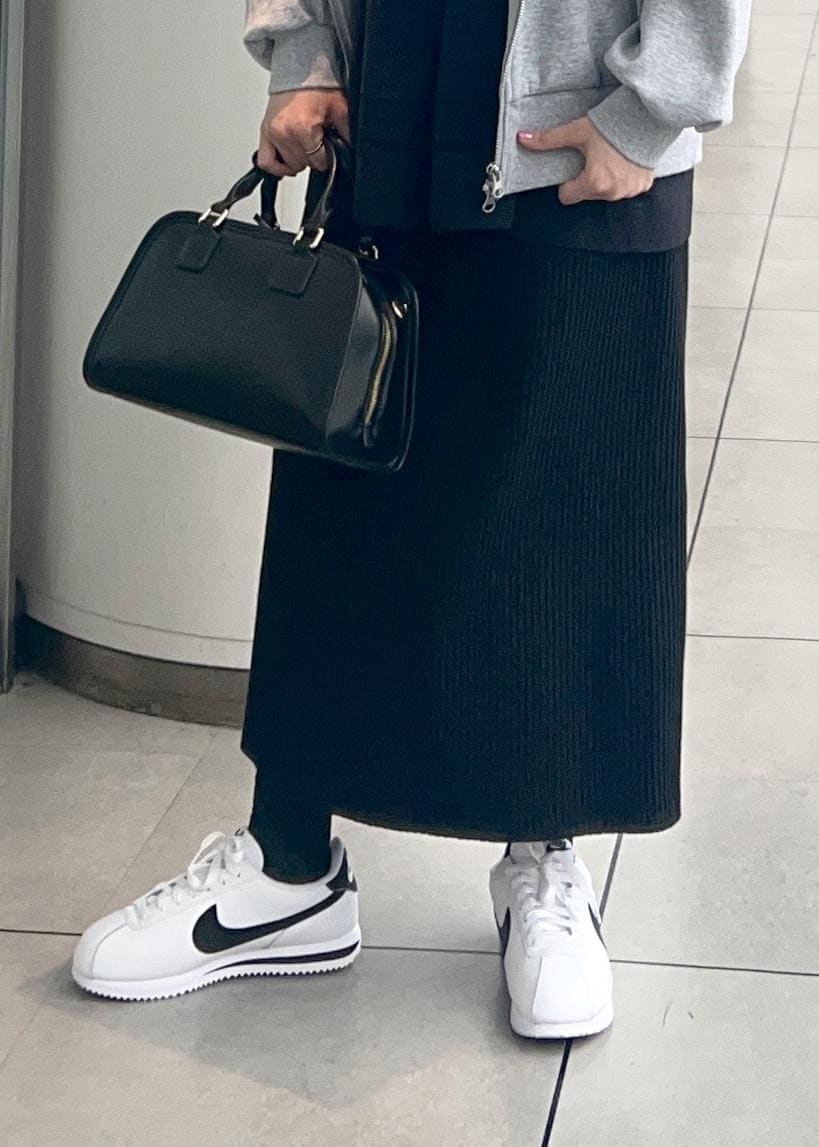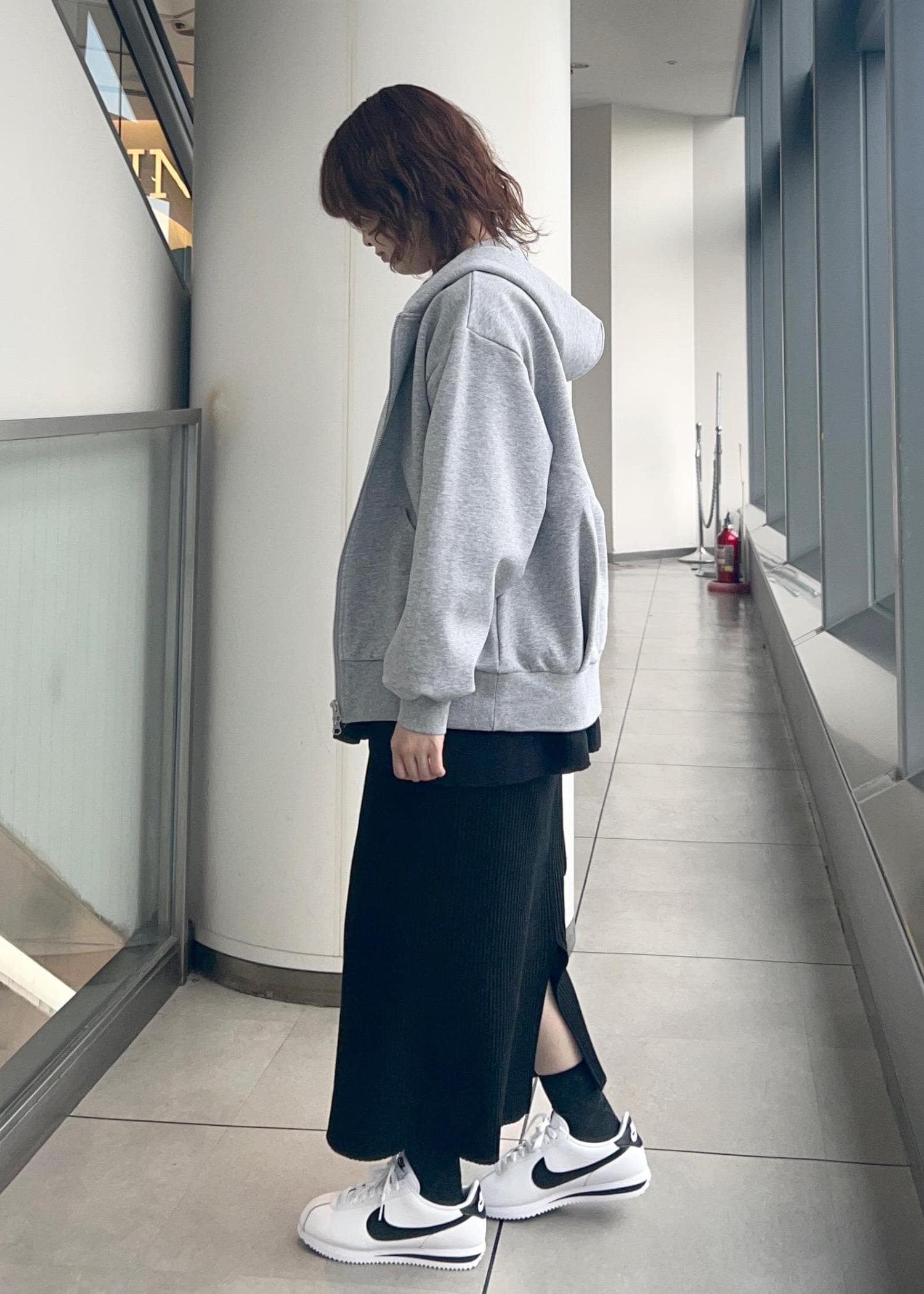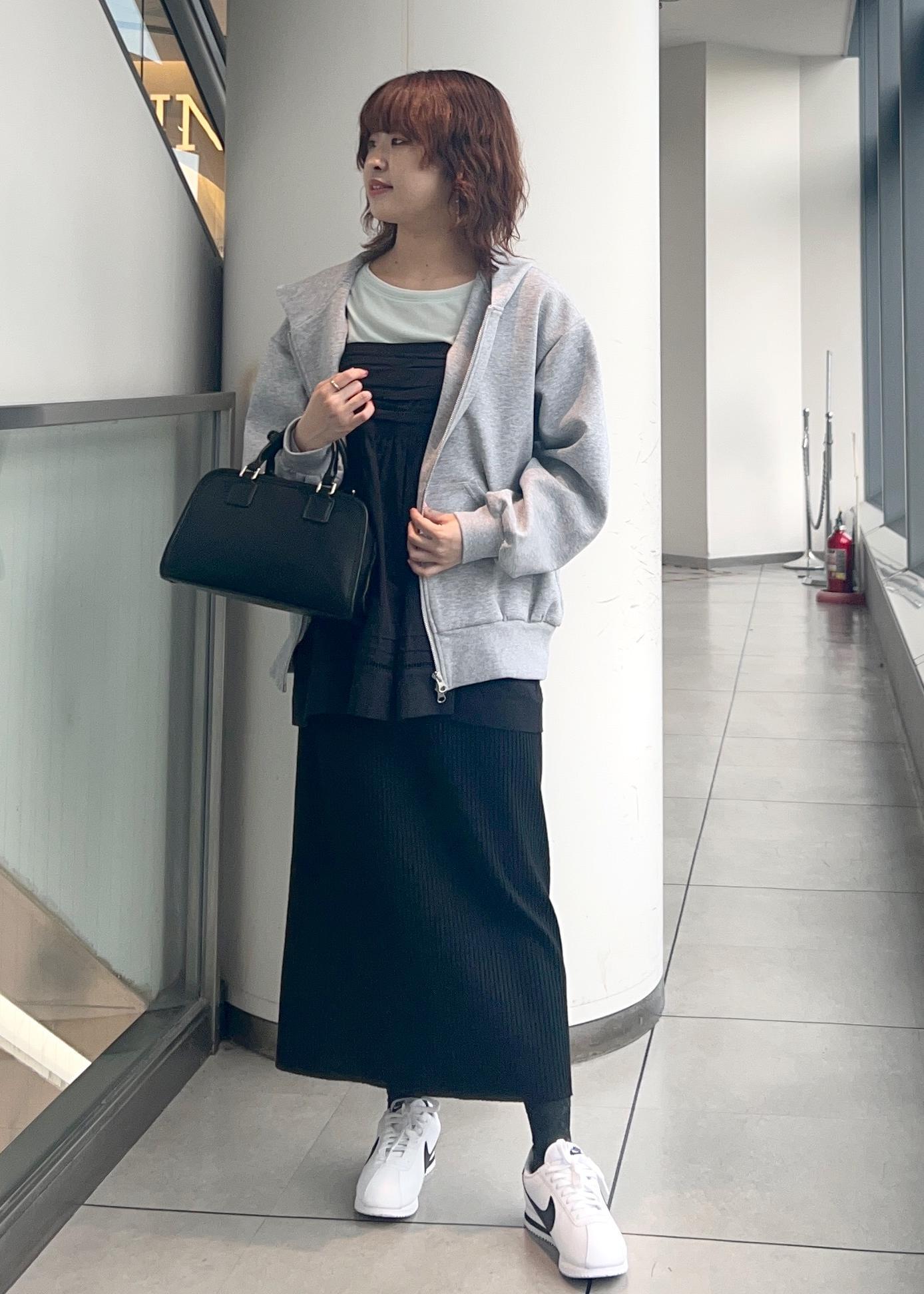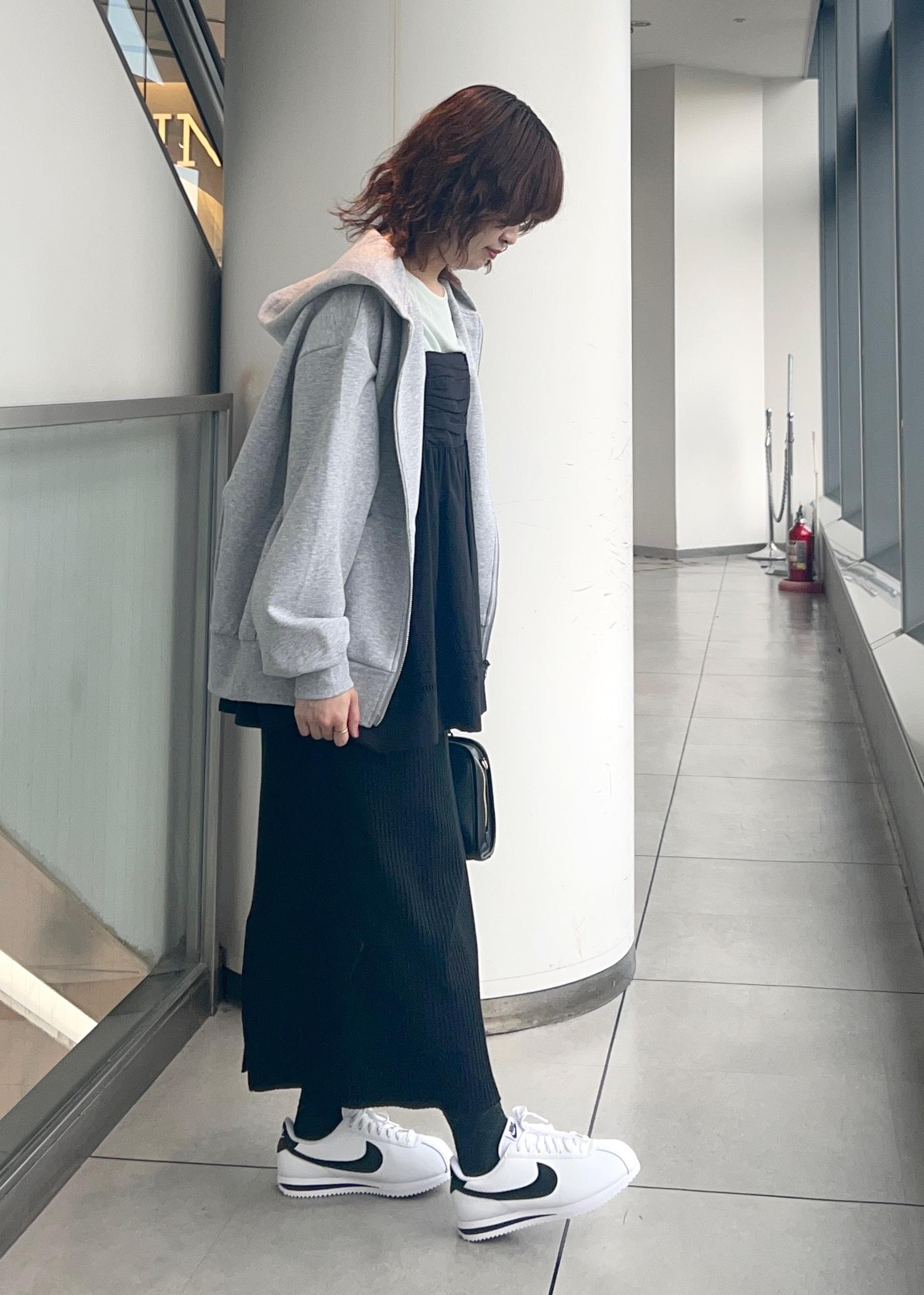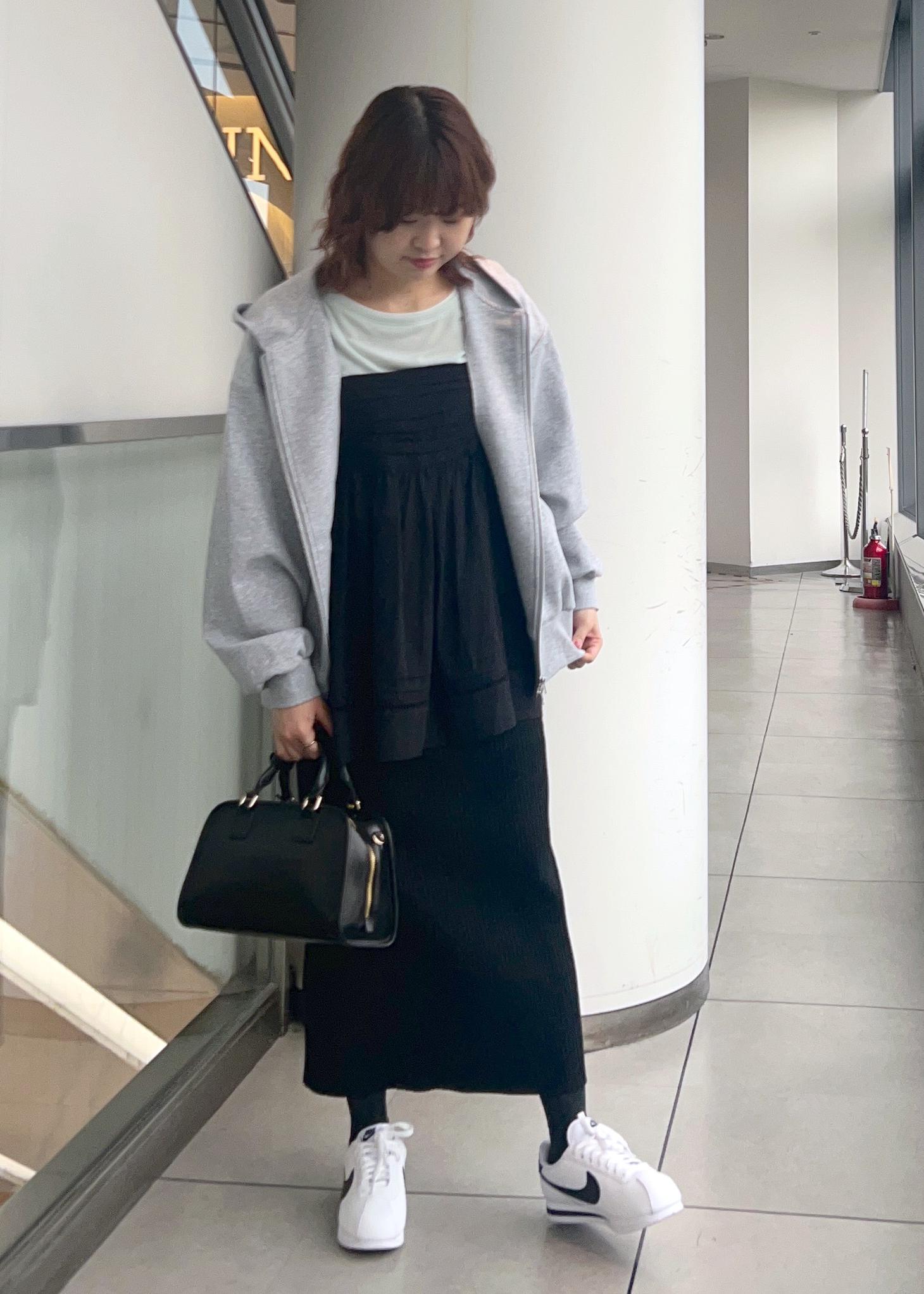 スニーカーとスカートを合わせカジュアルながらもきれいめを意識しました。