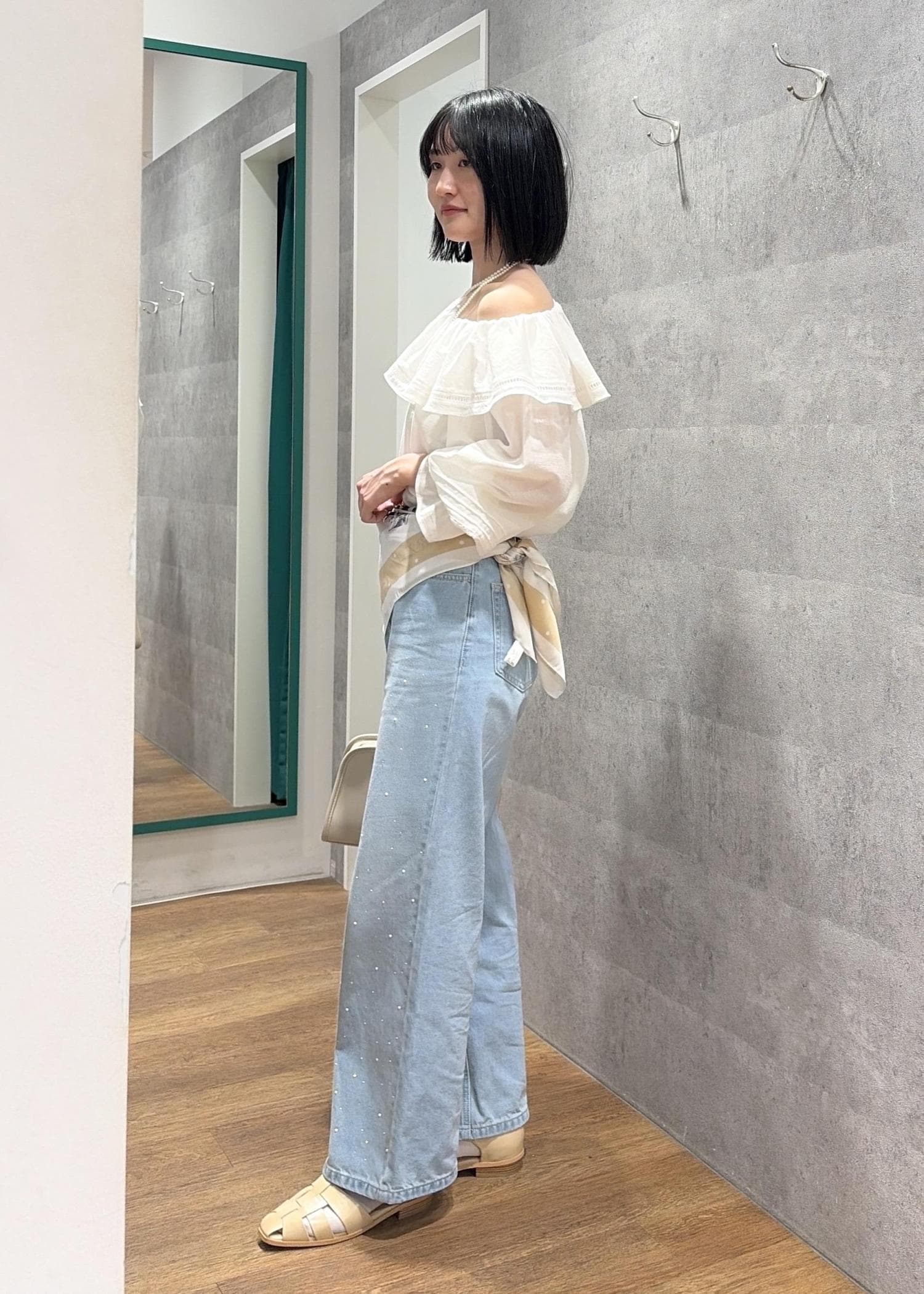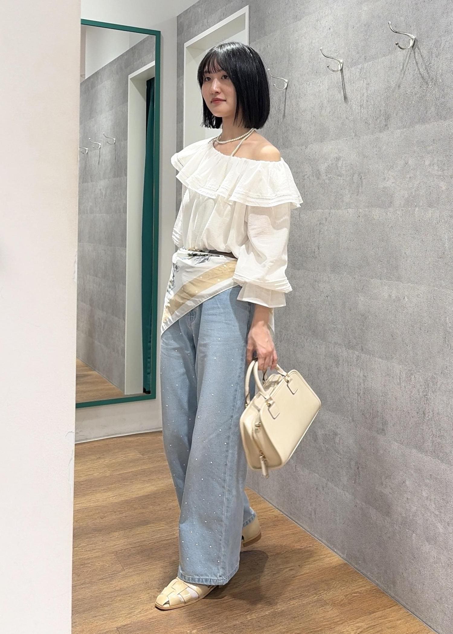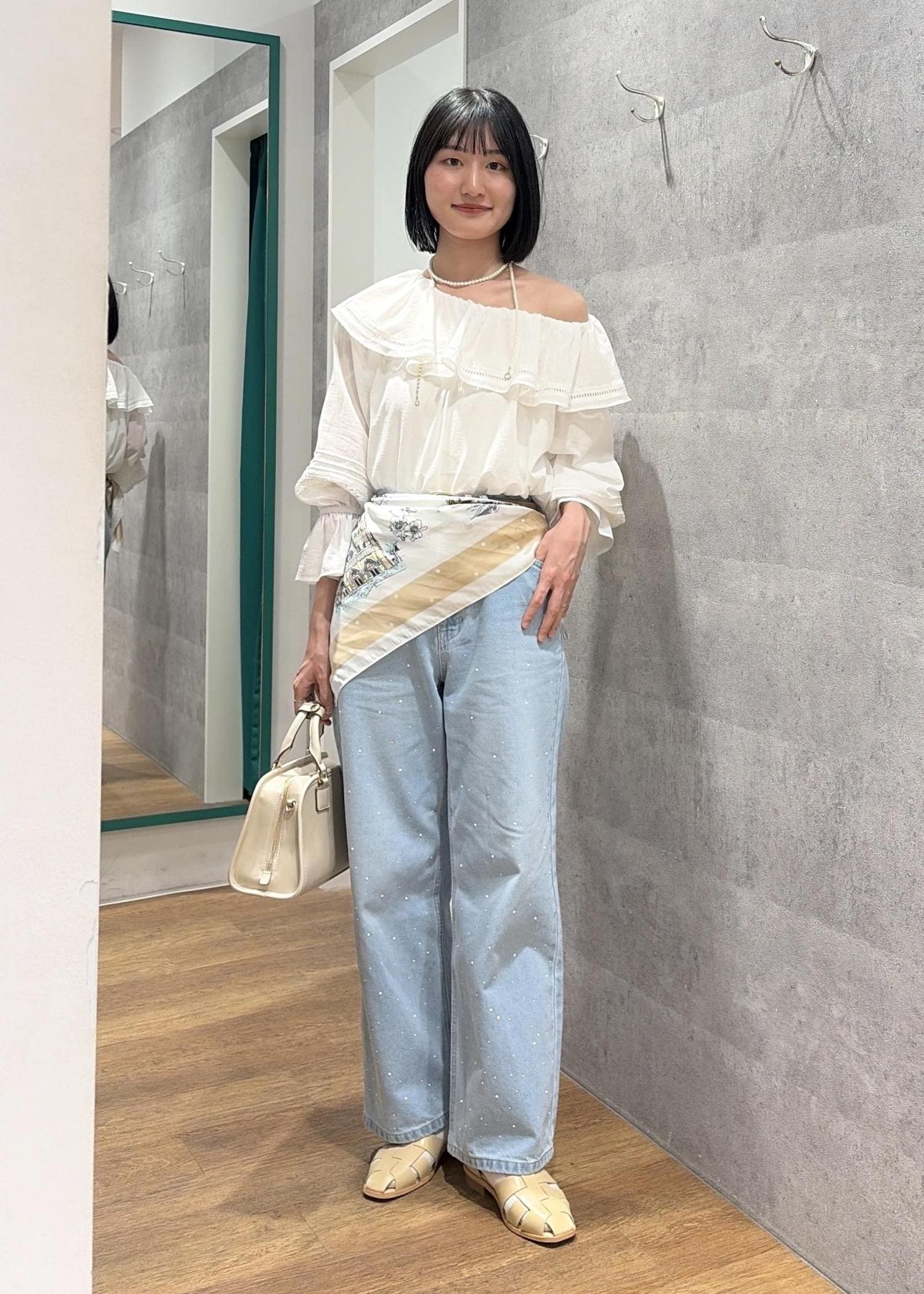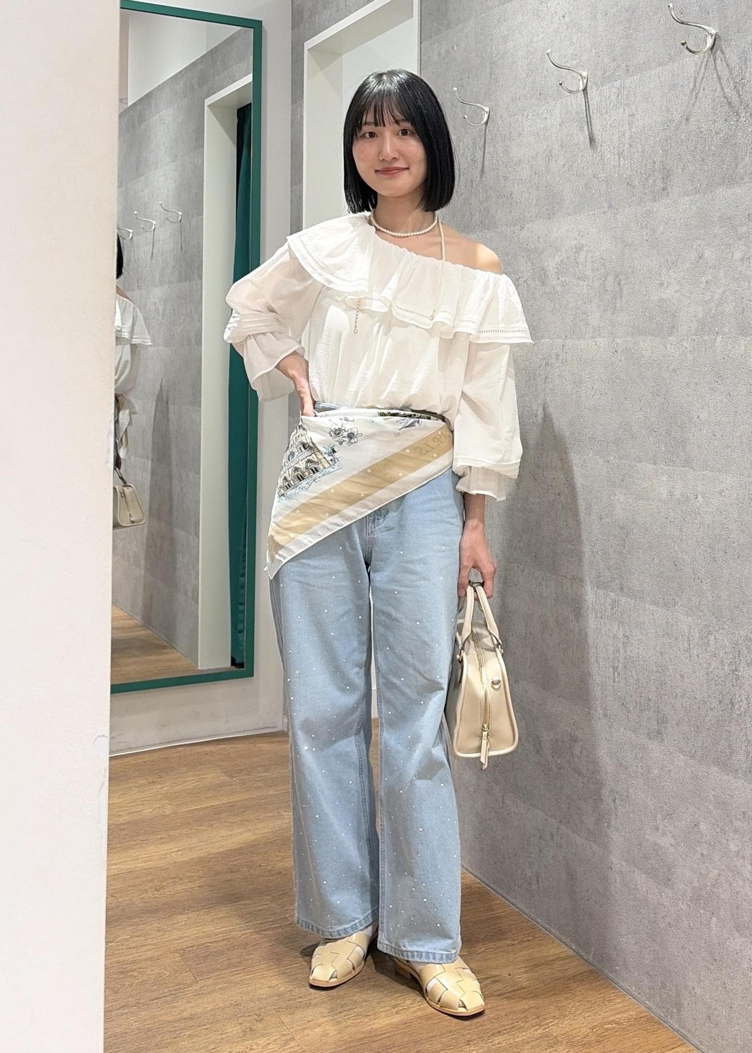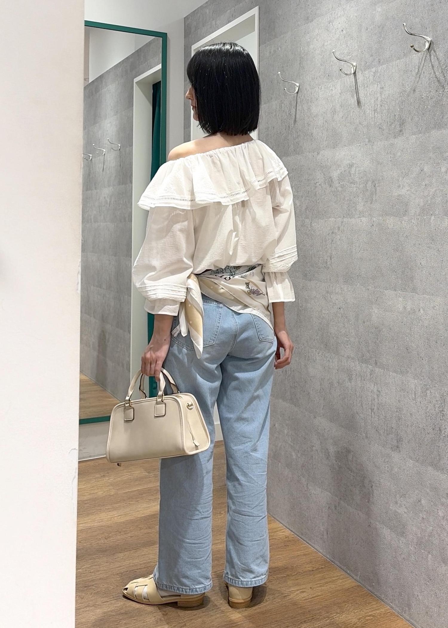 オフショルブラウス×大判スカーフ