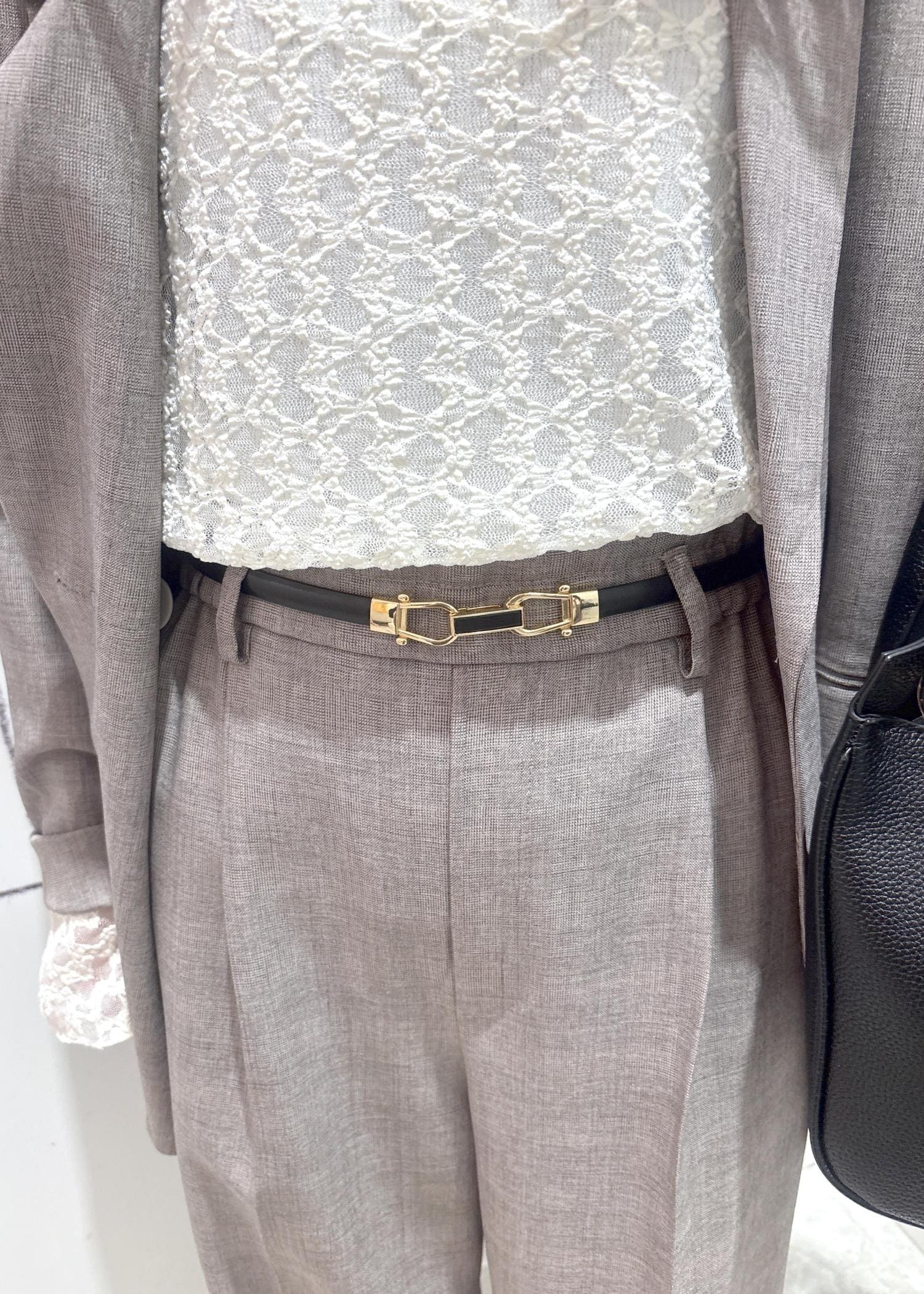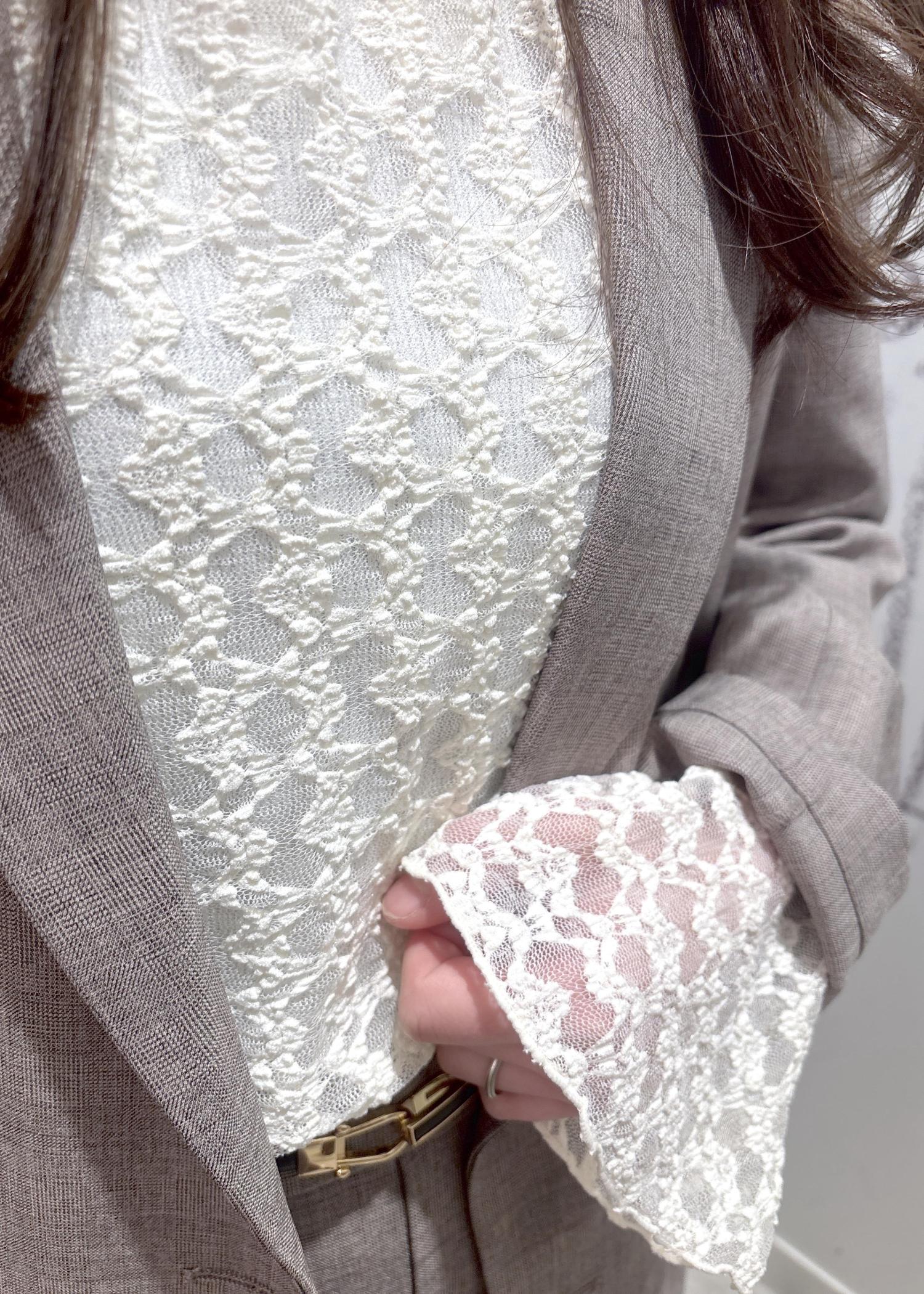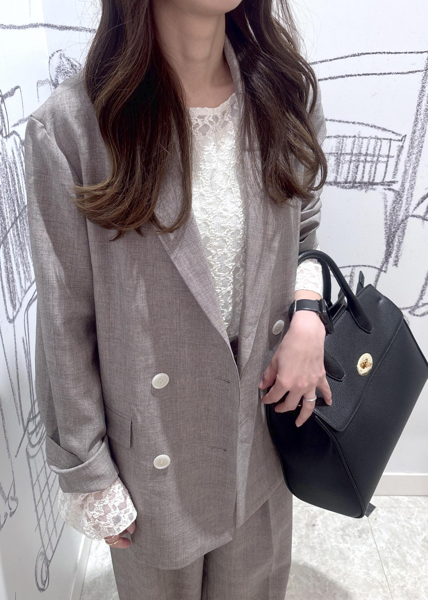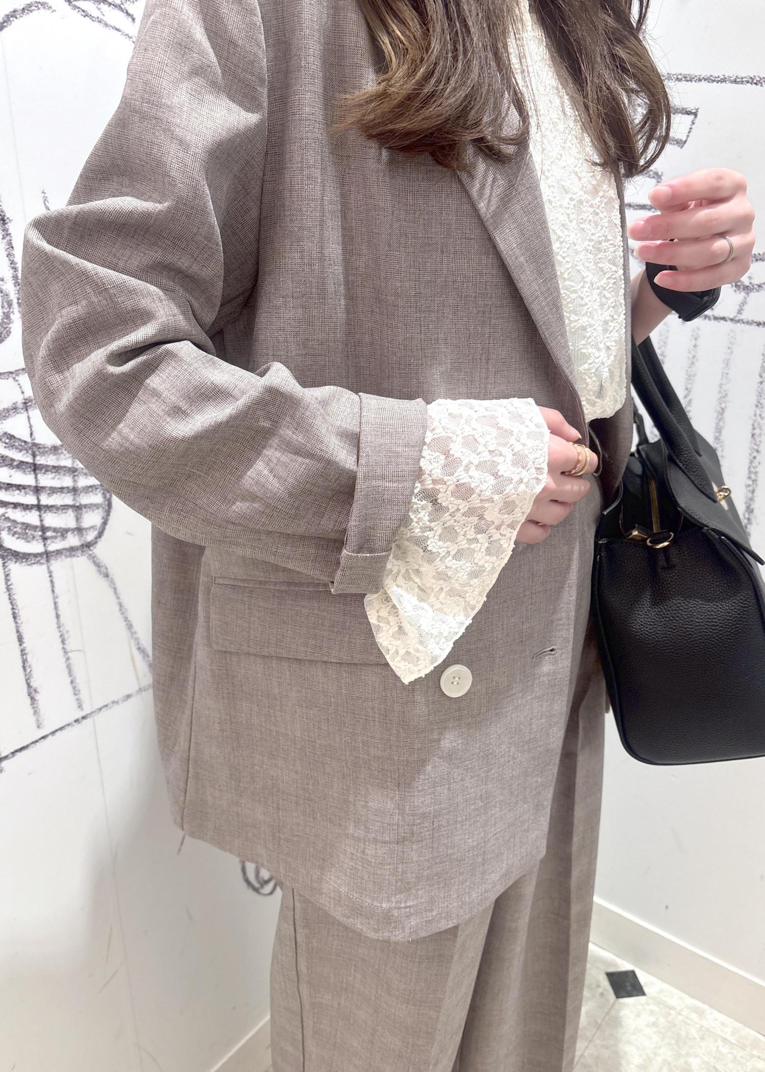 ハンサムなスタイルなのでインナーにレーストップスを合わせ女性らしさもプラスしました。