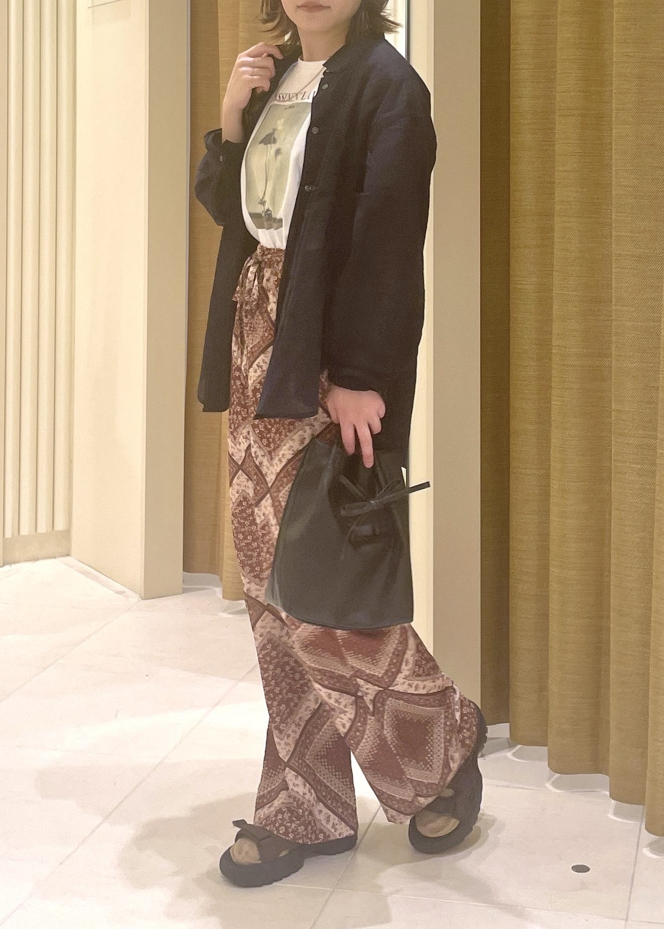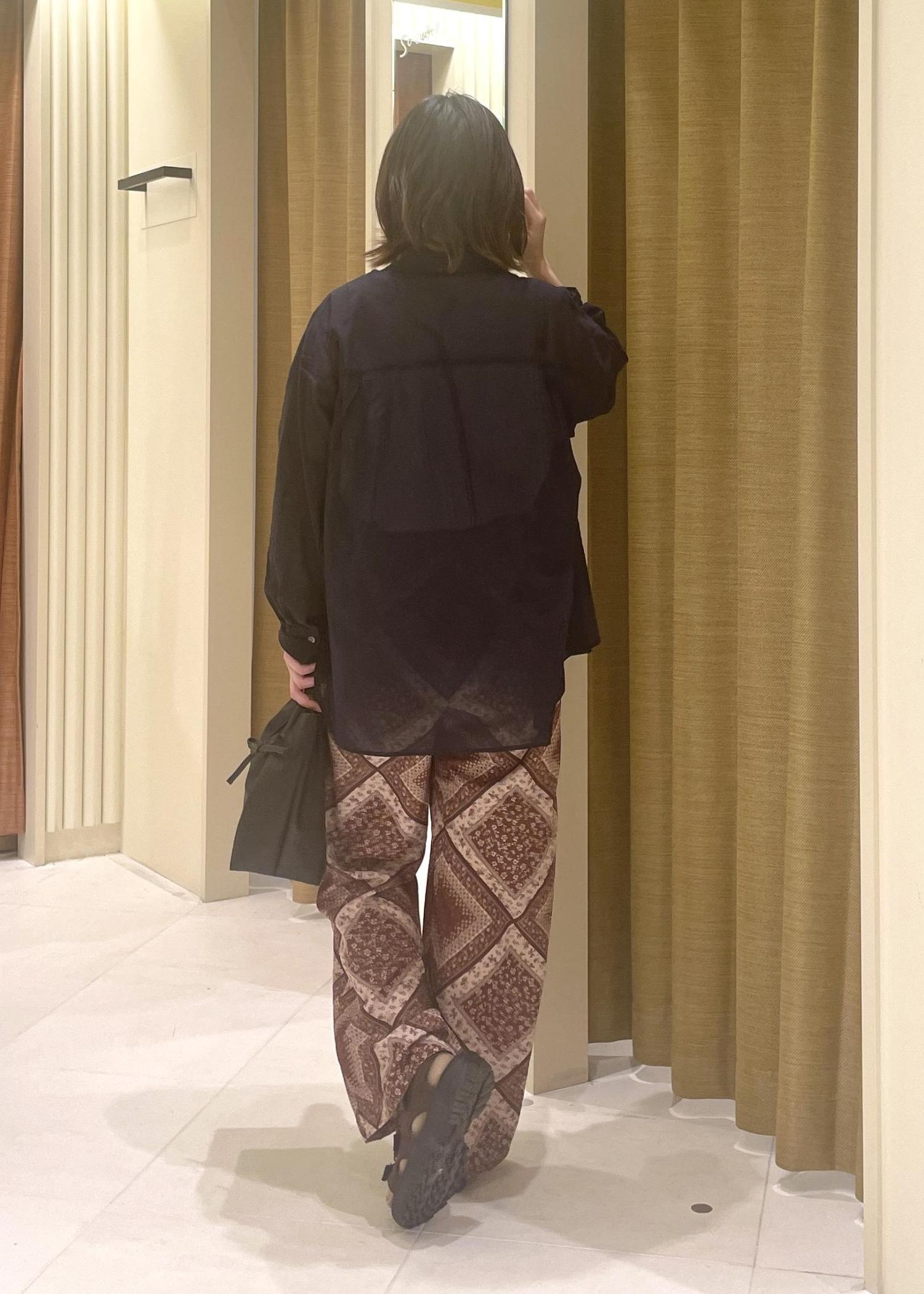 バンダナ柄のパンツを引き立たせるためにネイビーのシャツを合わせたのがポイントです。