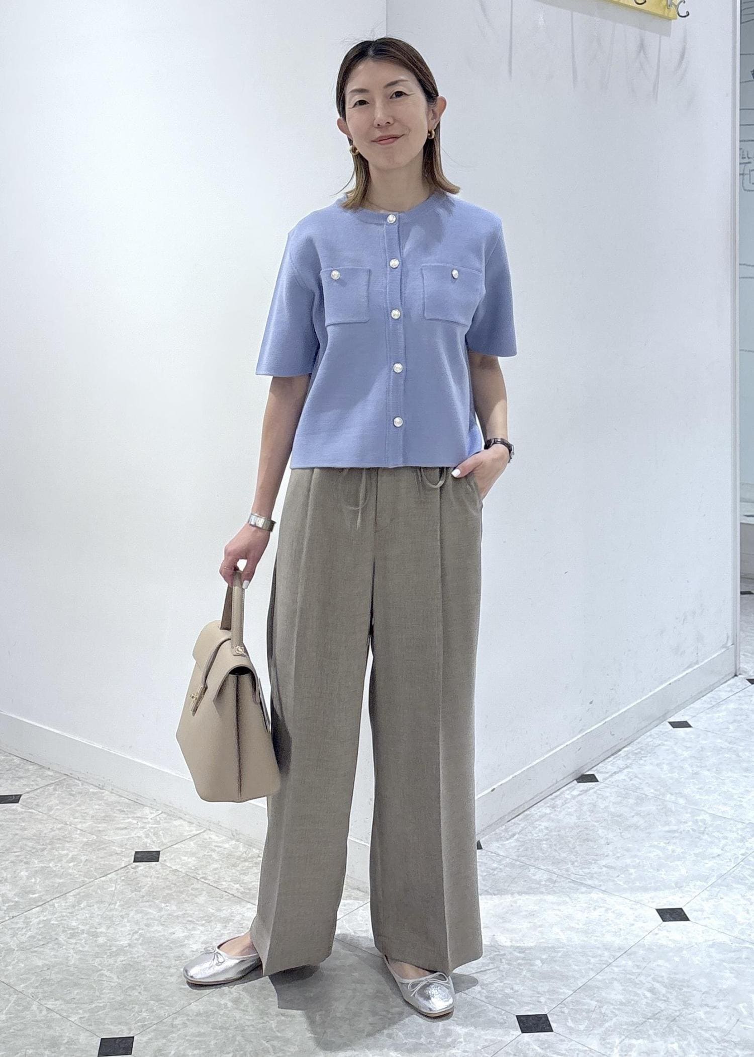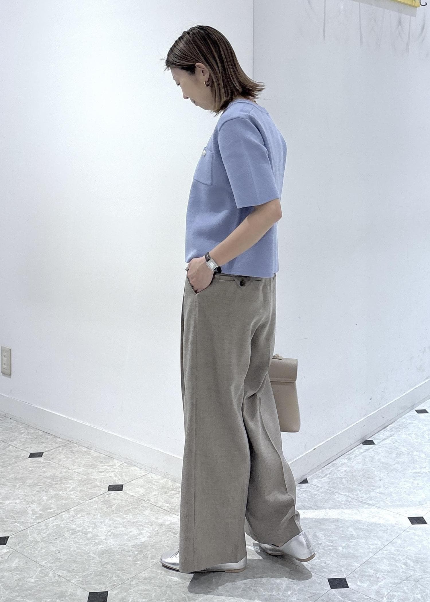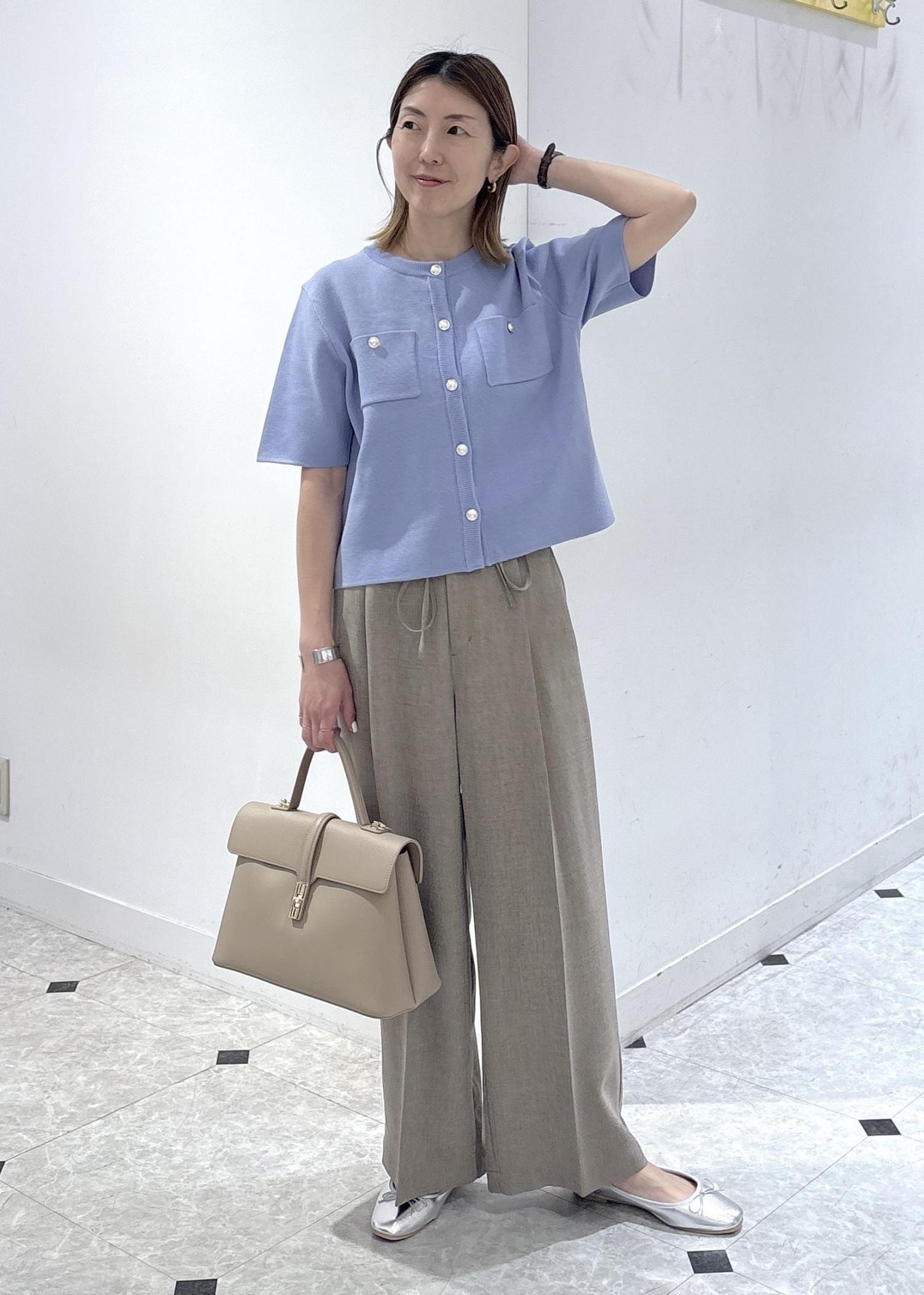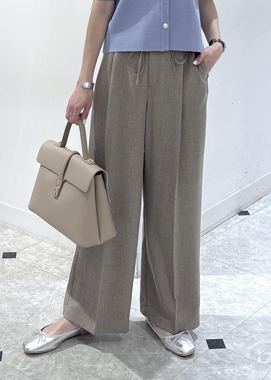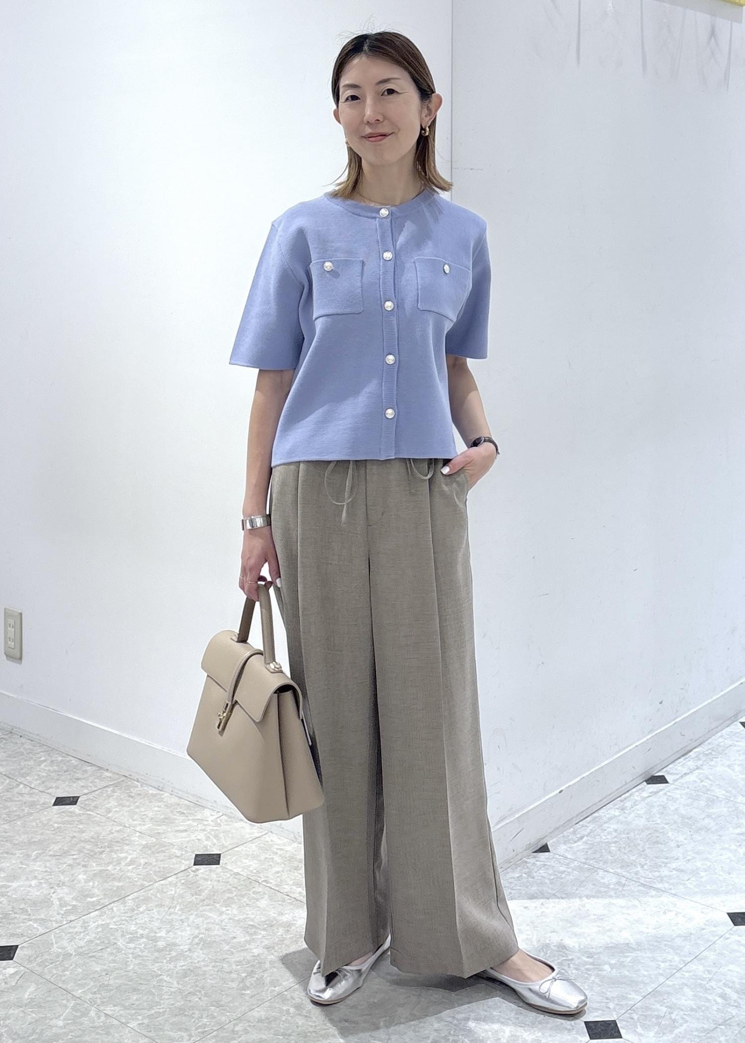 ドライタッチのワイドパンツを合わせて初夏に快適に過ごせるお仕事スタイリングです。