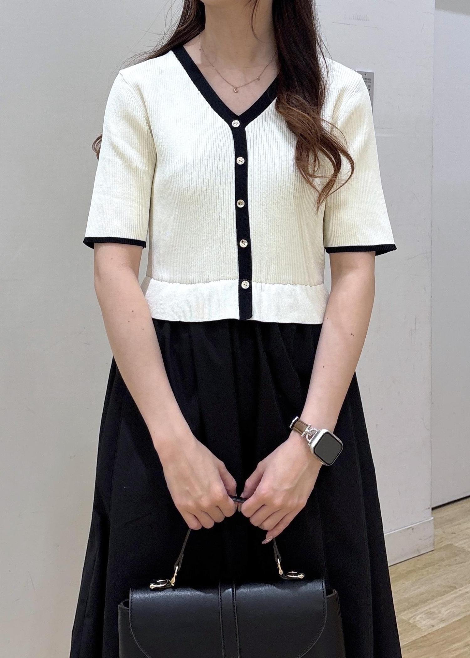 2BUY10%OFFROPÉ PICNICメタル釦布帛ドッキングハーフスリーブニットワンピースキナリ系 / S¥7,491レビューニットの部分はぴたっとしたシルエットです!