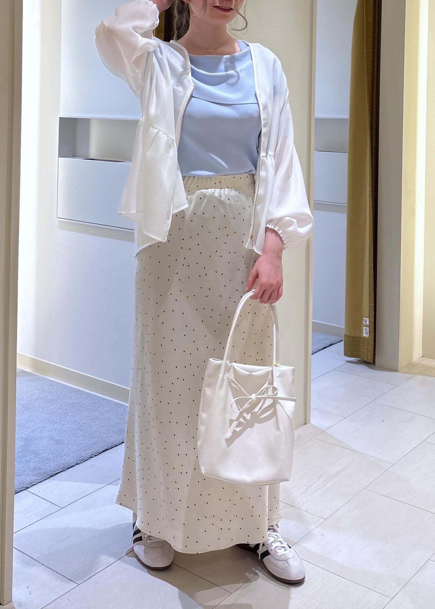 ROPÉ PICNIC細見えバイアスサテンドットスカートキナリ系 / F¥6,490レビュー小ぶりの水玉になので大人っぽく着こなせます。シルエットも女性らしく光沢感もあり上品な印象になります。