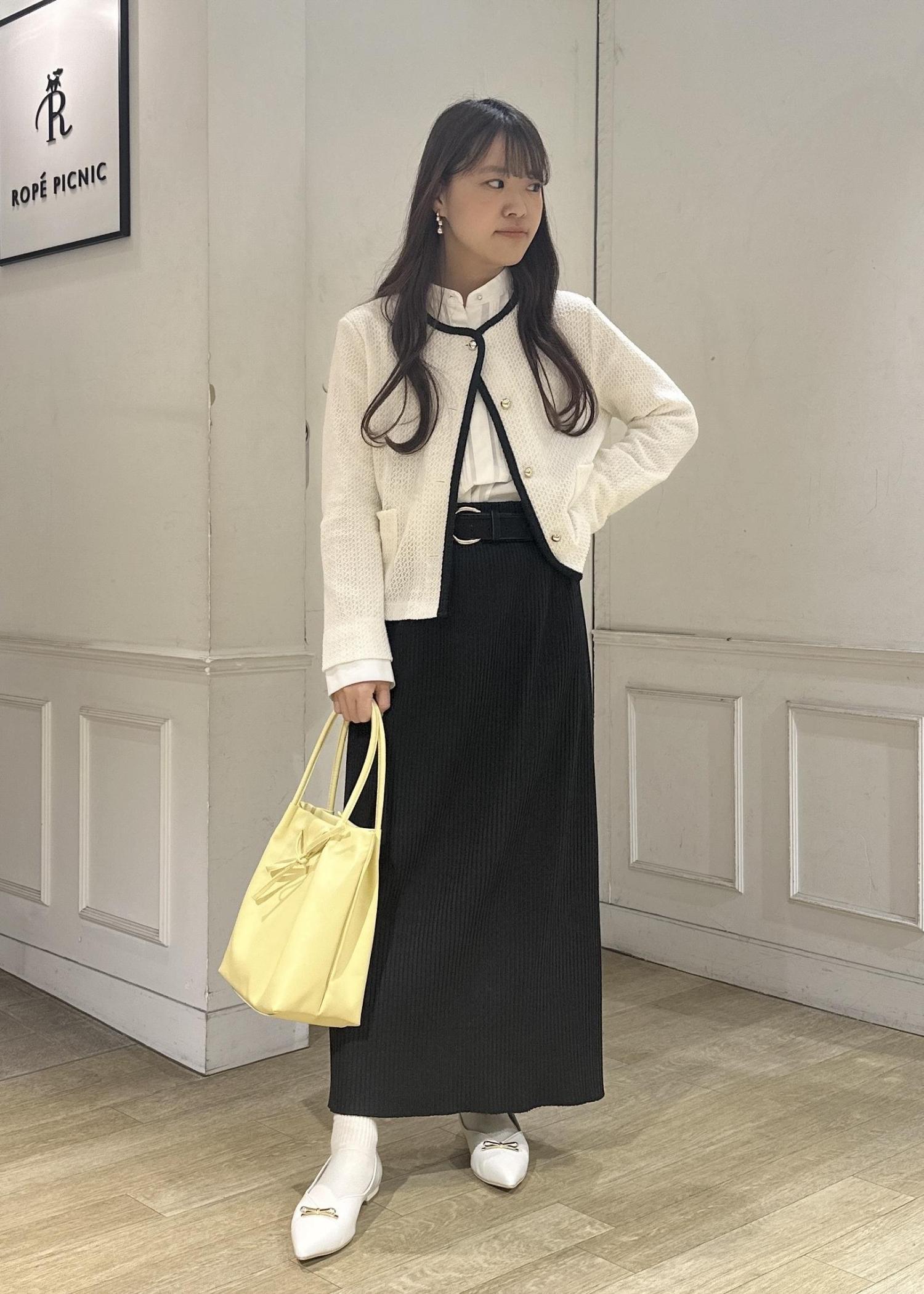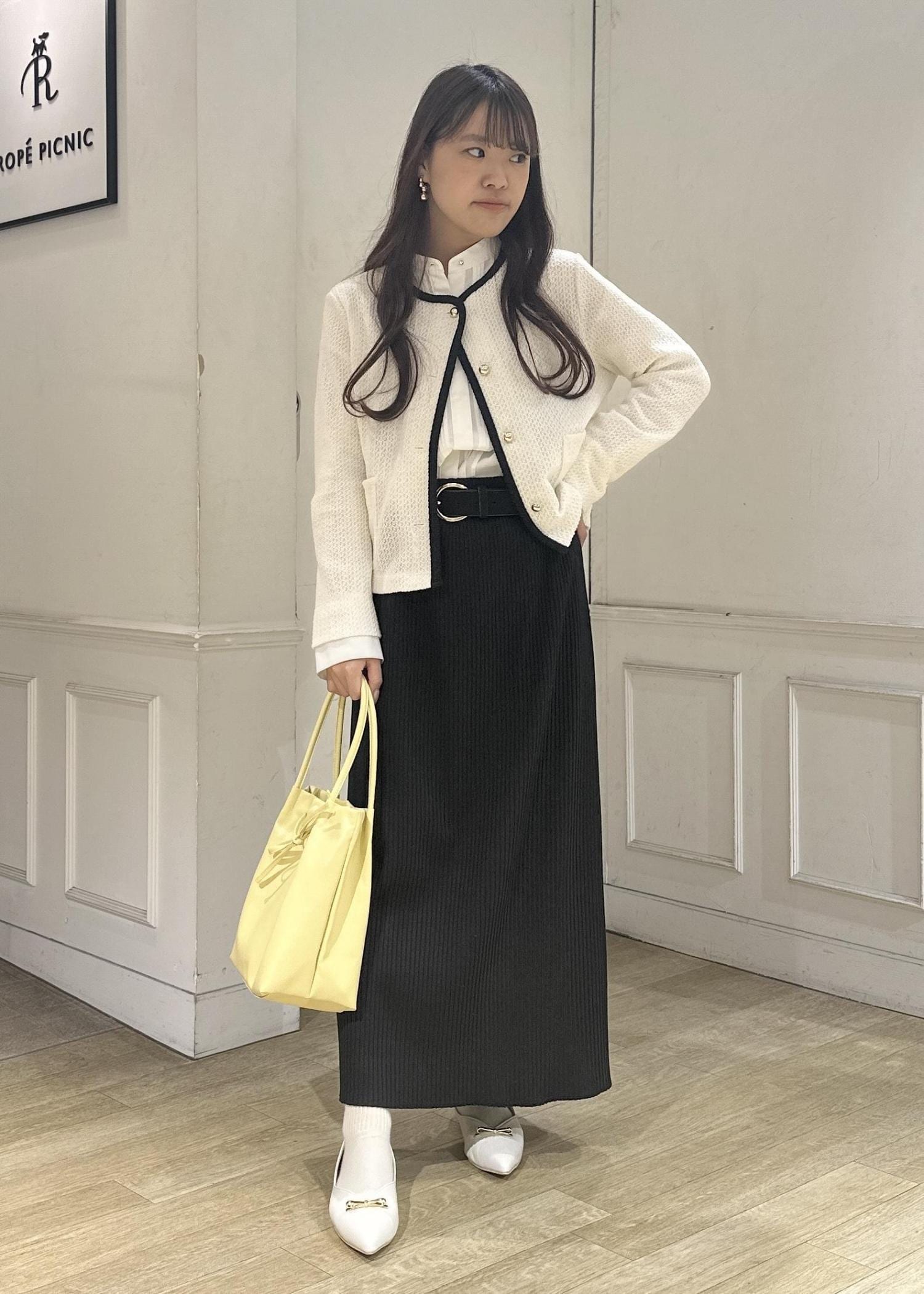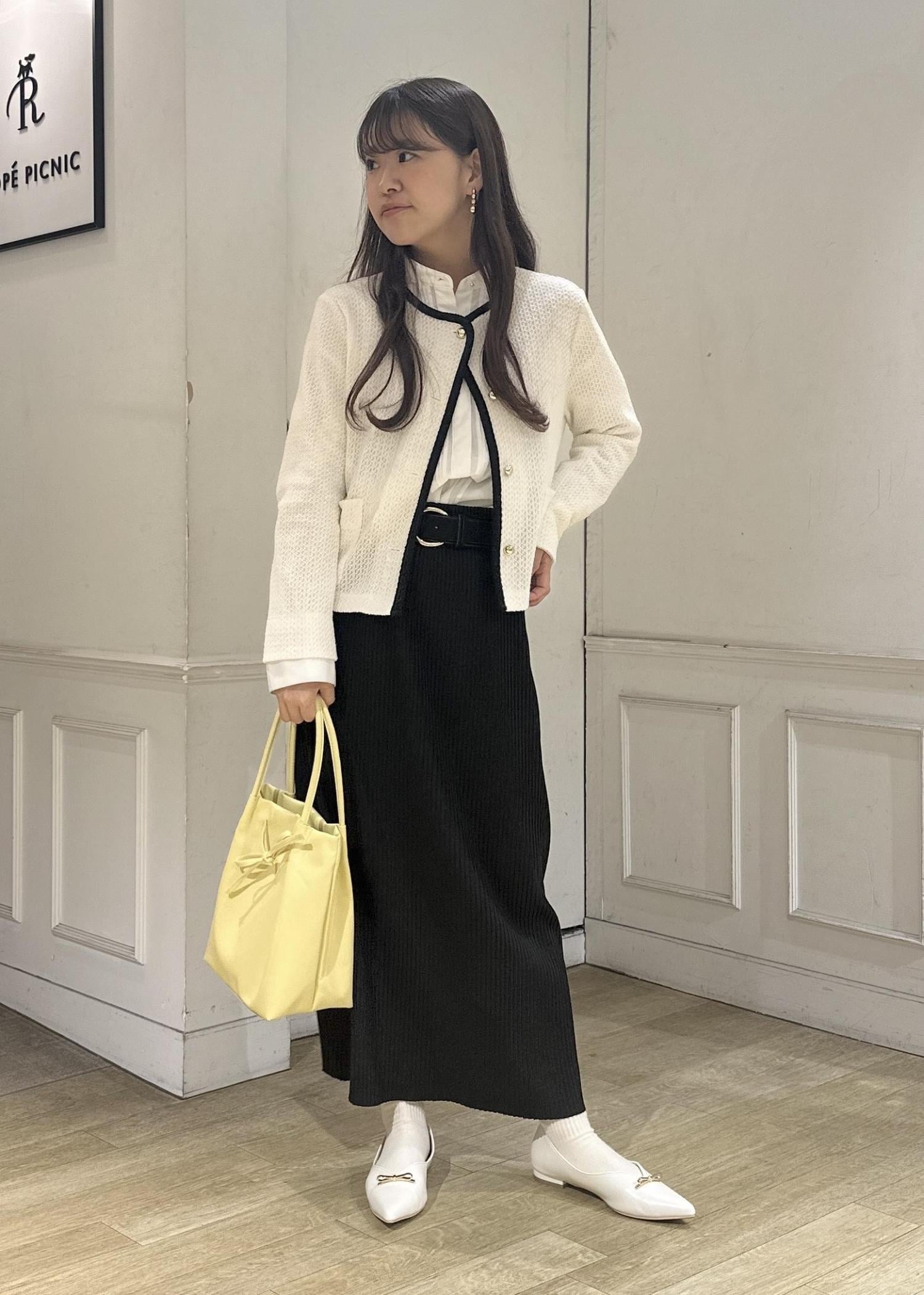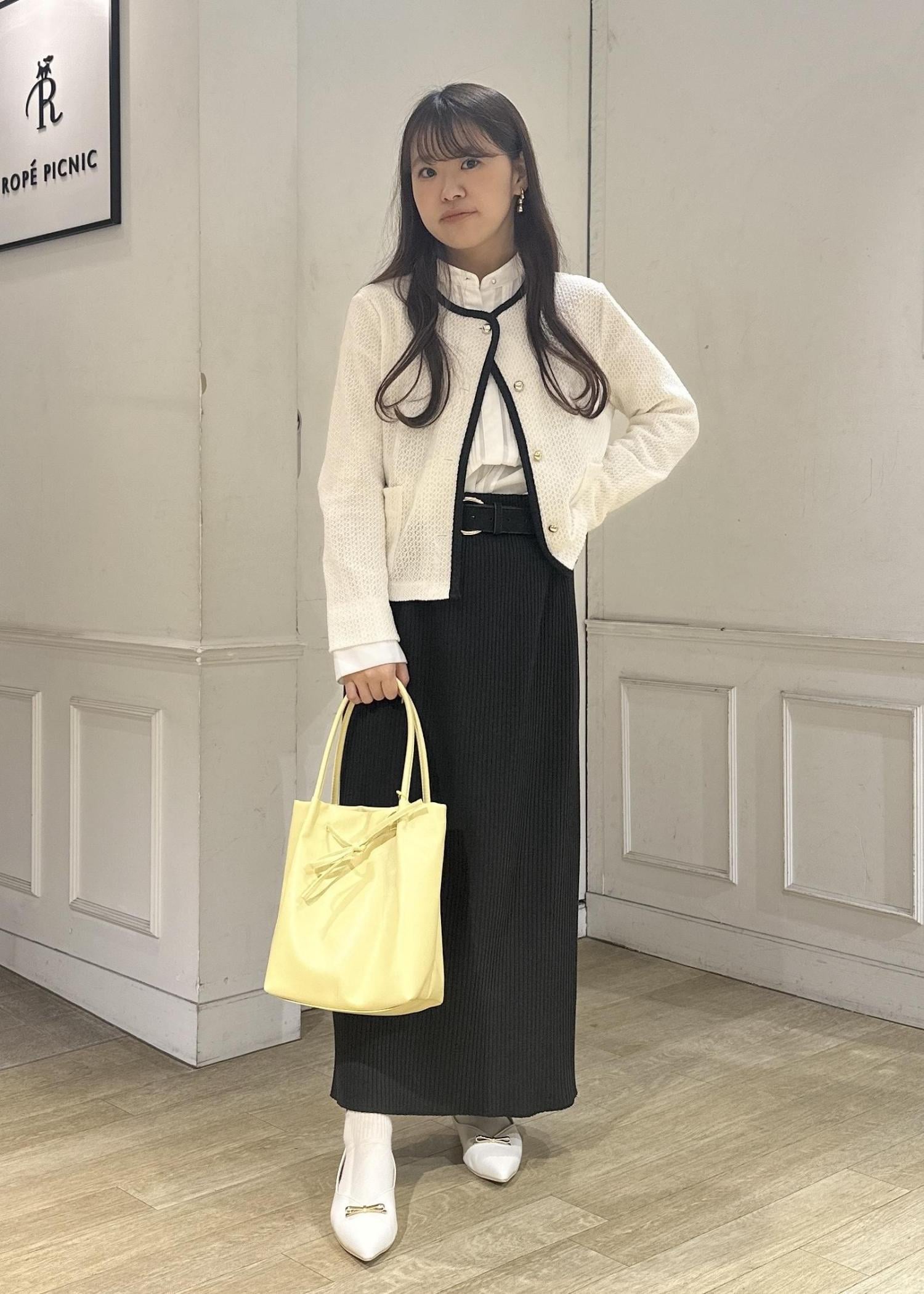 シンプルなコーデなのであえてバッグは春らしいイエローをチョイス。足元はリボンパンプスを合わせガーリーに。