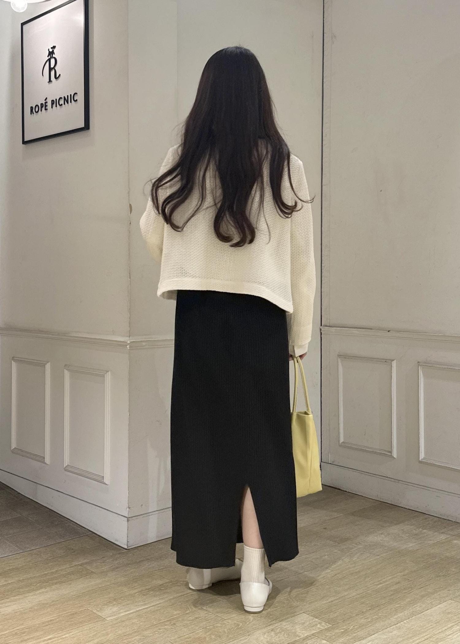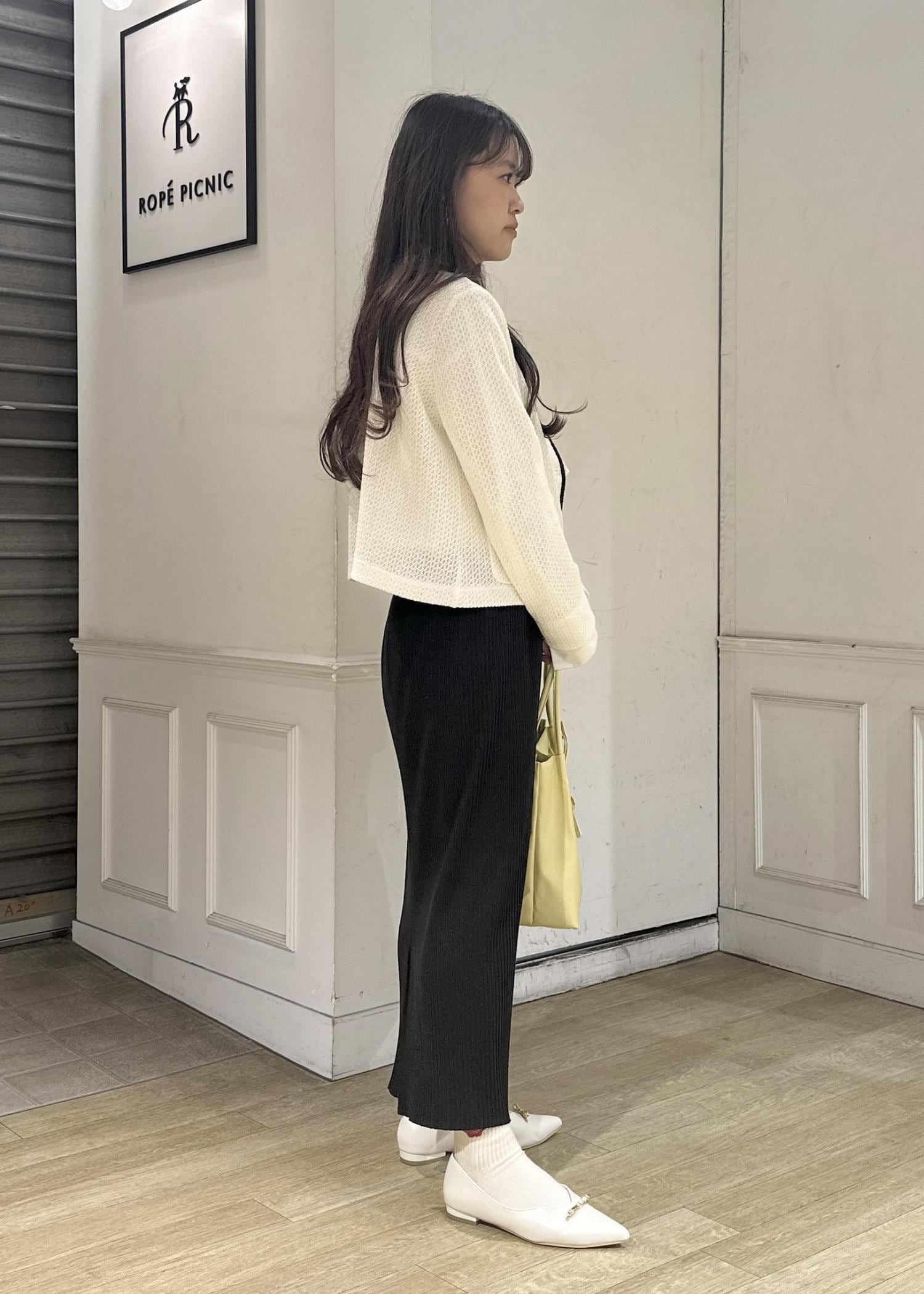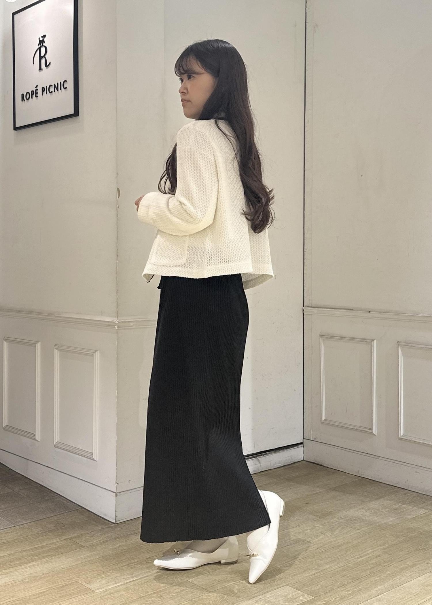 いつも基本Sサイズ着用ですが、細身のスカートなのでMサイズで着用しています。リブがしっかり入っているので長時間座っていてもリブが平らになることはないです! -