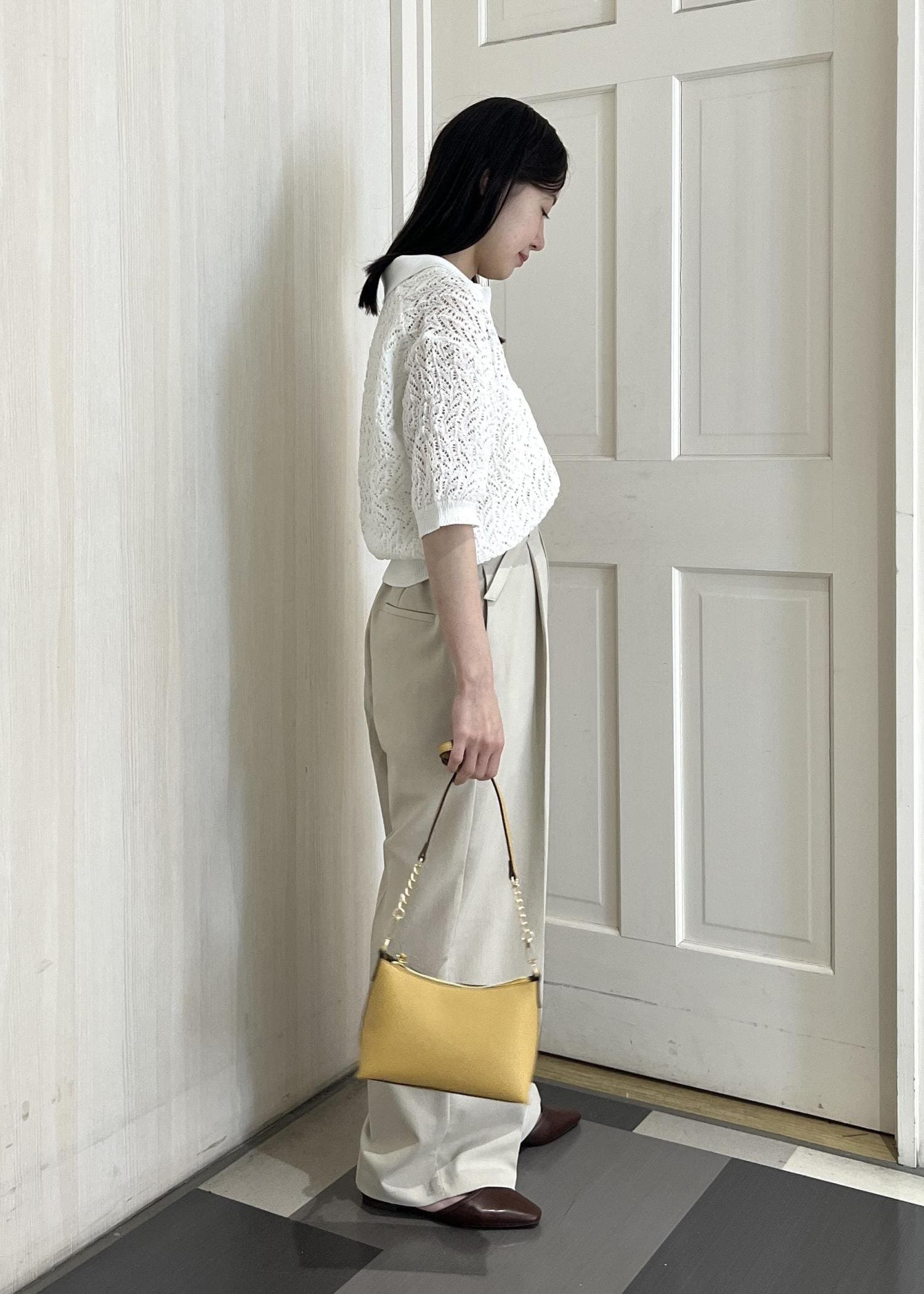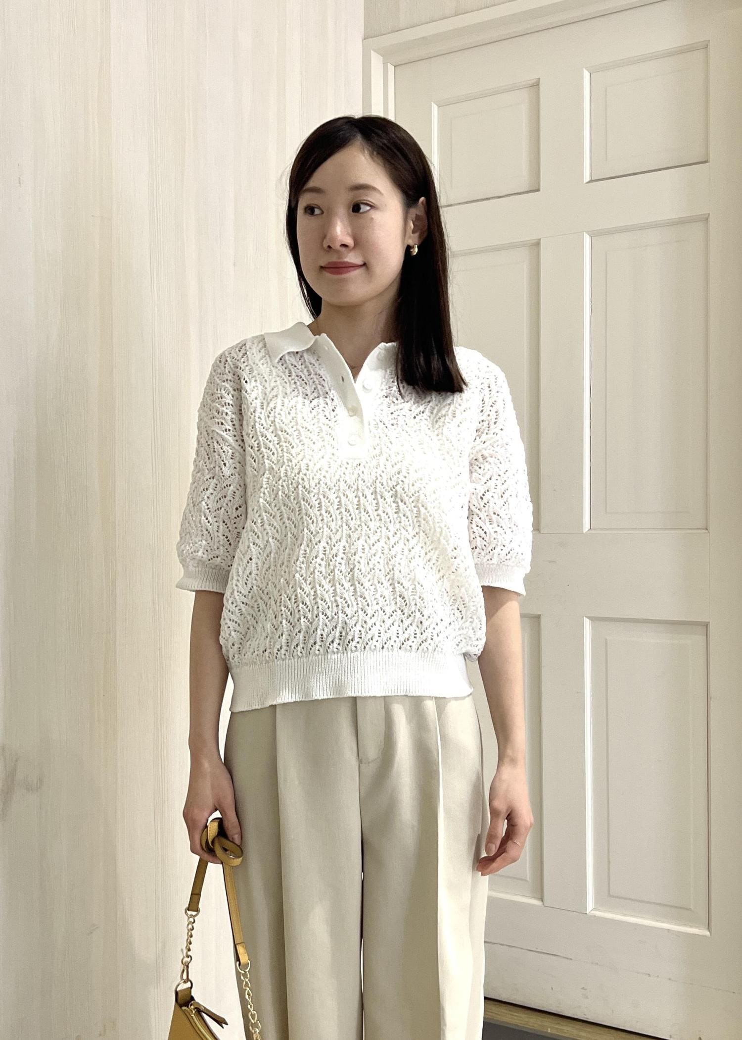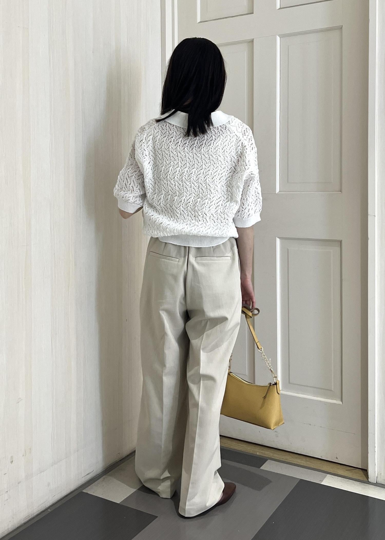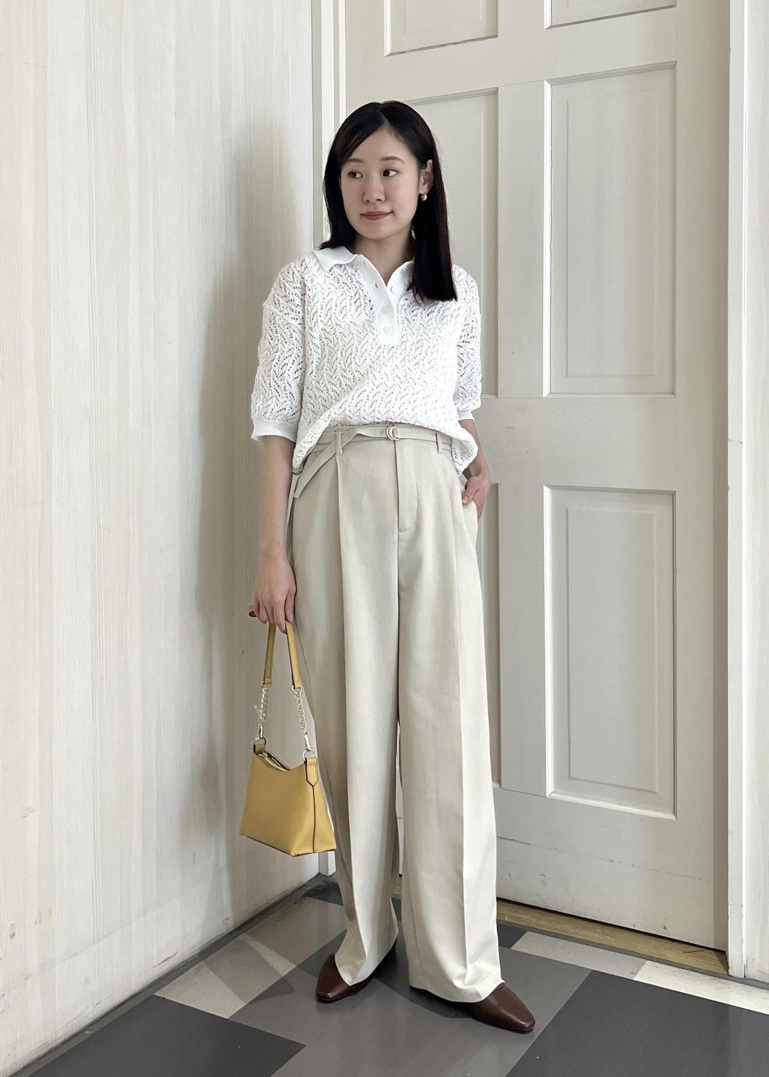 ホワイトのニットポロとベージュのパンツでワントーンコーデに。