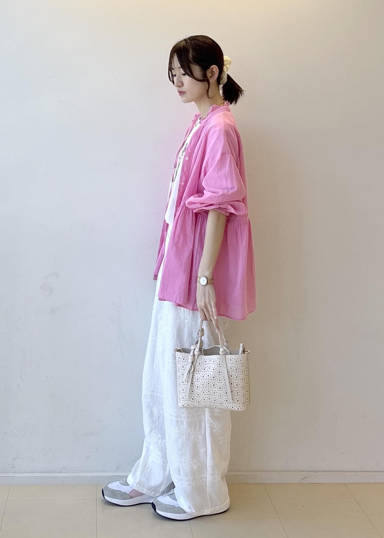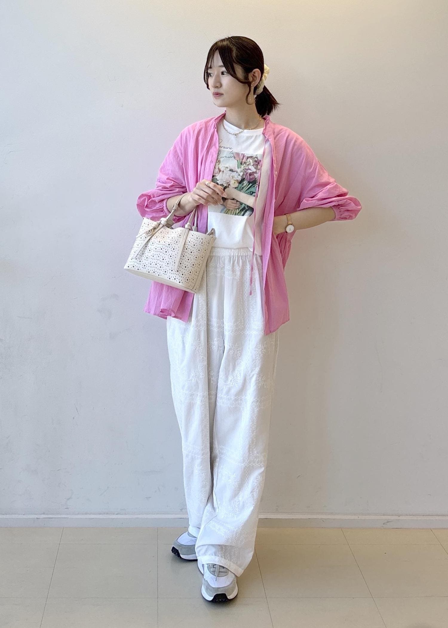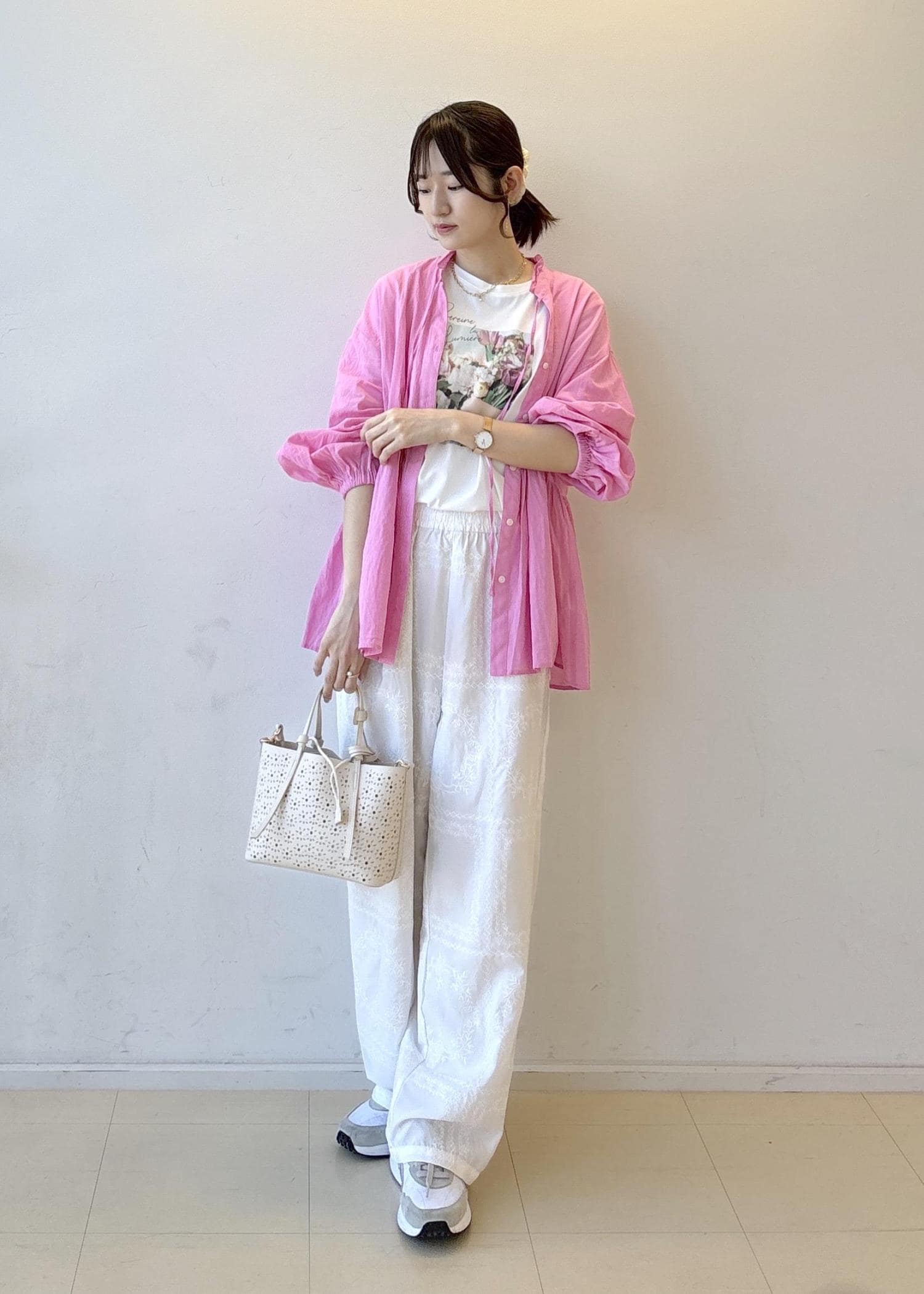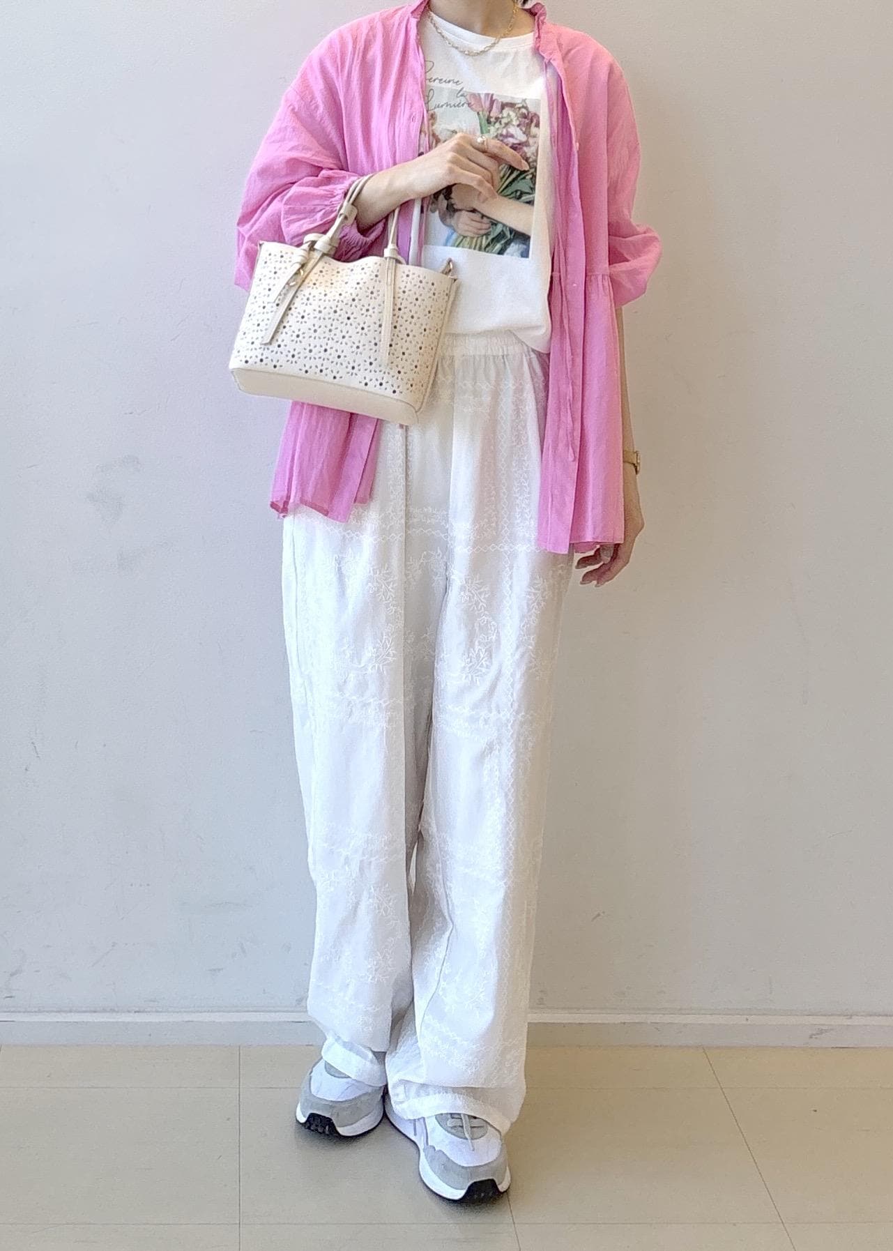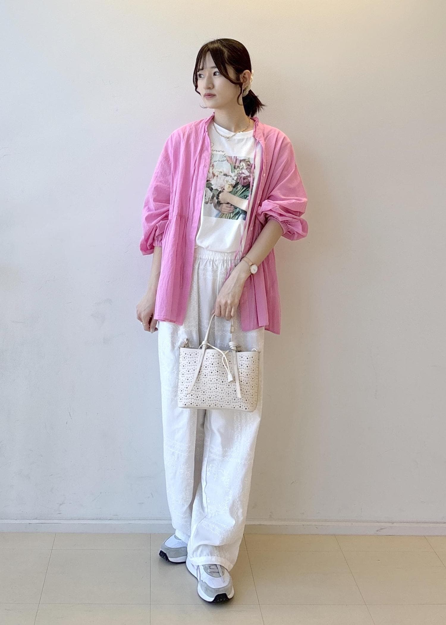 ピンクとプリントTのカラーの組み合わせがポイントです!