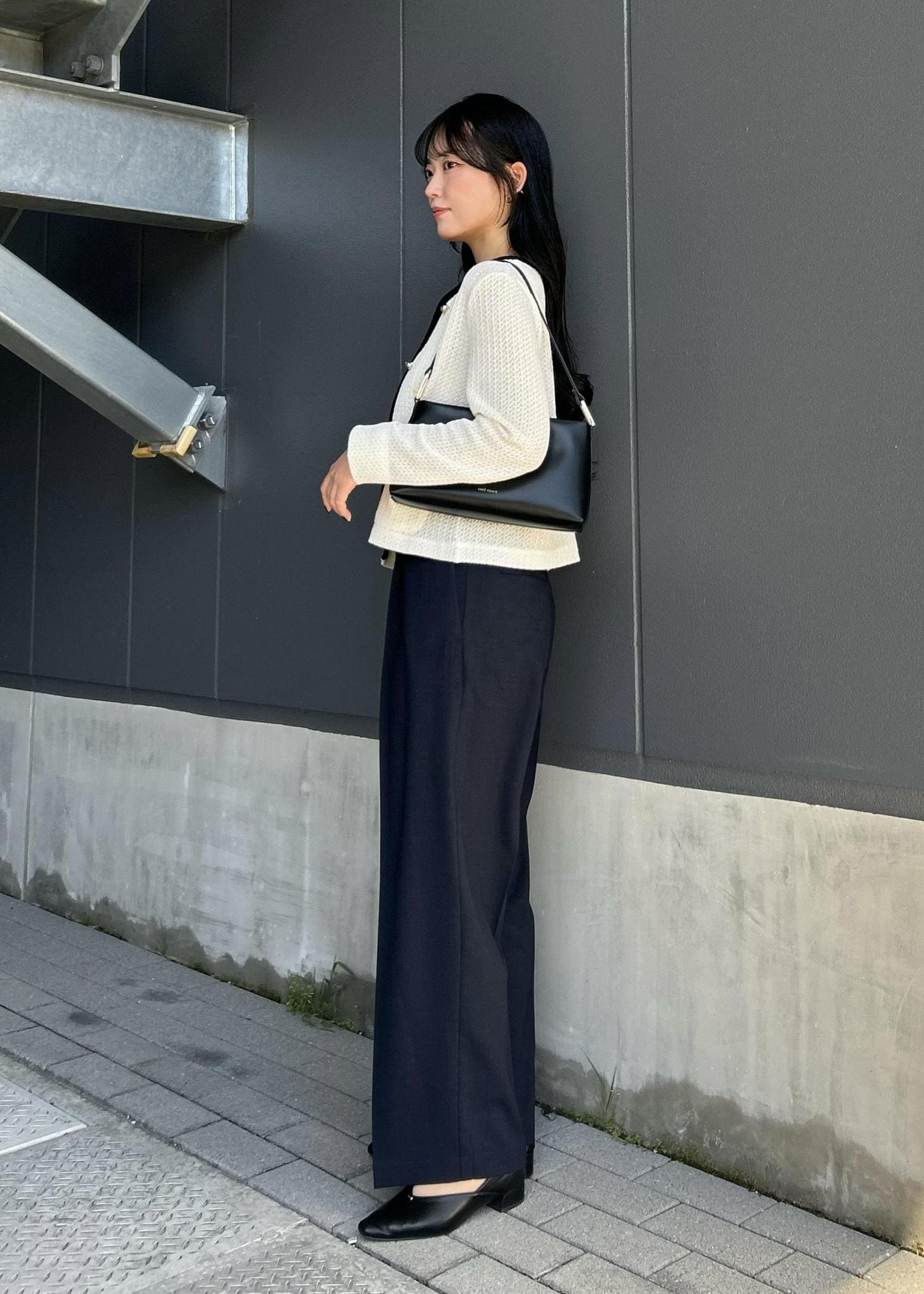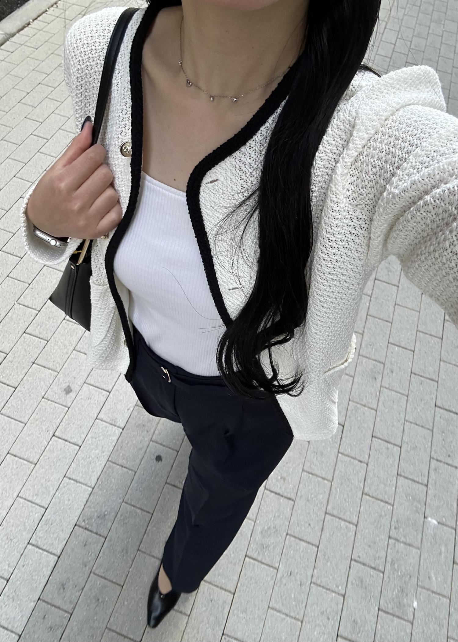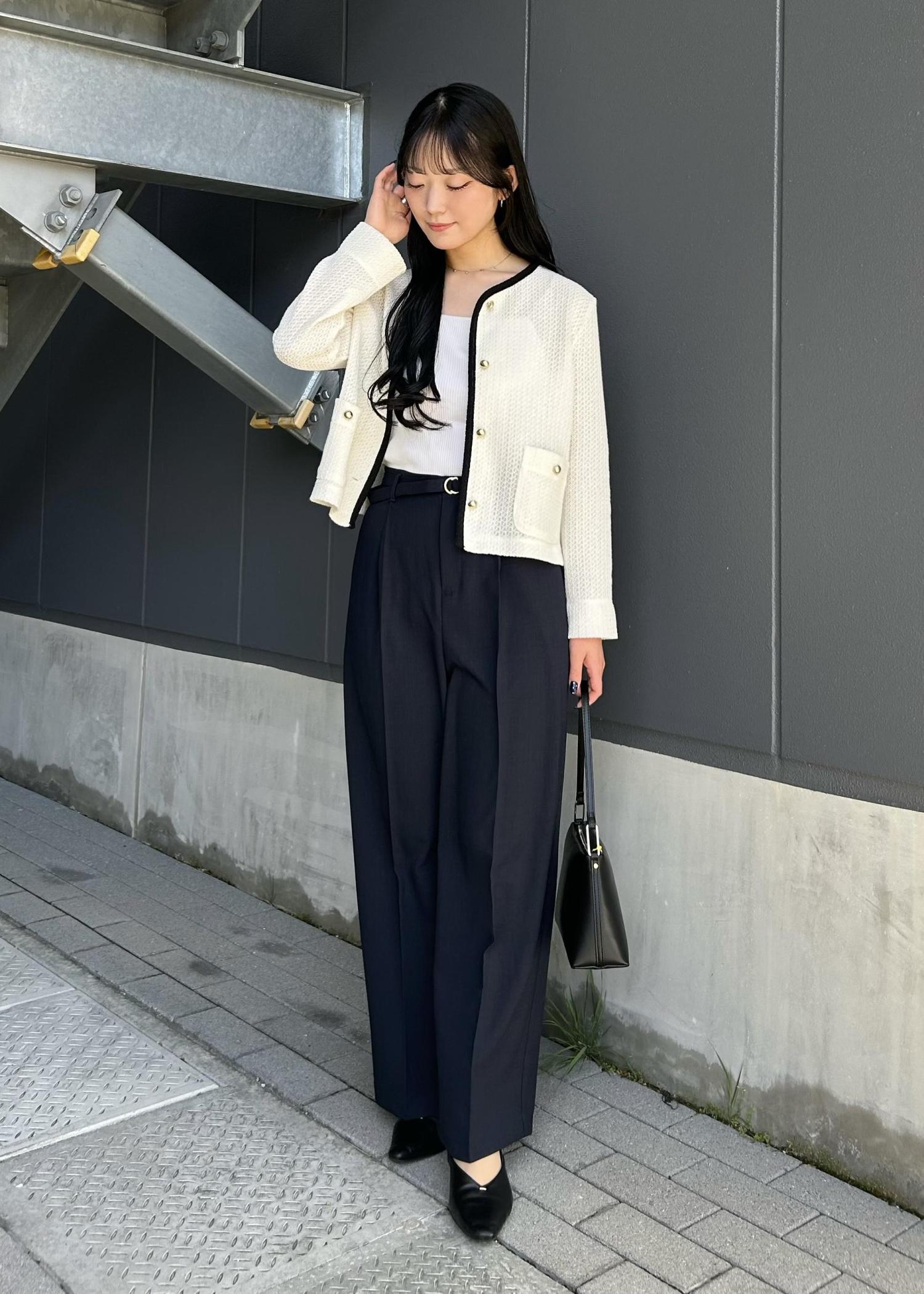 コンパクトなホワイトカーデを主役に、インナーも白で揃えてすっきり見えるようにしました。ワイドパンツでバランスを取って、全体は黒小物で引き締めています。