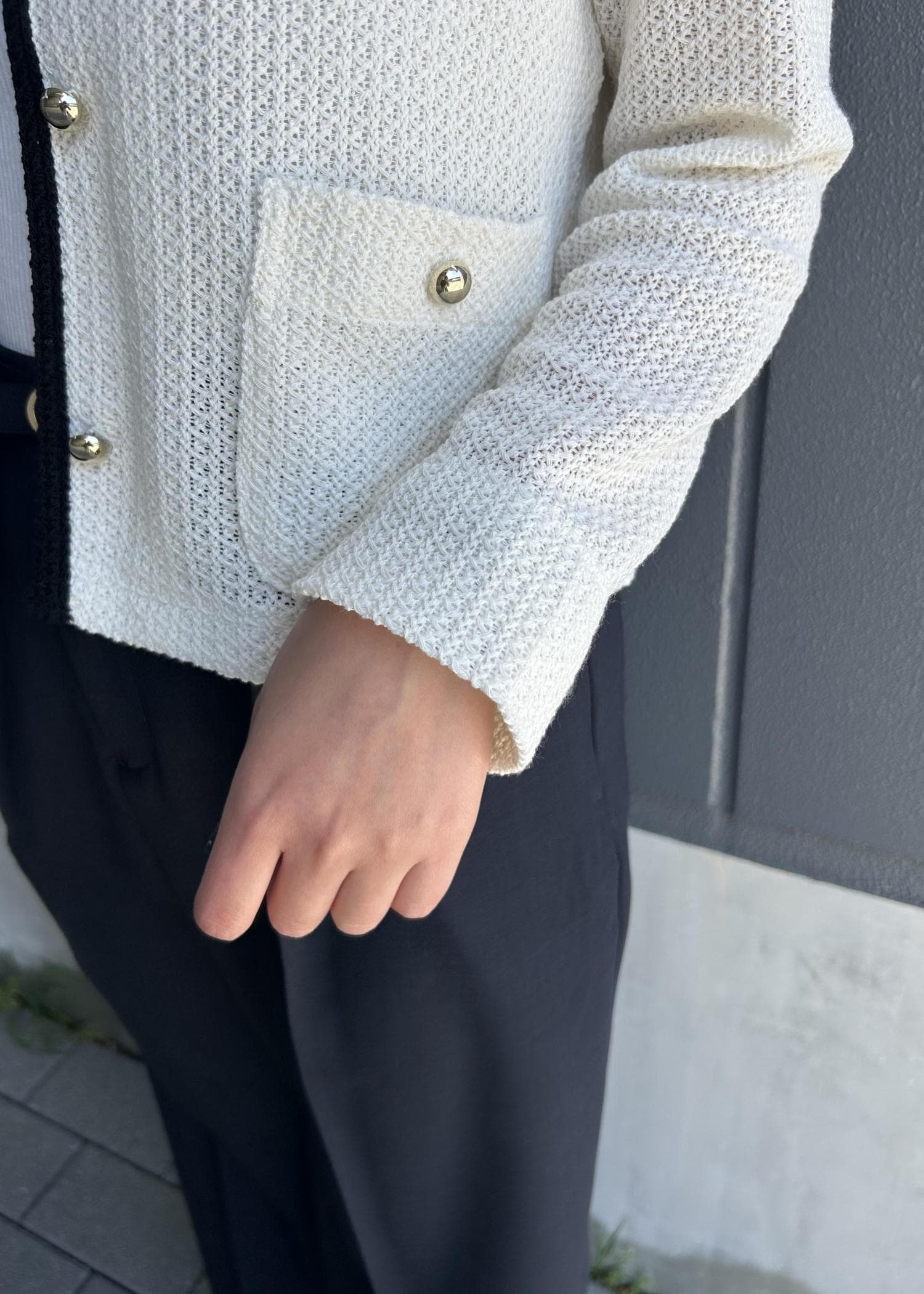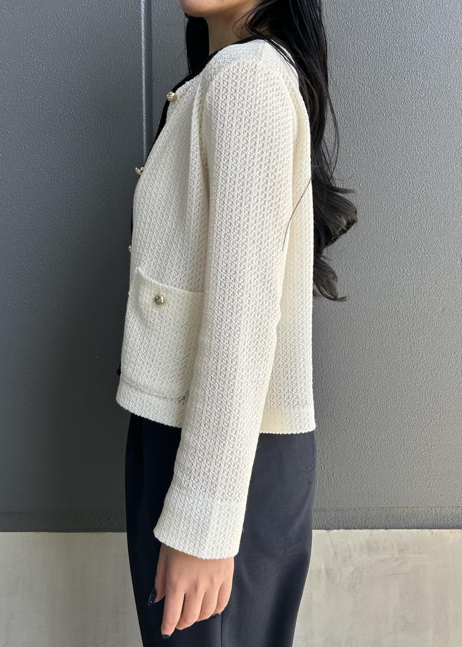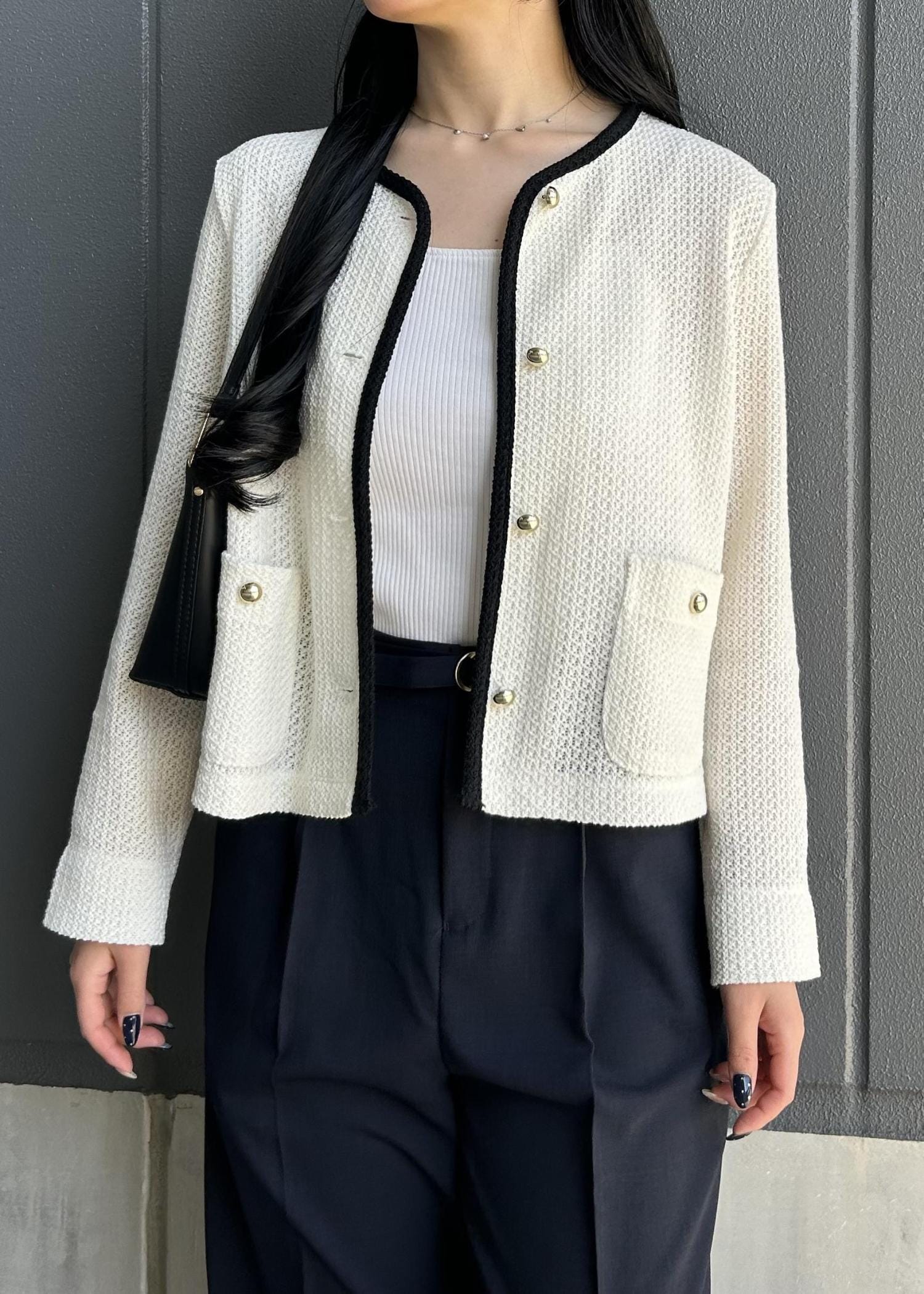 コンパクトなホワイトカーデを主役に、インナーも白で揃えてすっきり見えるようにしました。ワイドパンツでバランスを取って、全体は黒小物で引き締めています。