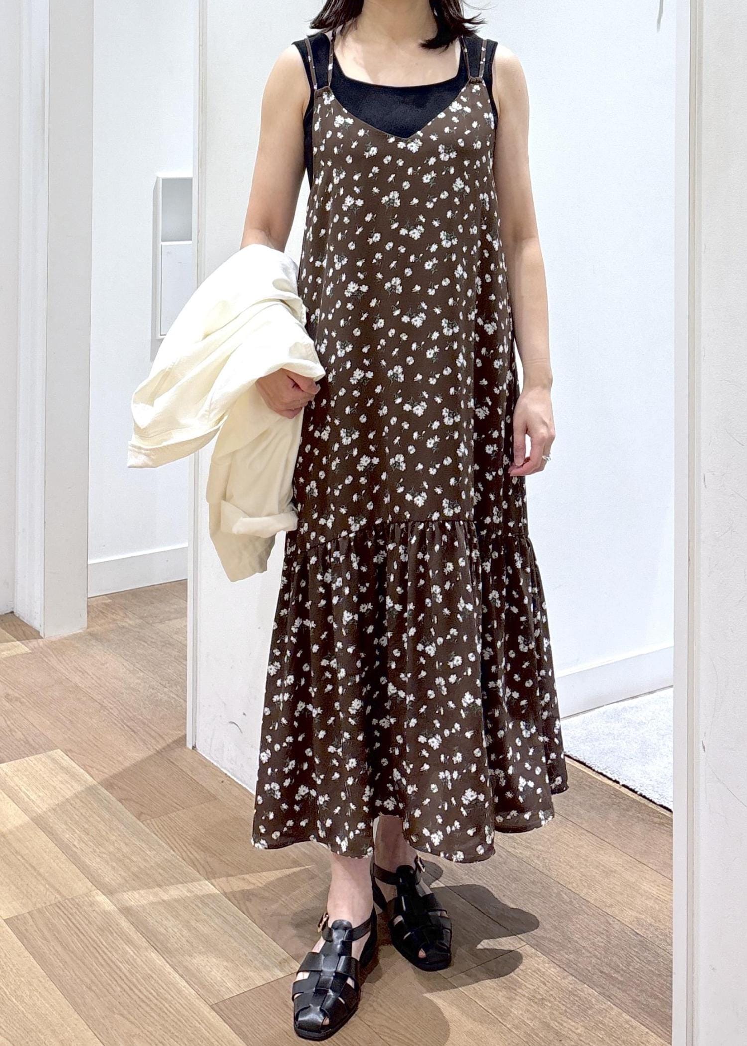 2BUY10%OFFROPÉ PICNIC花柄ティアードダブルストラップキャミワンピースブラウン / F¥6,490レビュー裾のフリルが映えるすっきりとしたシルエットです。肩紐の結ぶ位置で着丈も調節できるので、身長問わず着用していただけます。