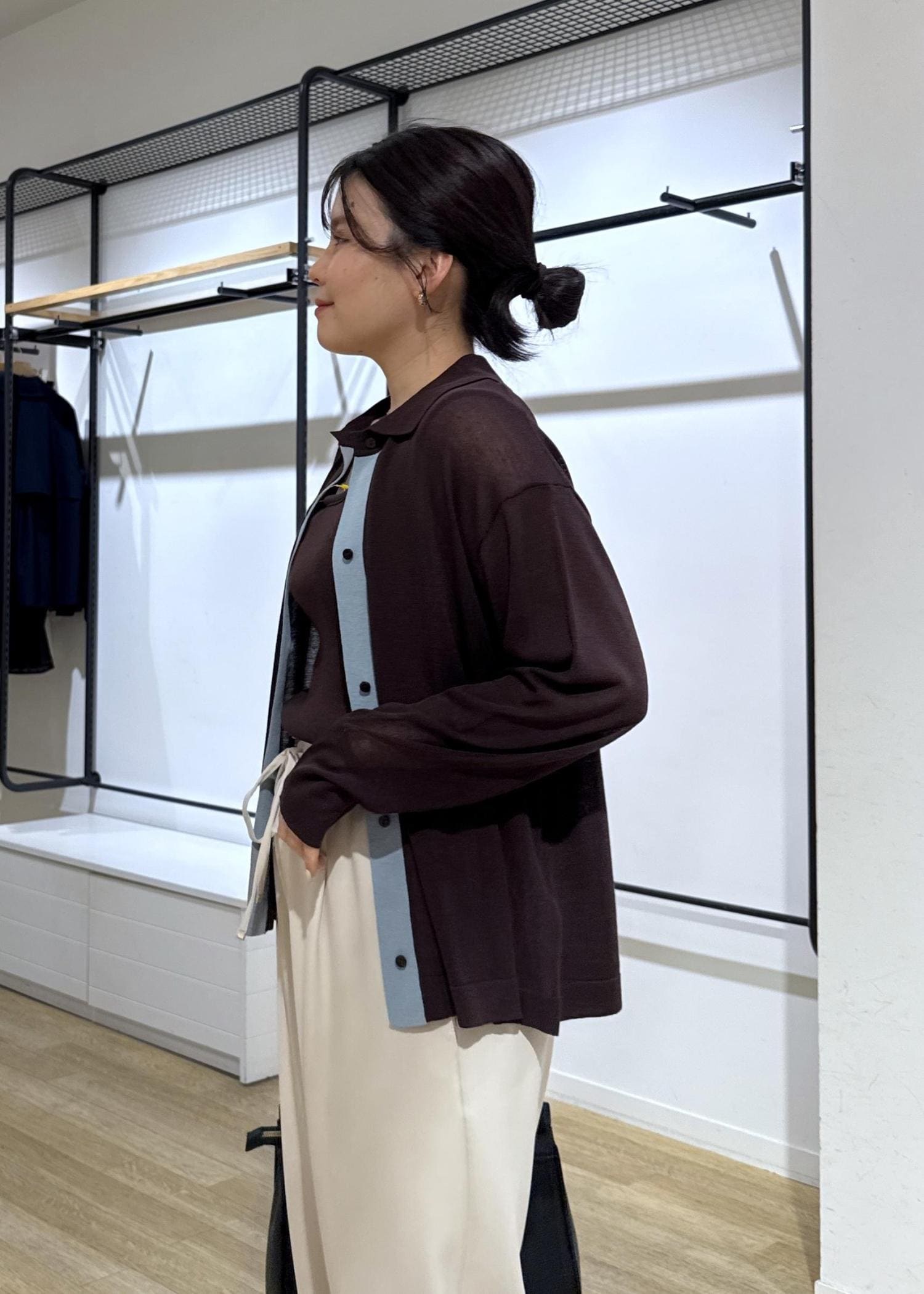 ブルーとブラウンの配色がトレンド感のあるポロニットカーディガンを主役にシンプルなパンツコーデにしてみました!