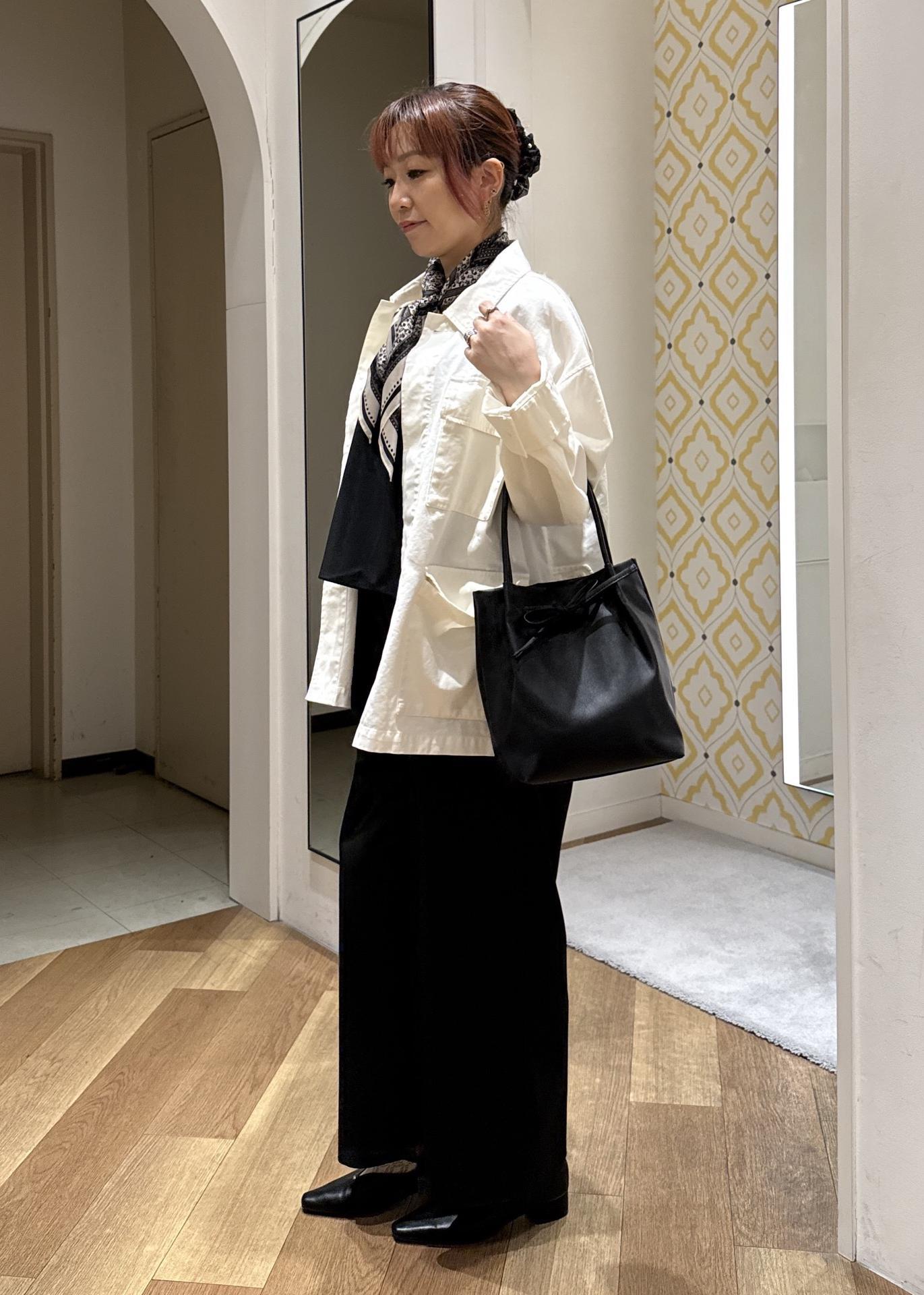スカーフで首元にアクセントをプラスして華やかさも忘れず。