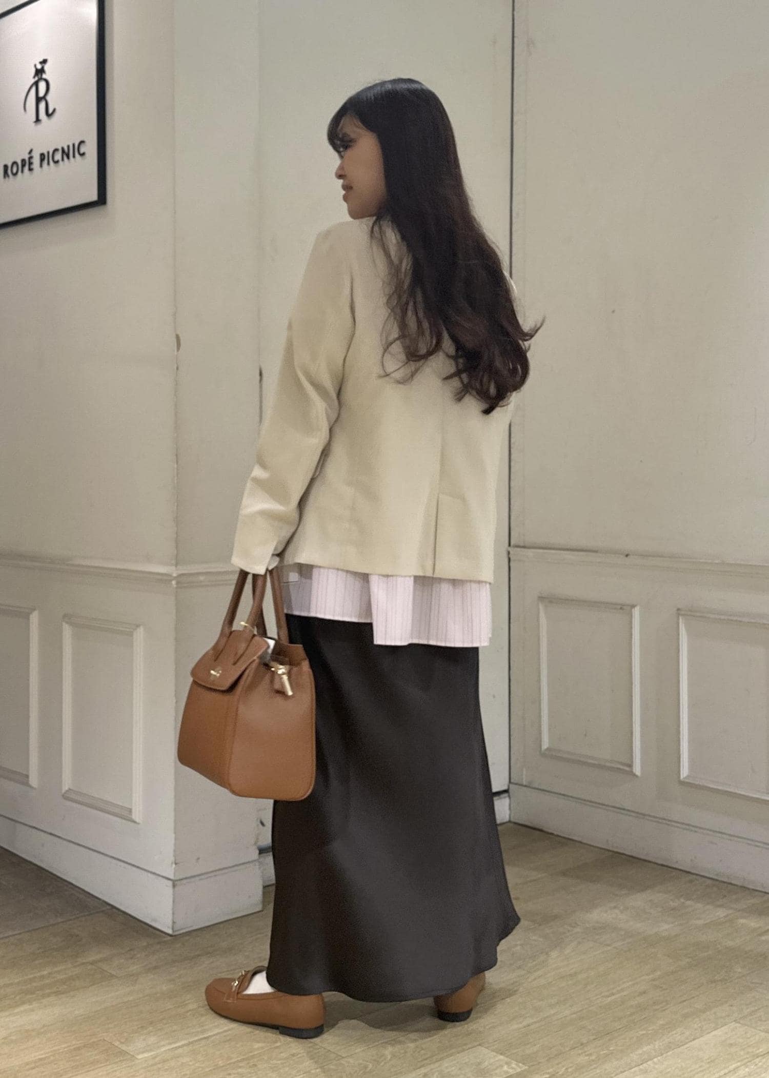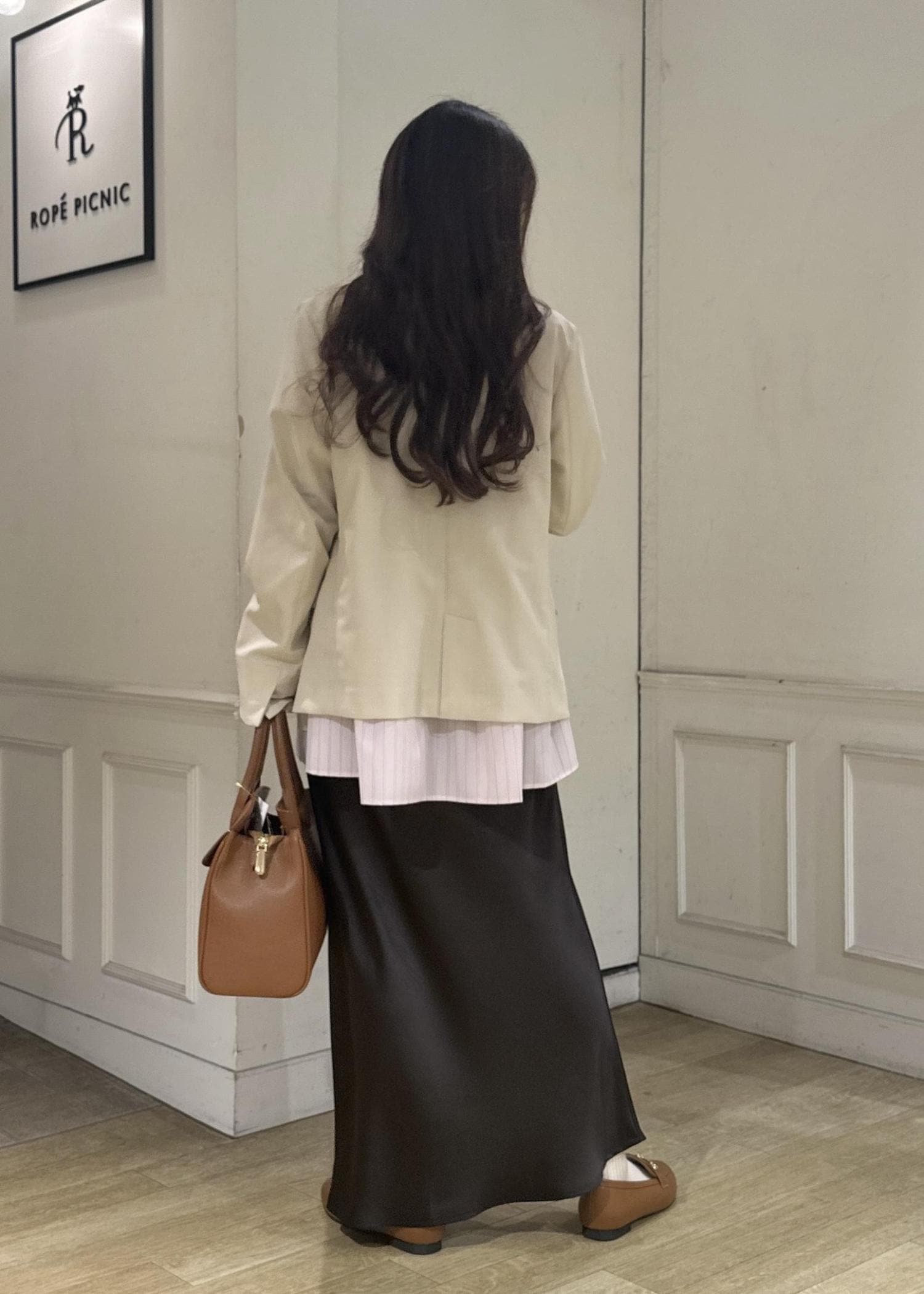 2BUY10%OFFROPÉ PICNIC細見えバイアスサテンスカート/イージーケアダークブラウン / F¥6,490レビューウエストゴムのサテンスカート。サイズはフリーサイズです。