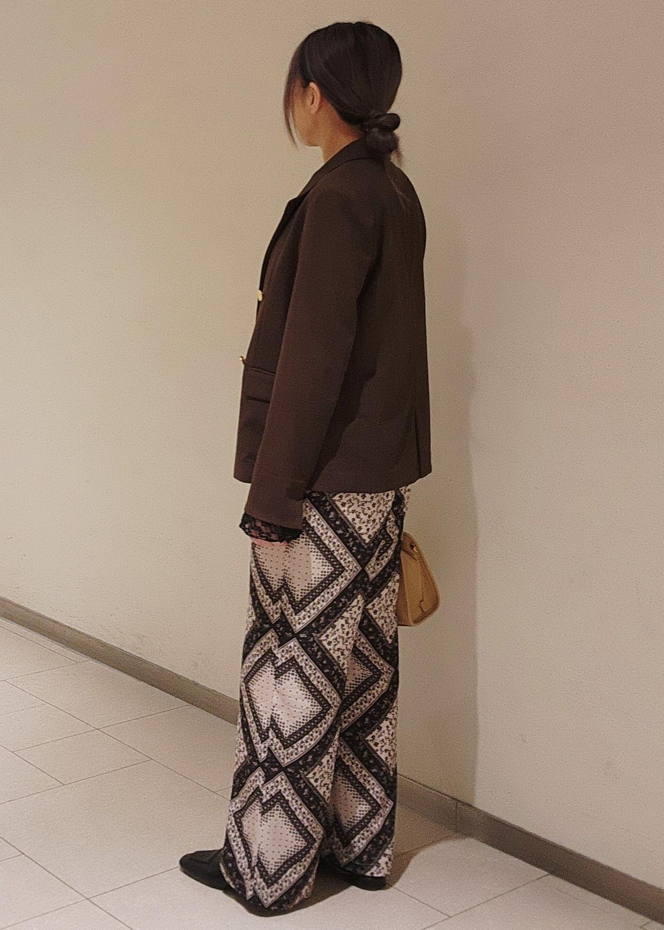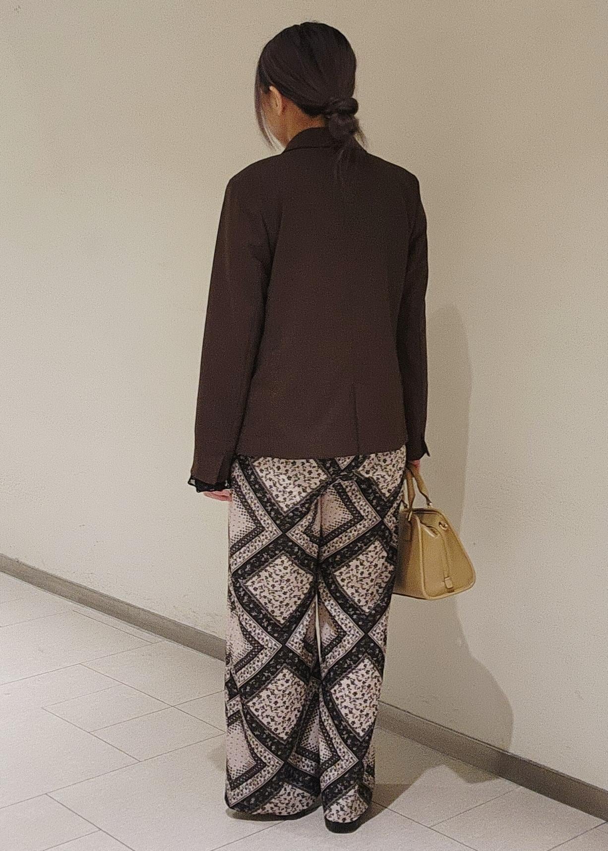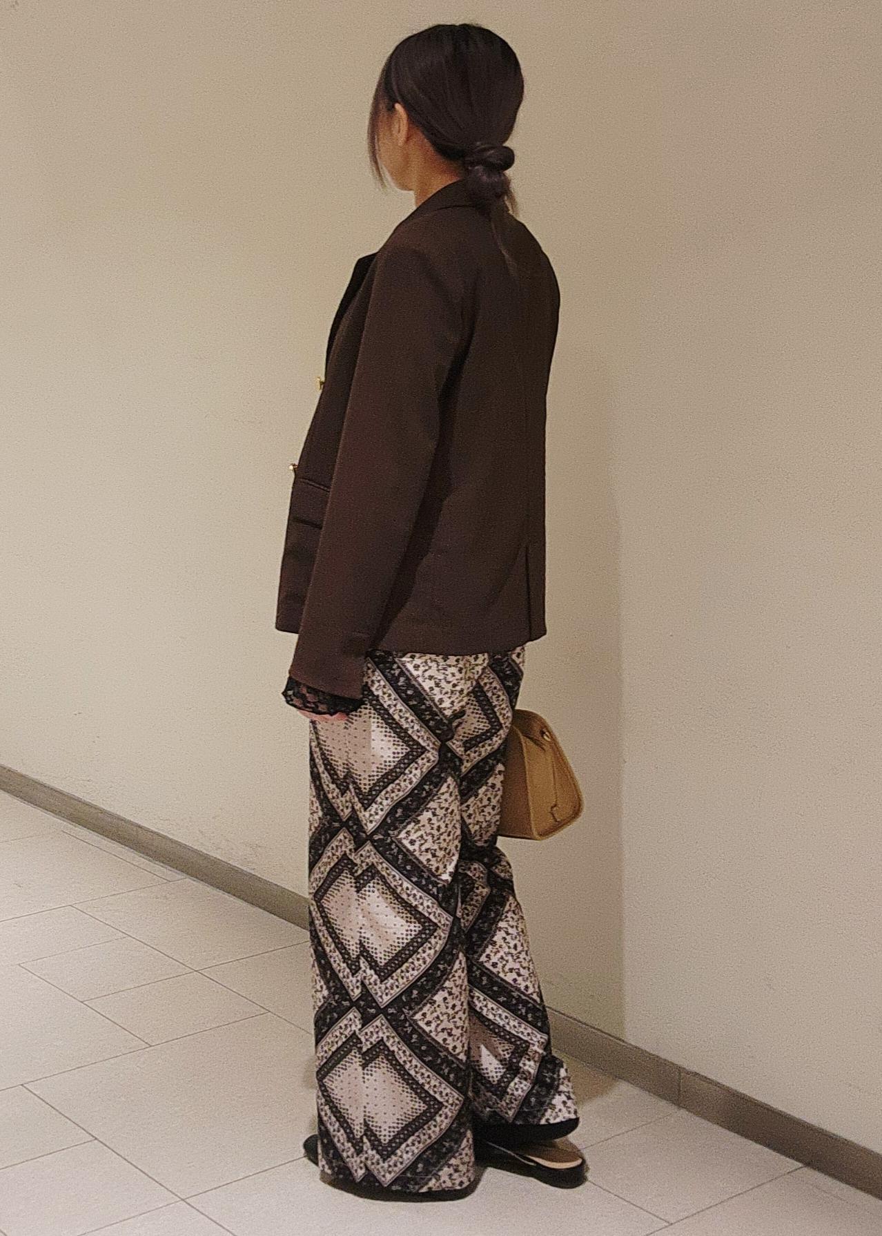 きちんと感のあるジャケットに、柄ボトムスでカジュアルダウンしリラックス感のある着こなしに。